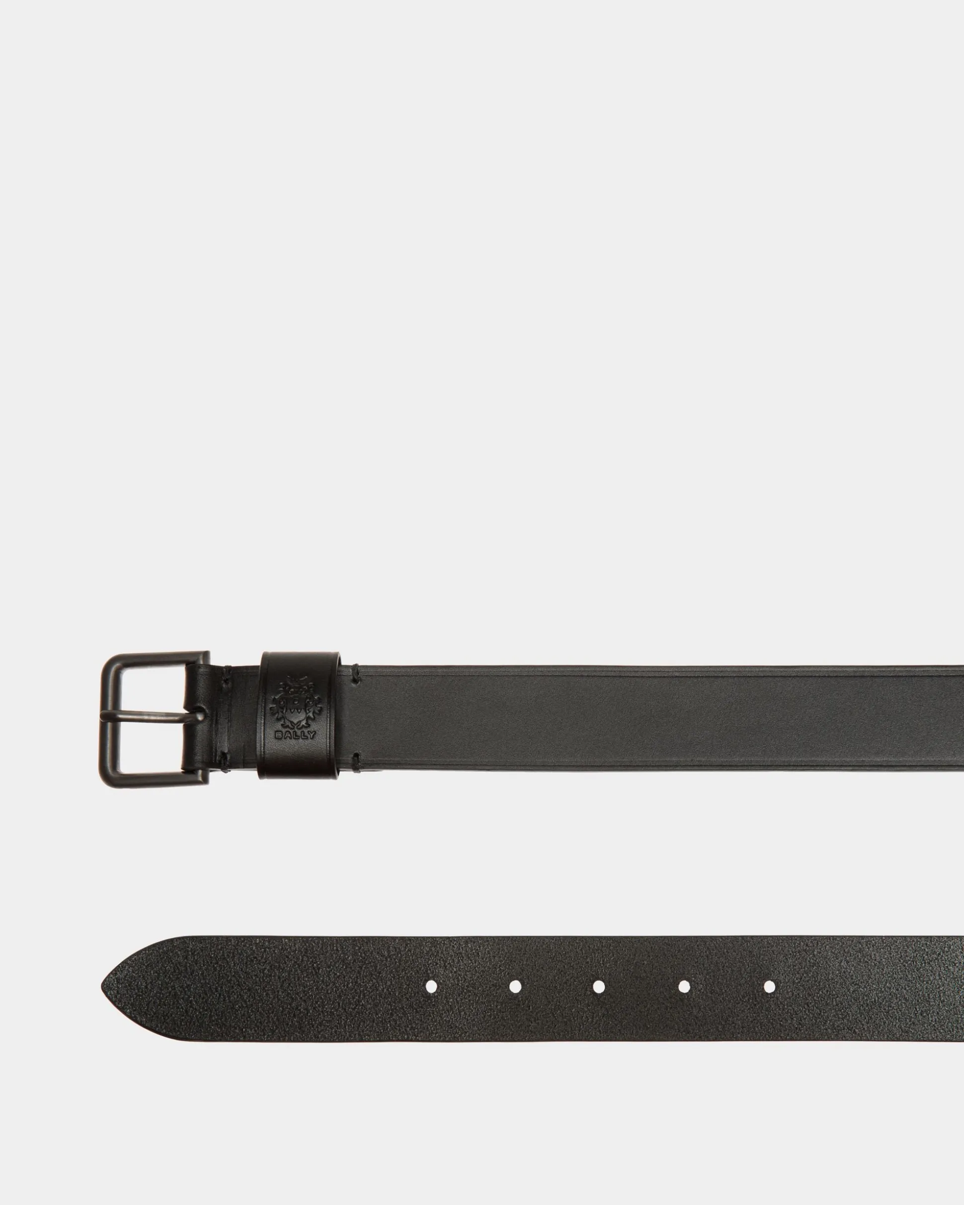 The belt from the Adrien Brody Travel Collection is crafted from black leather, with a Bally Crest stamped on the loop. The essential buckle is in antiqued palladium-hue metal for a utilitarian note.
