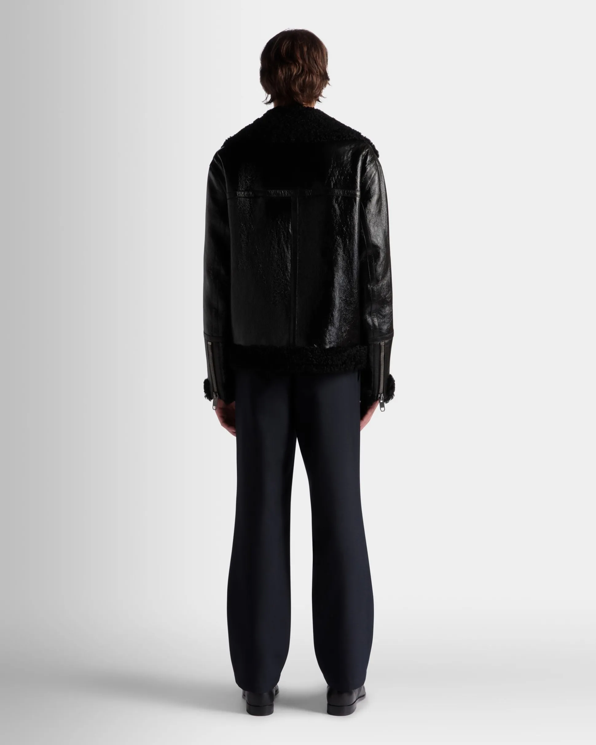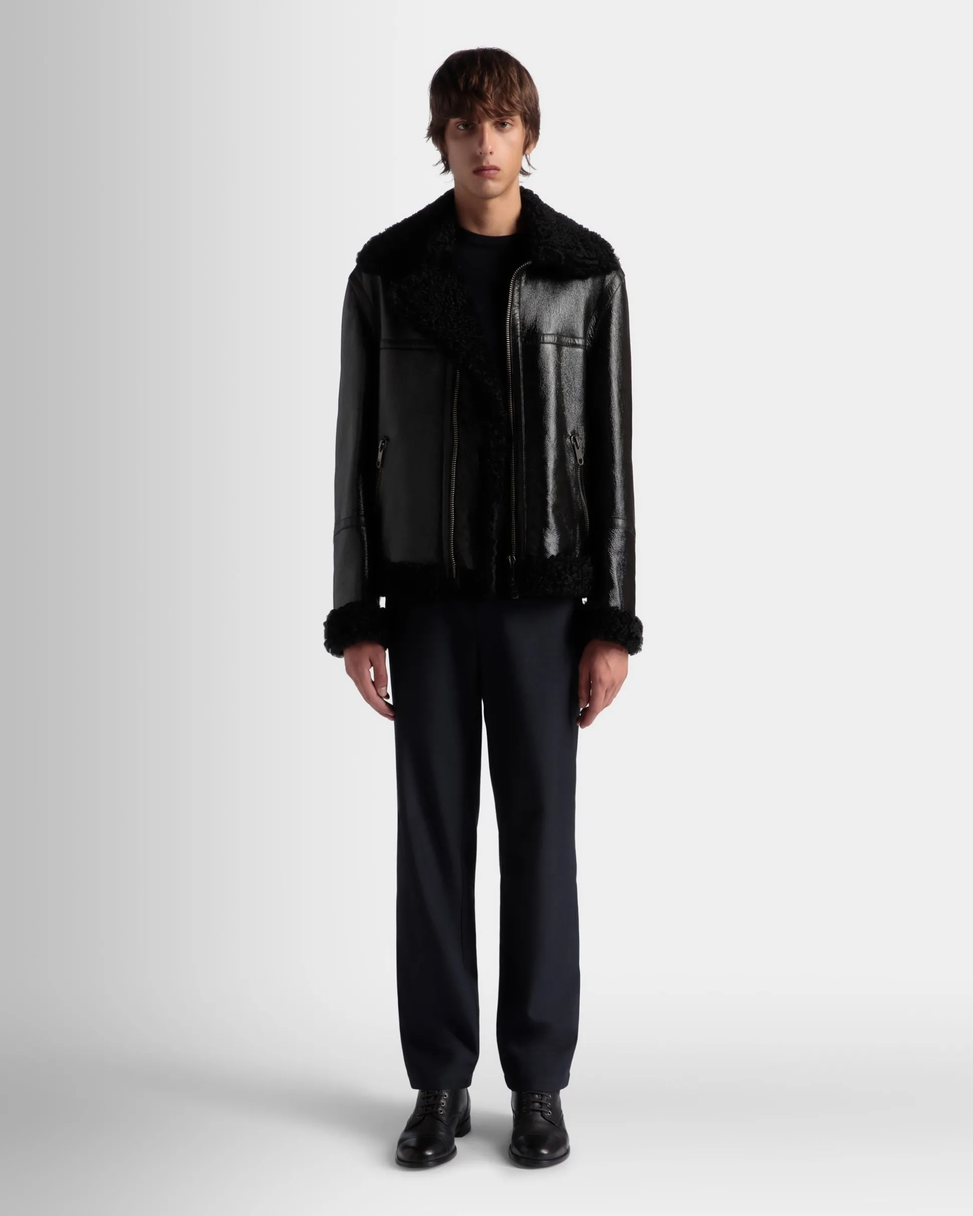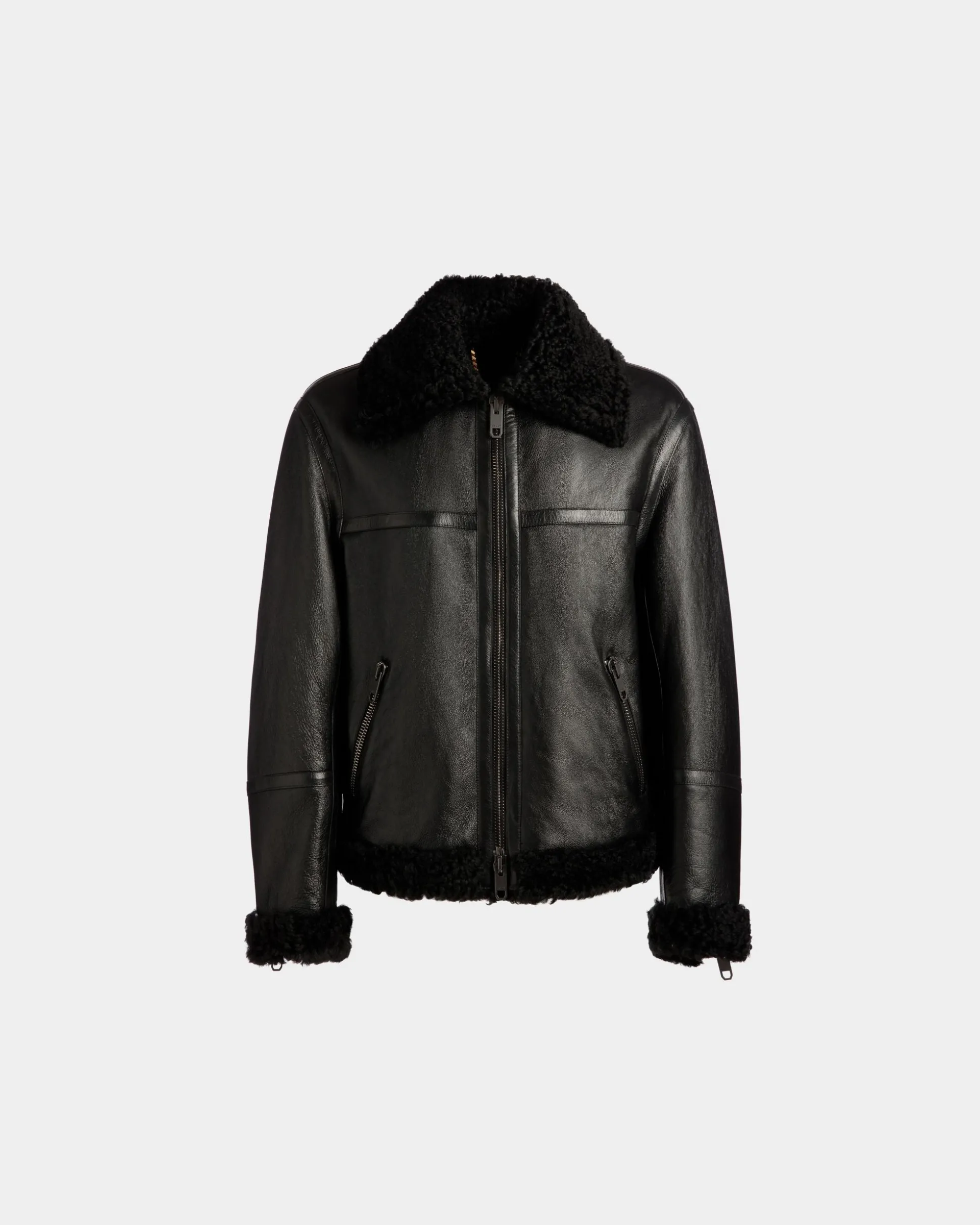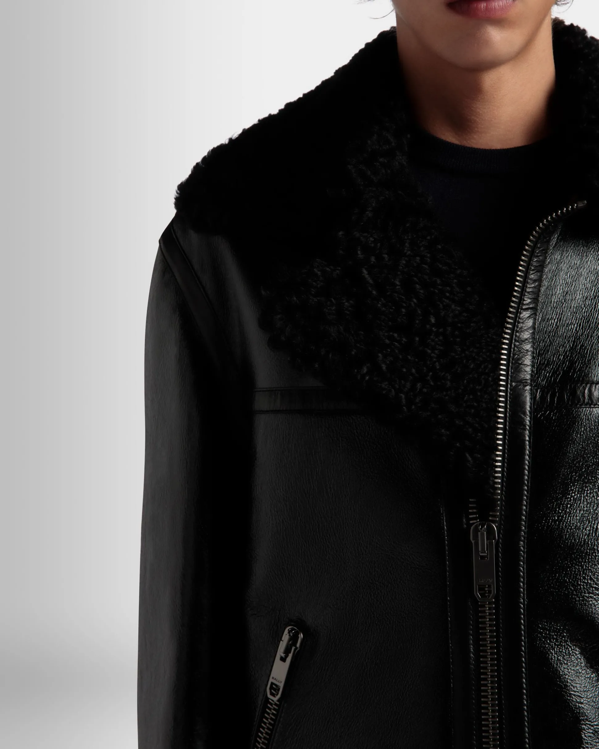 This black leather jacket from the Adrien Brody Travel Collection is trimmed in warm shearling and has ample pockets with metal zippers.