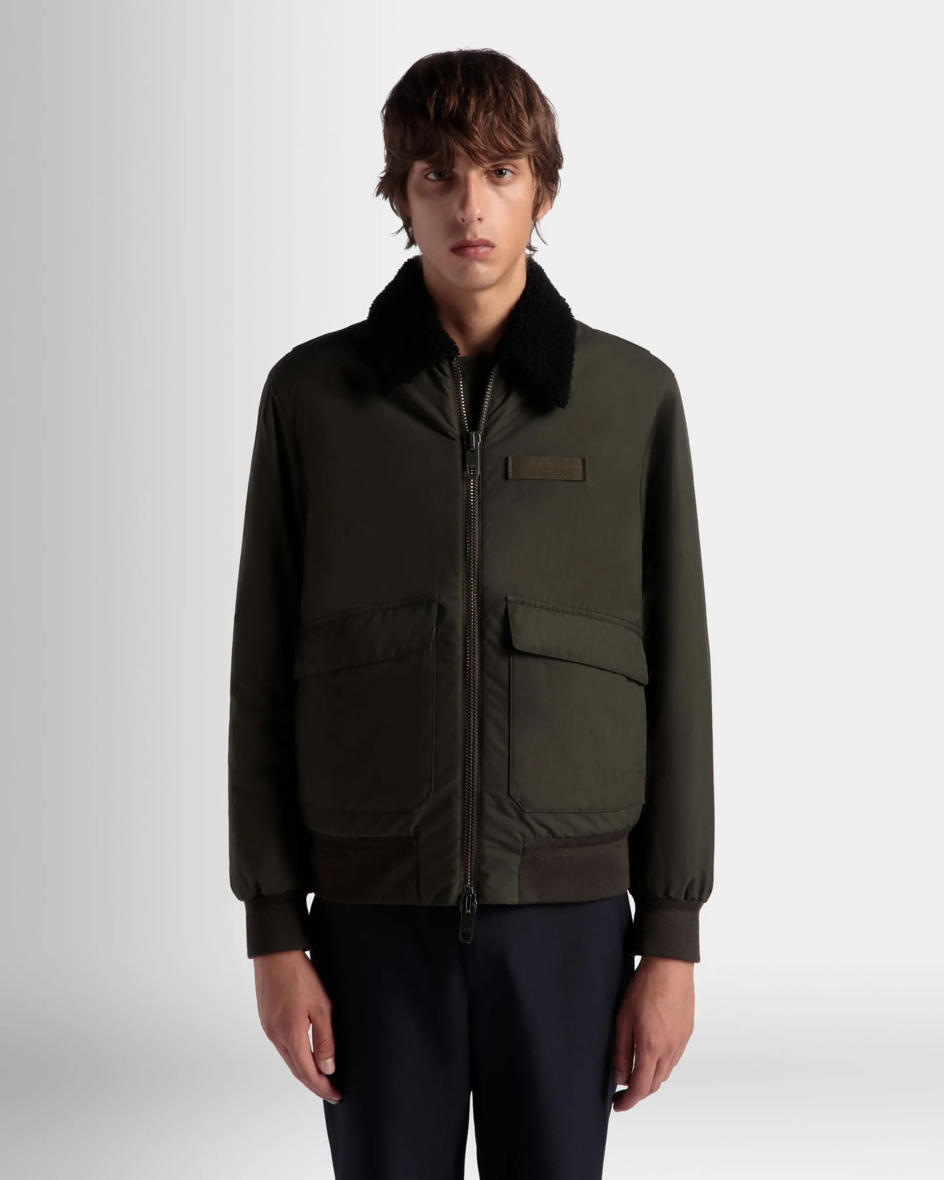 Adrien Brody has lent his discerning eye to the design of this jacket in olive green nylon cloth. Roomy patch pockets, a metal zipper and warm shearling on the collar attest to its travel-ready character.