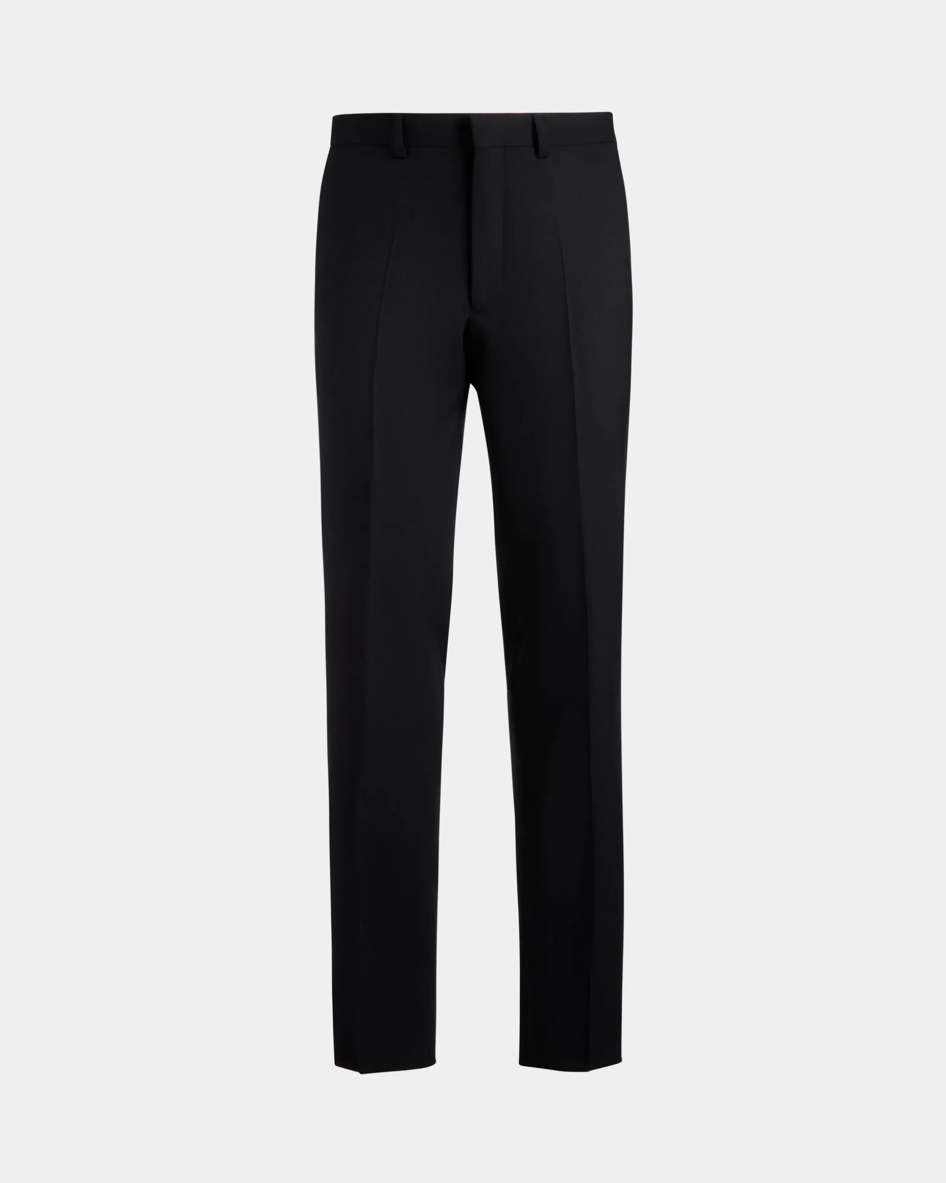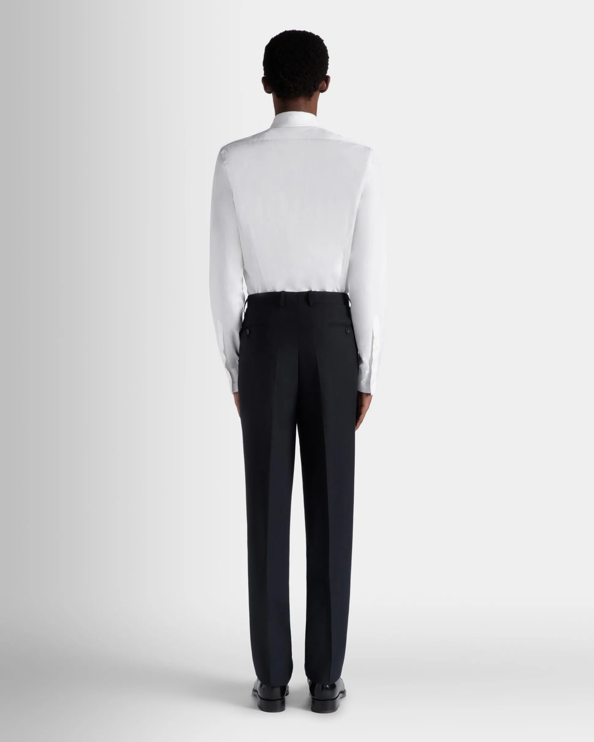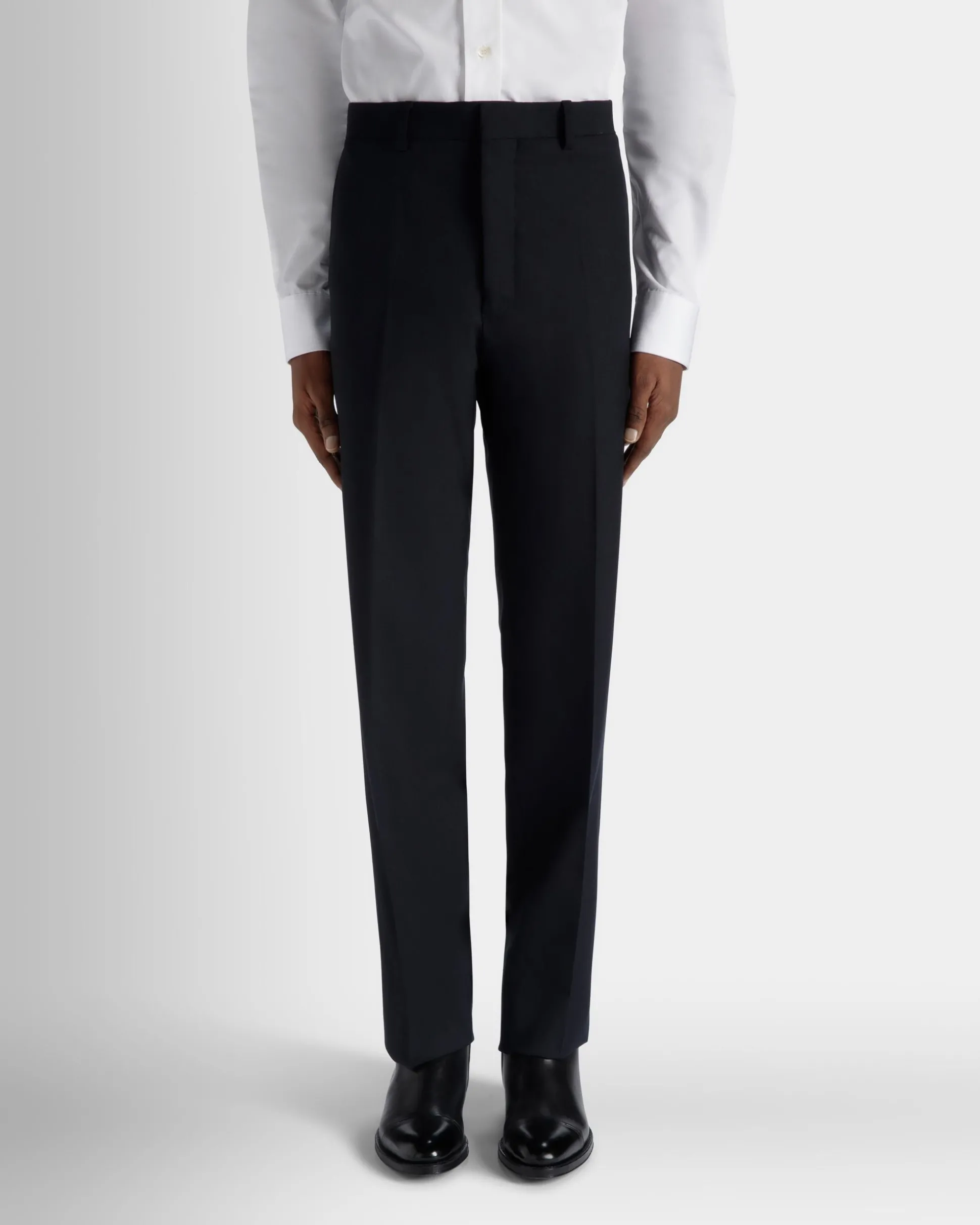 Pin-tucks which extend into central creases define these navy blue wool pants from the Adrien Brody Travel Collection. Double welt and button rear pockets and hip pockets guarantee their practical nature.