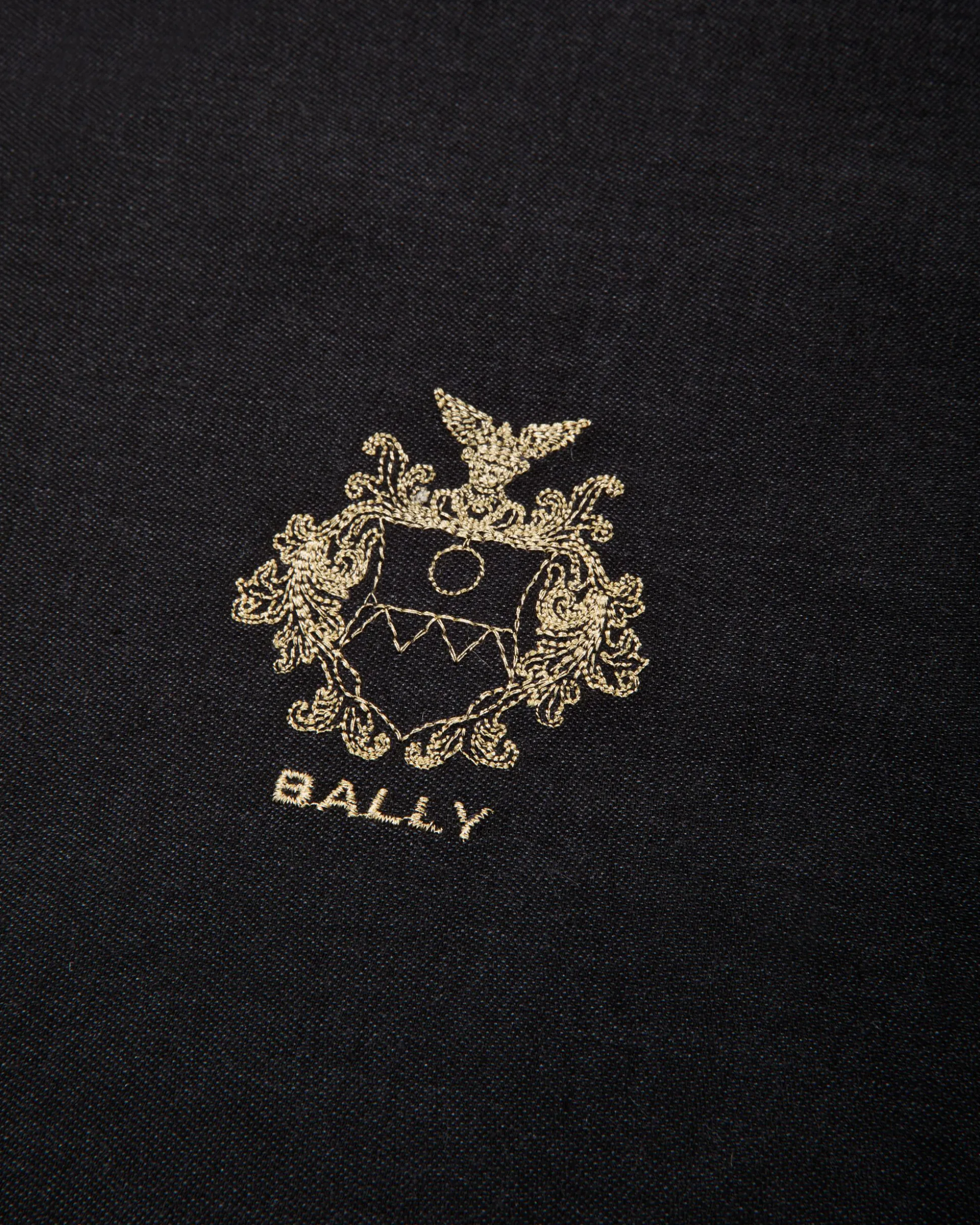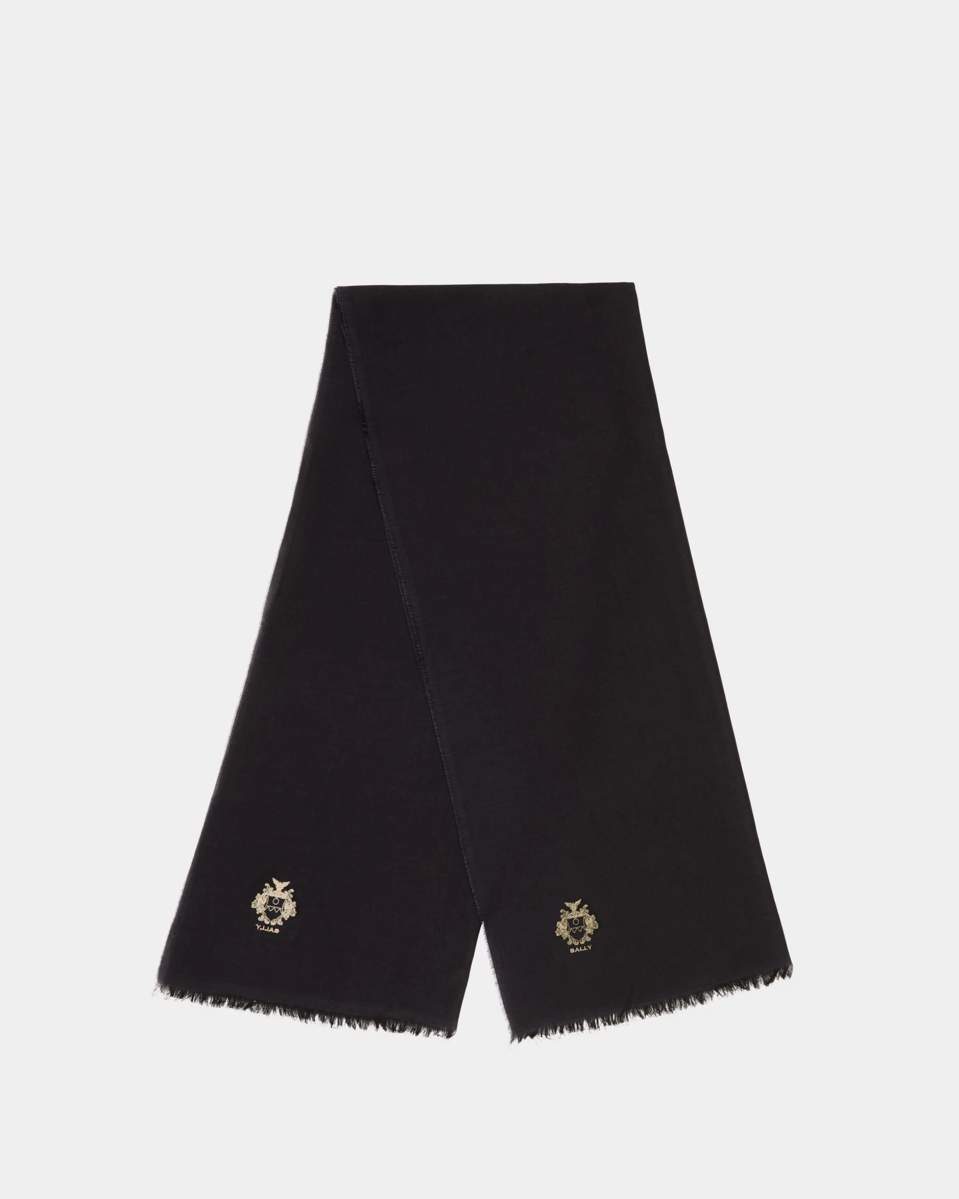 In a blend of silk and cashmere, this Adrien Brody Travel Collection scarf is trimmed by an embroidered Bally Crest and soft fraying on the short sides.