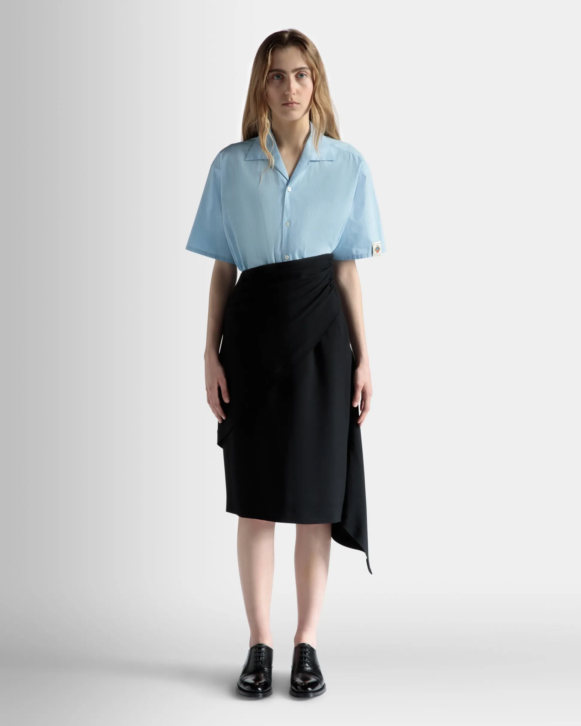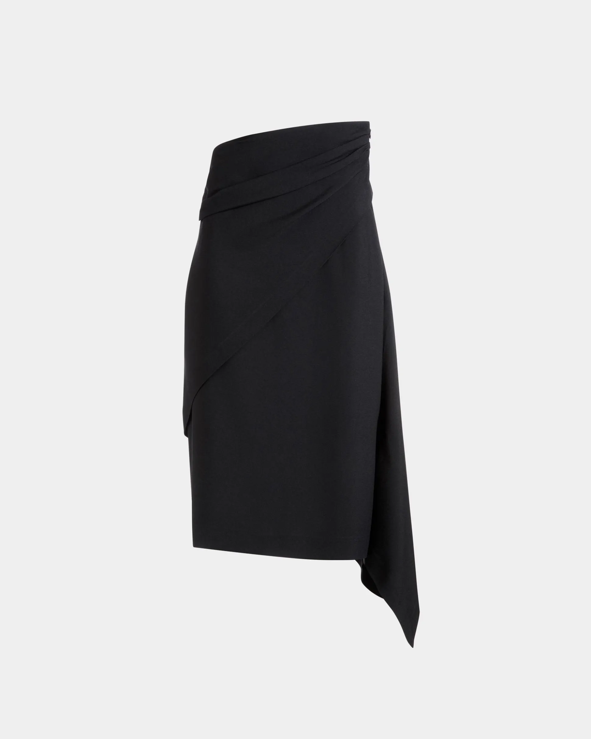 Asymmetric midi skirt in luxurious black fluid crepe. The unique design brings a modern twist to a classic silhouette, with subtle gathering at the waist.