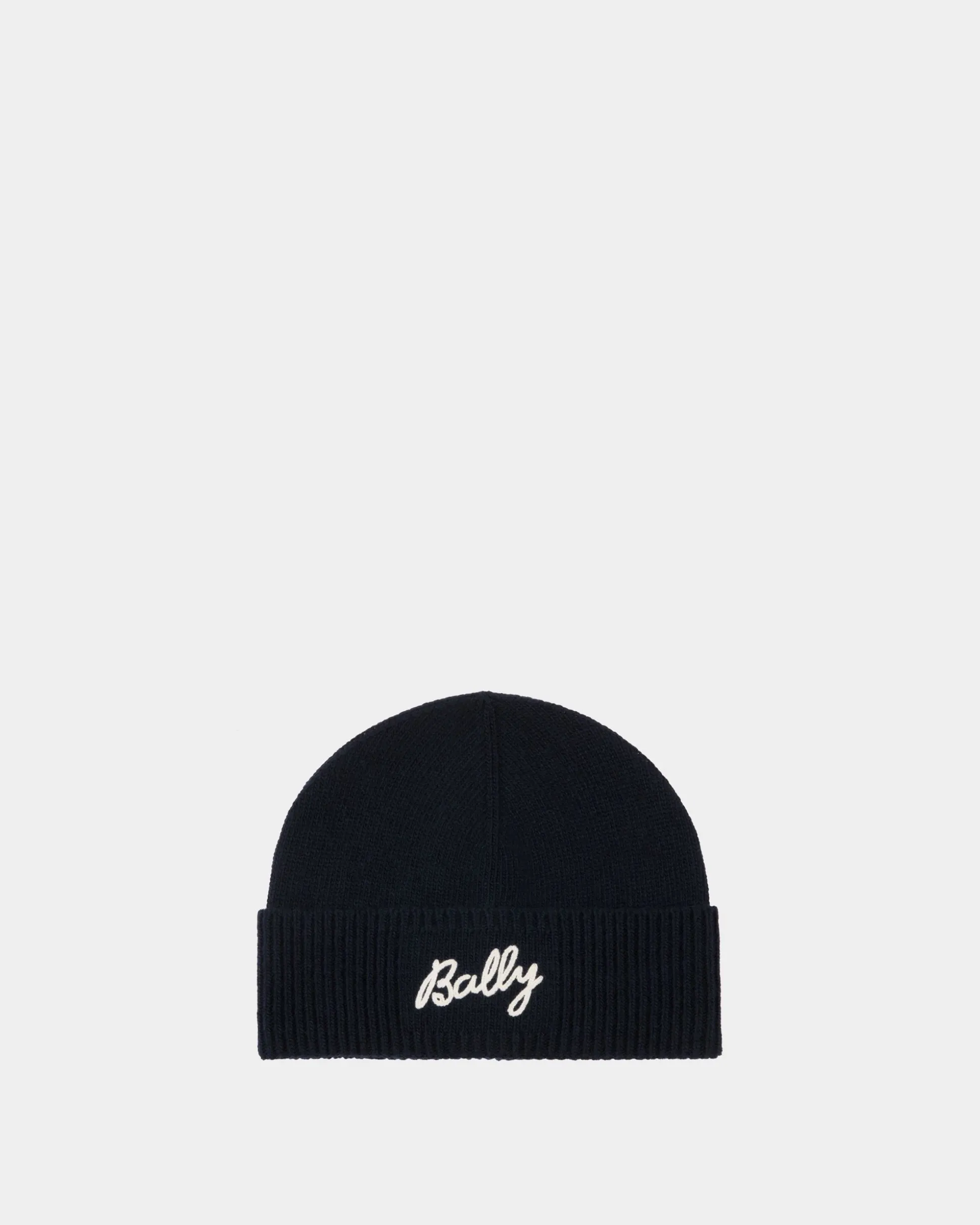 In navy blue, this soft wool beanie is embellished by Bally cursive lettering in white on the front of the ribbed cuff.