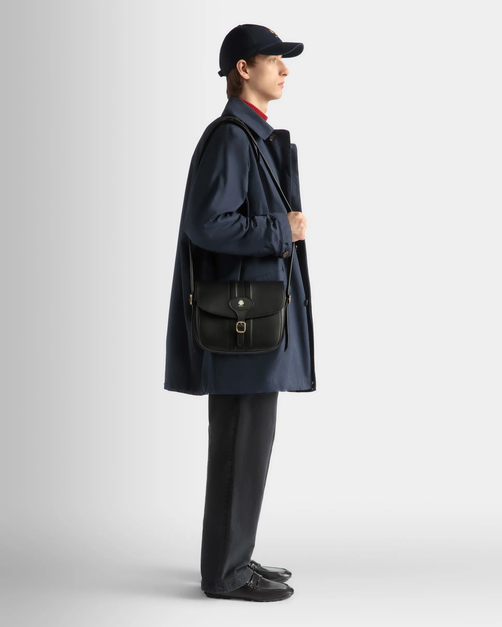 Presented during the Bally SS24 fashion show, the black calfskin Beckett messenger bag is casual and easy-to-style, inspired by vintage lines yet designed for modern lifestyles. The adjustable and removable shoulder strap allows for various carry options, from cross-body to over-the-shoulder. The Bally Ribbon and the gold-tone Bally Crest signifiers add a finishing touch, referencing the heritage of the brand.