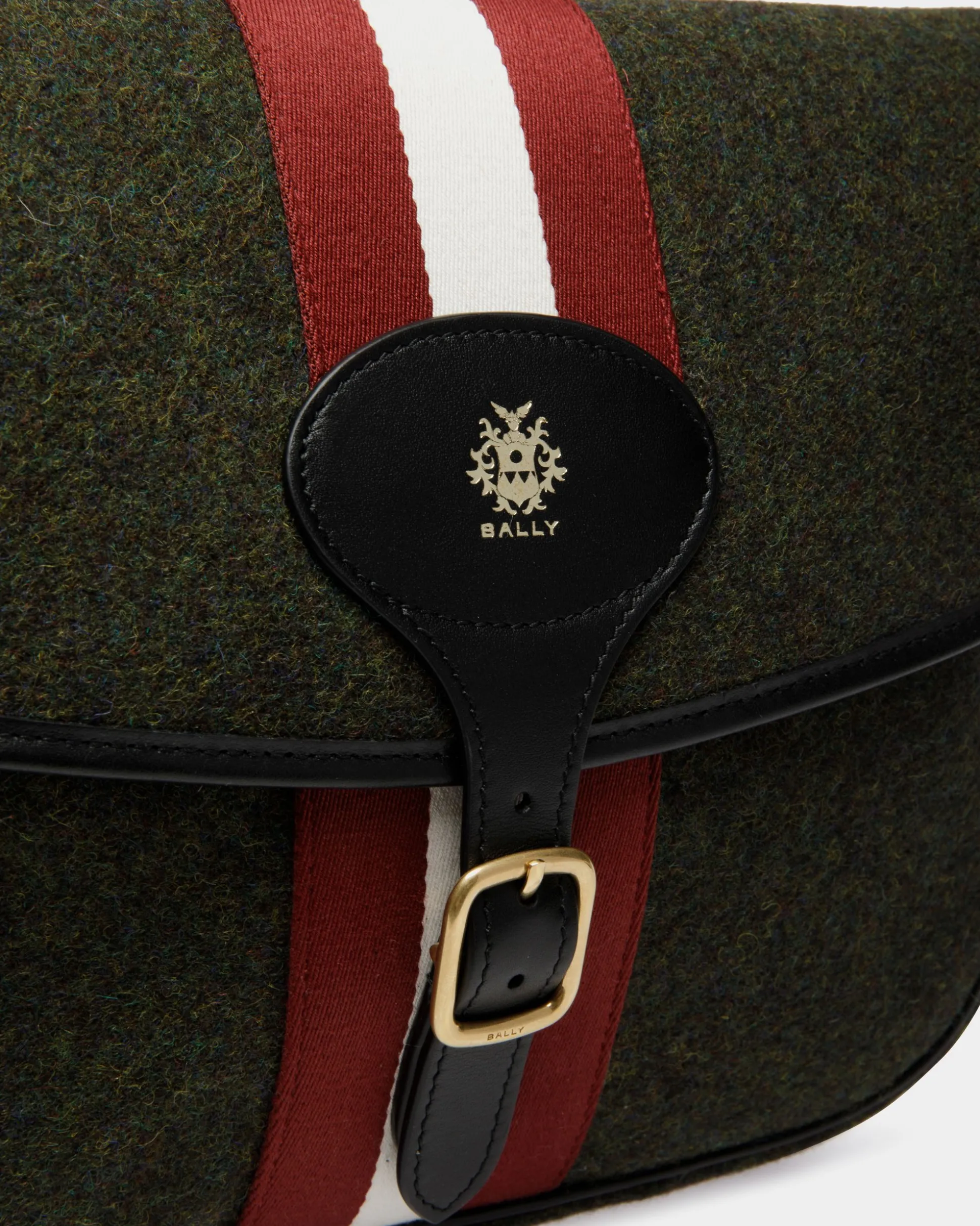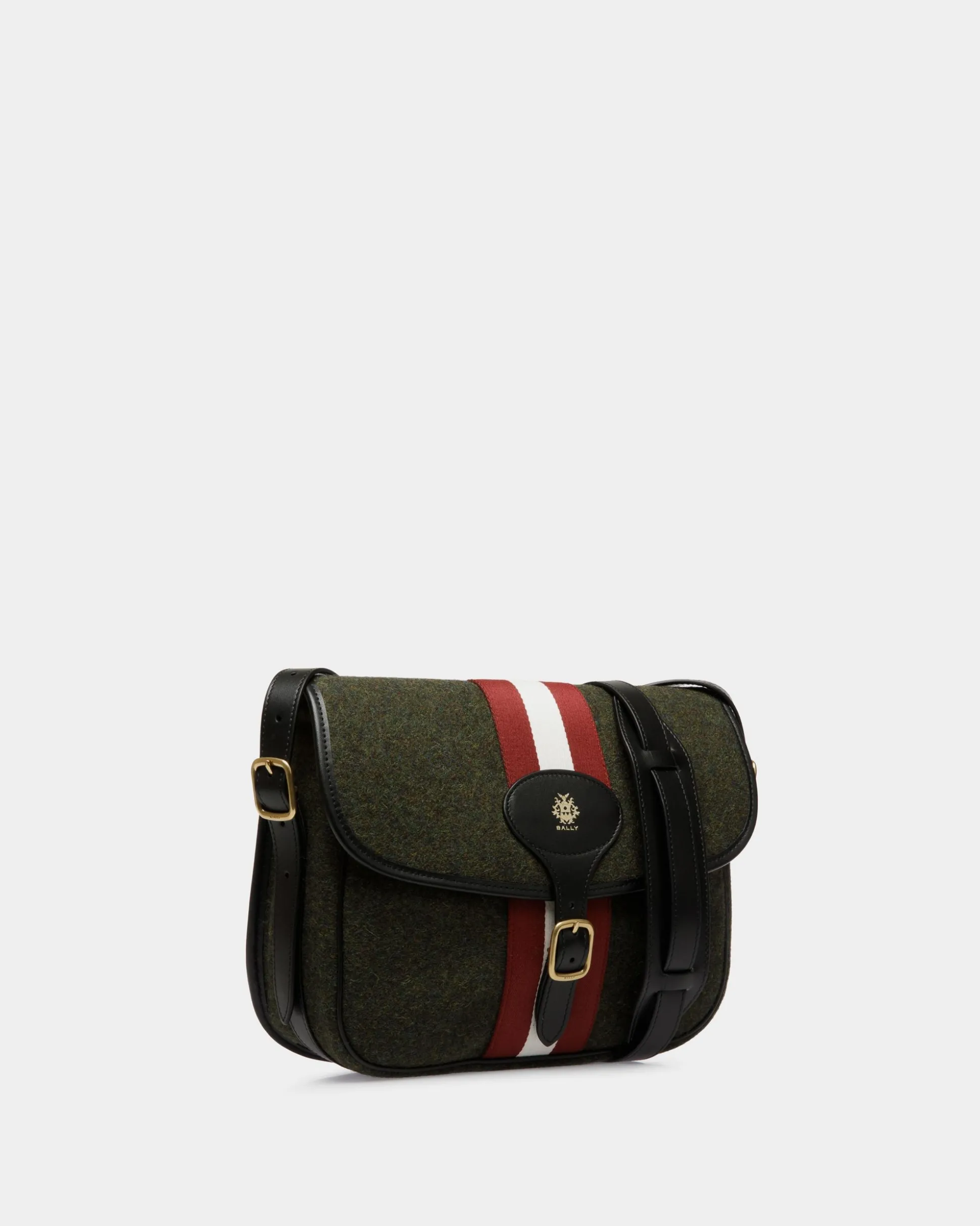This Beckett crossbody bag embodies timeless style that hints at vintage cues, expressed through artisanal savoir-faire. Its dark green felted wool structure is embellished by black leather trim, a Bally Ribbon in red and white fabric, and a gold-tone foil Crest.