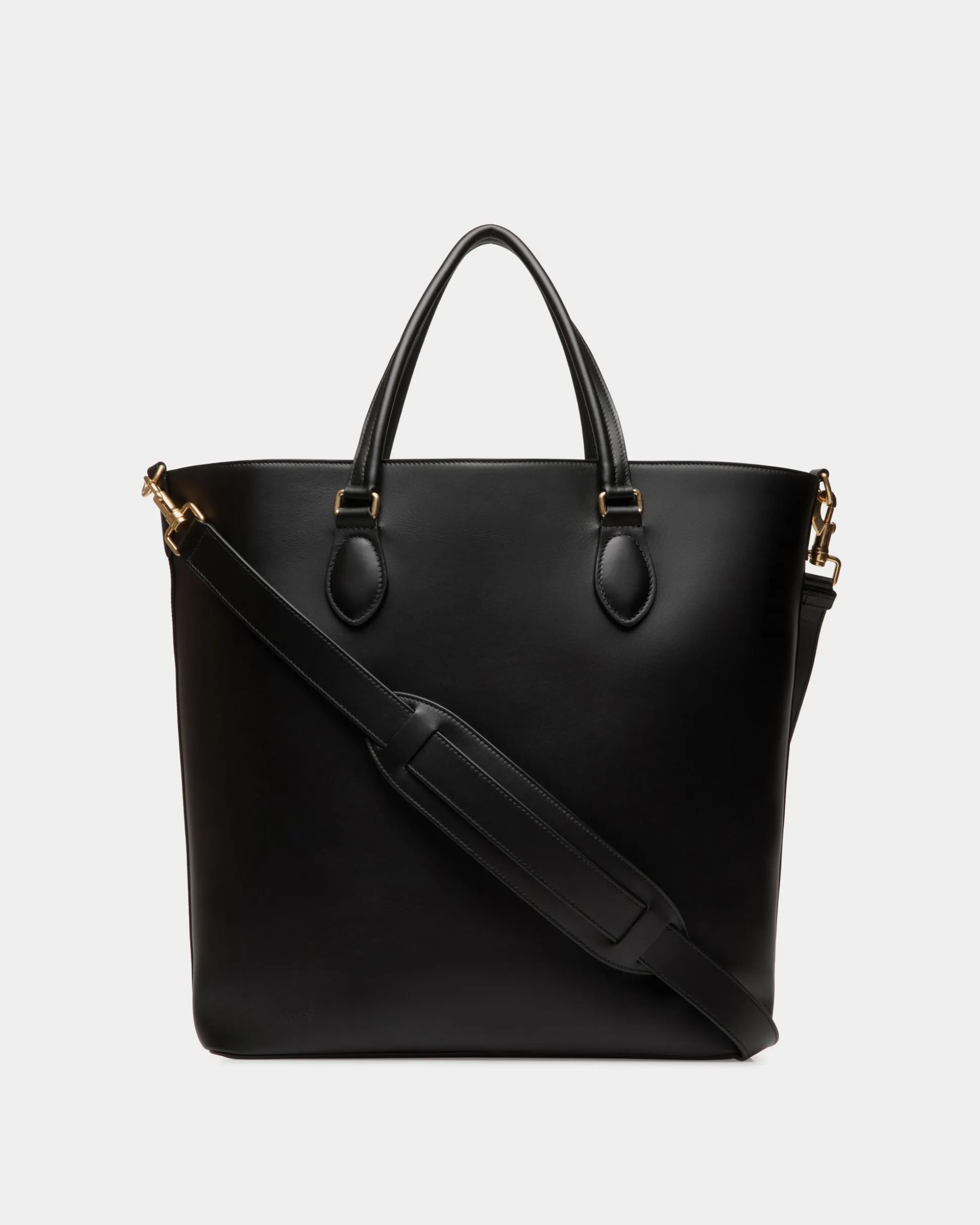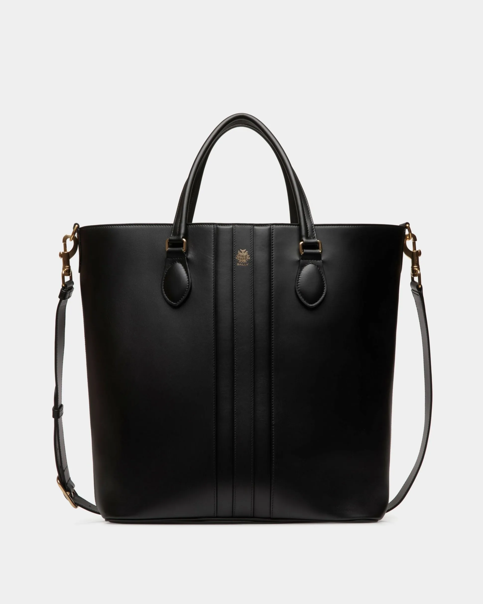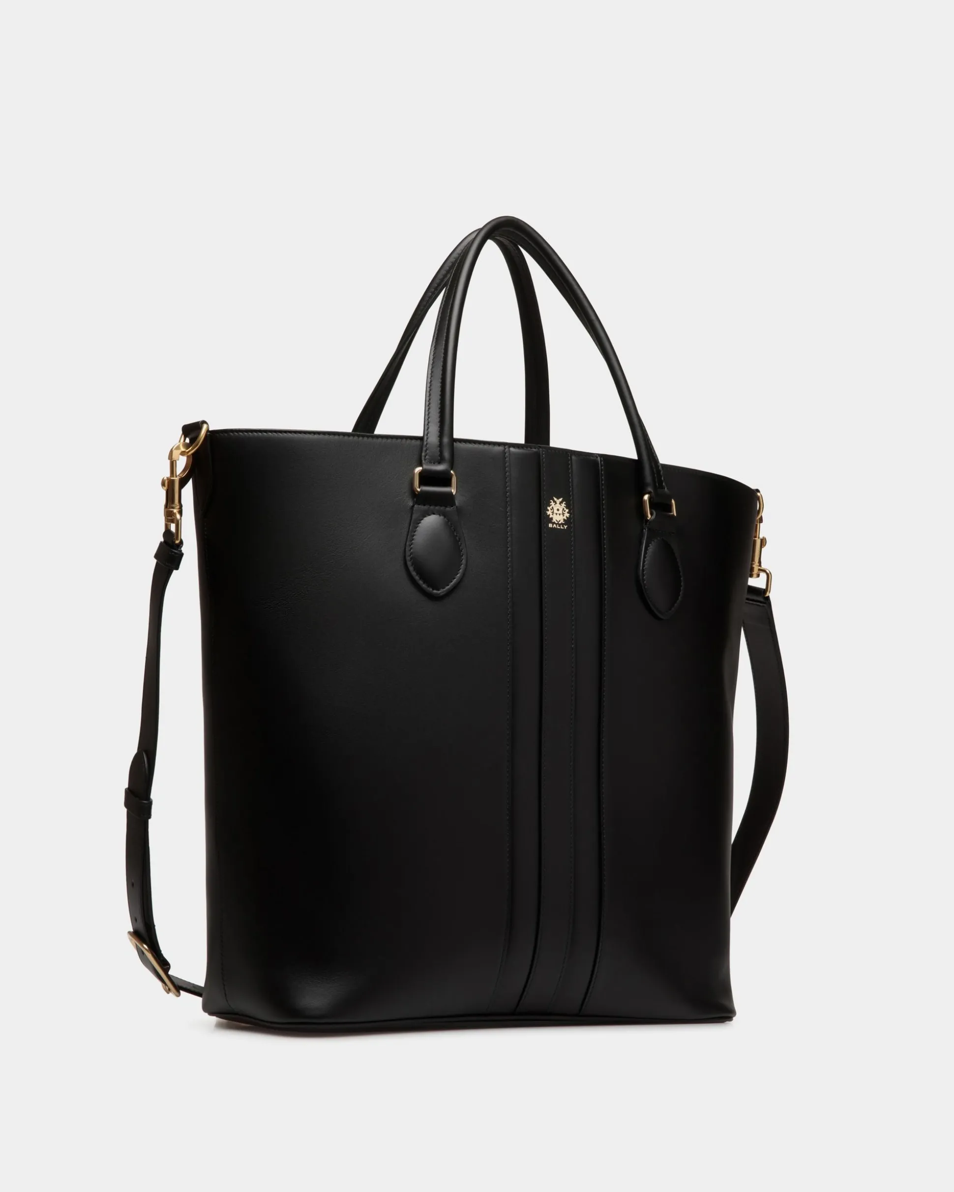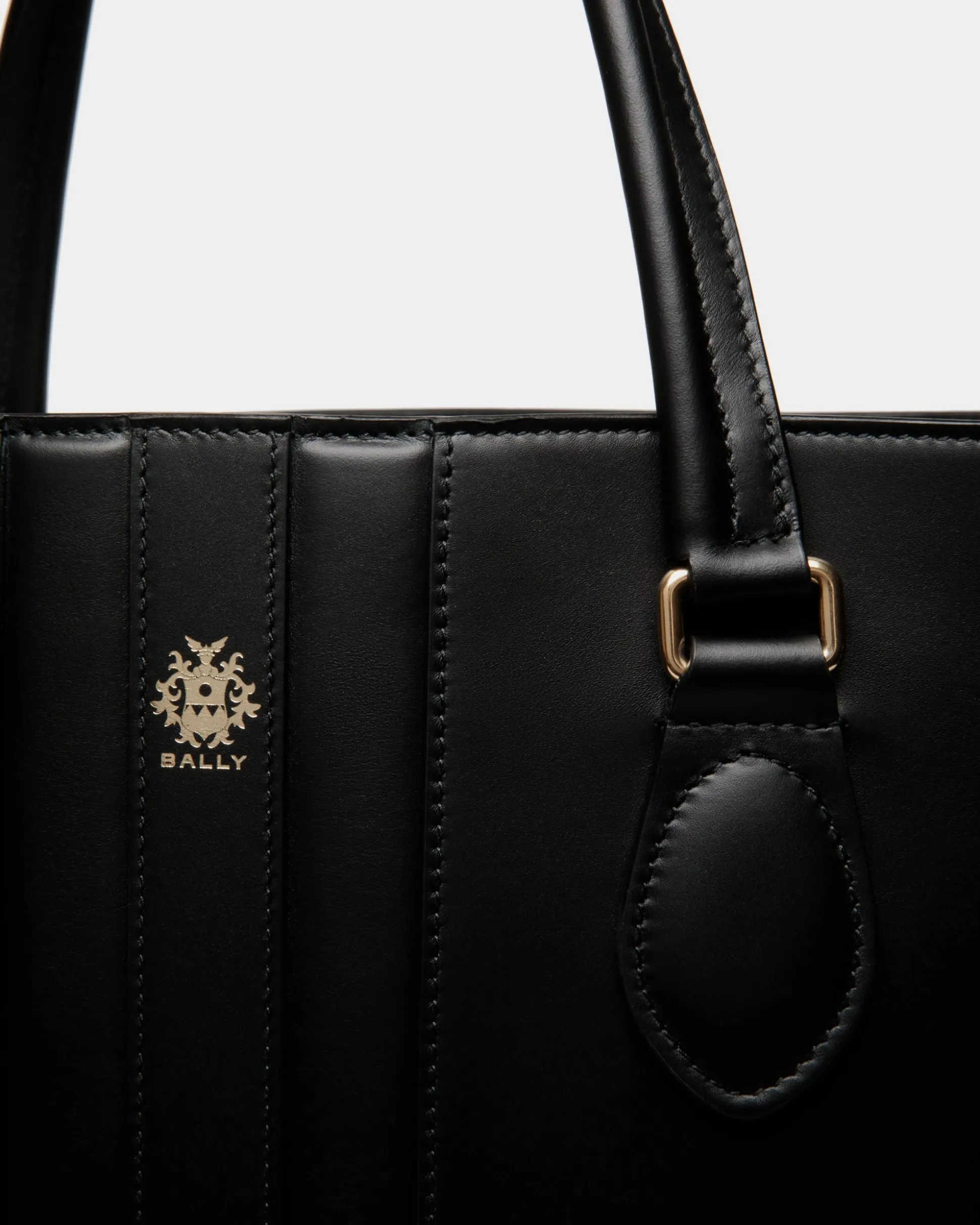 This Beckett tote in black calfskin leather features an inlay Bally Ribbon and a Crest in gold-tone foil. Top handles and a detachable shoulder strap offer a choice between shoulder and hand portability.