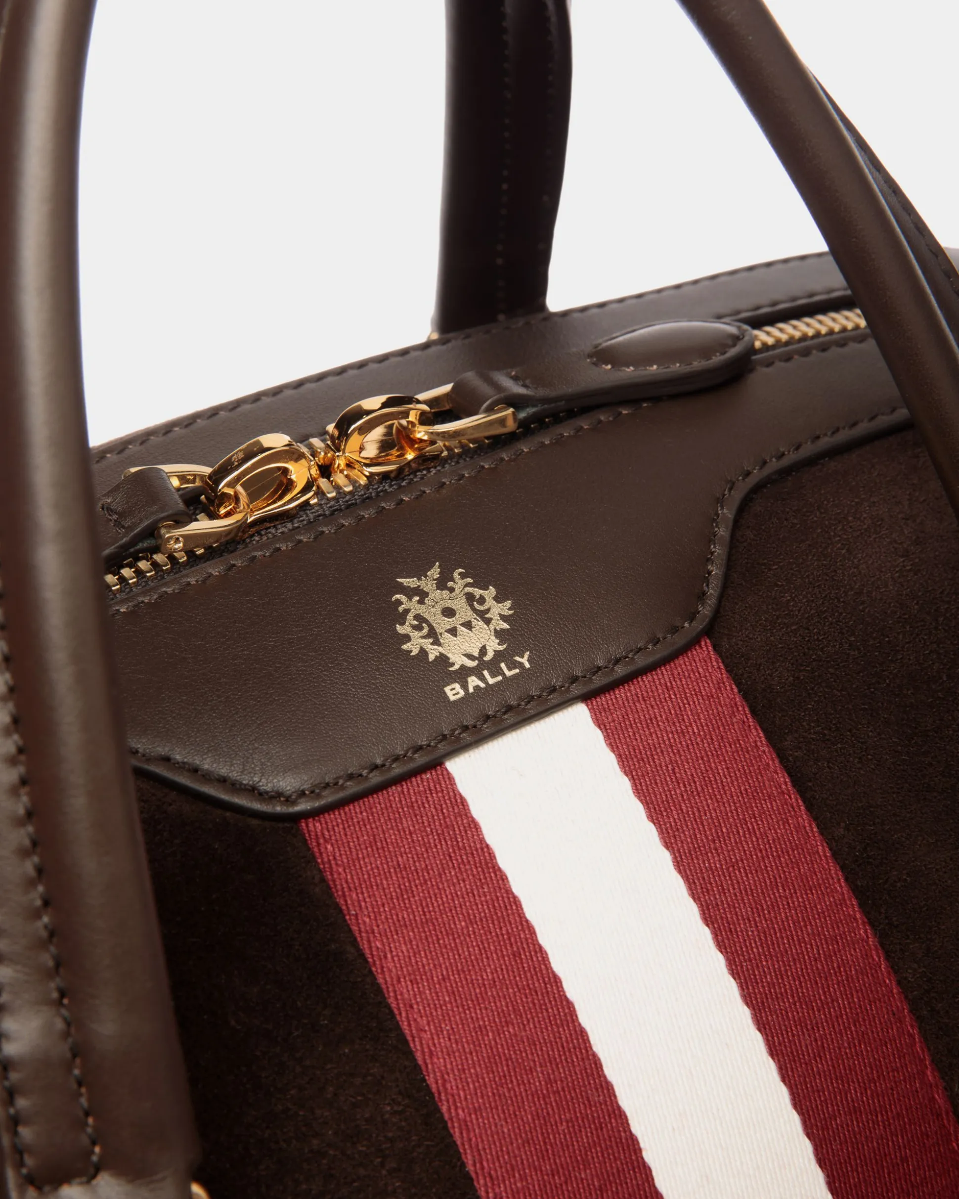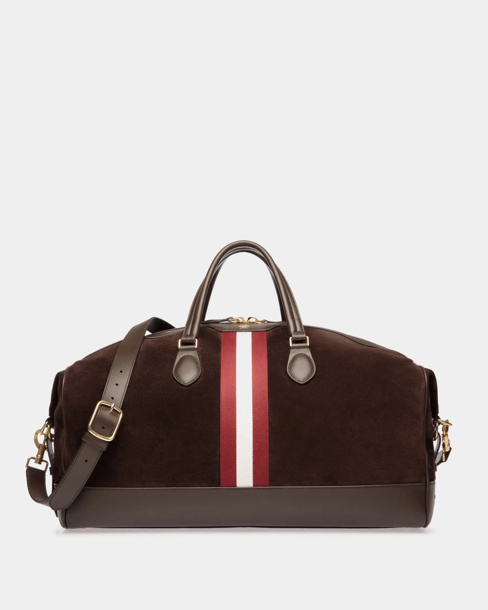 First introduced on the SS24 runway, the Beckett line brings Swiss design to timeless pieces while hinting at a vintage aesthetic. This weekender in fine calfskin suede is crossed by a vertical Bally Ribbon in white and red fabric, with a gold-tone foil Crest to the top. Hooks at the sides adjust the roomy silhouette for a versatile, take-anywhere accessory.