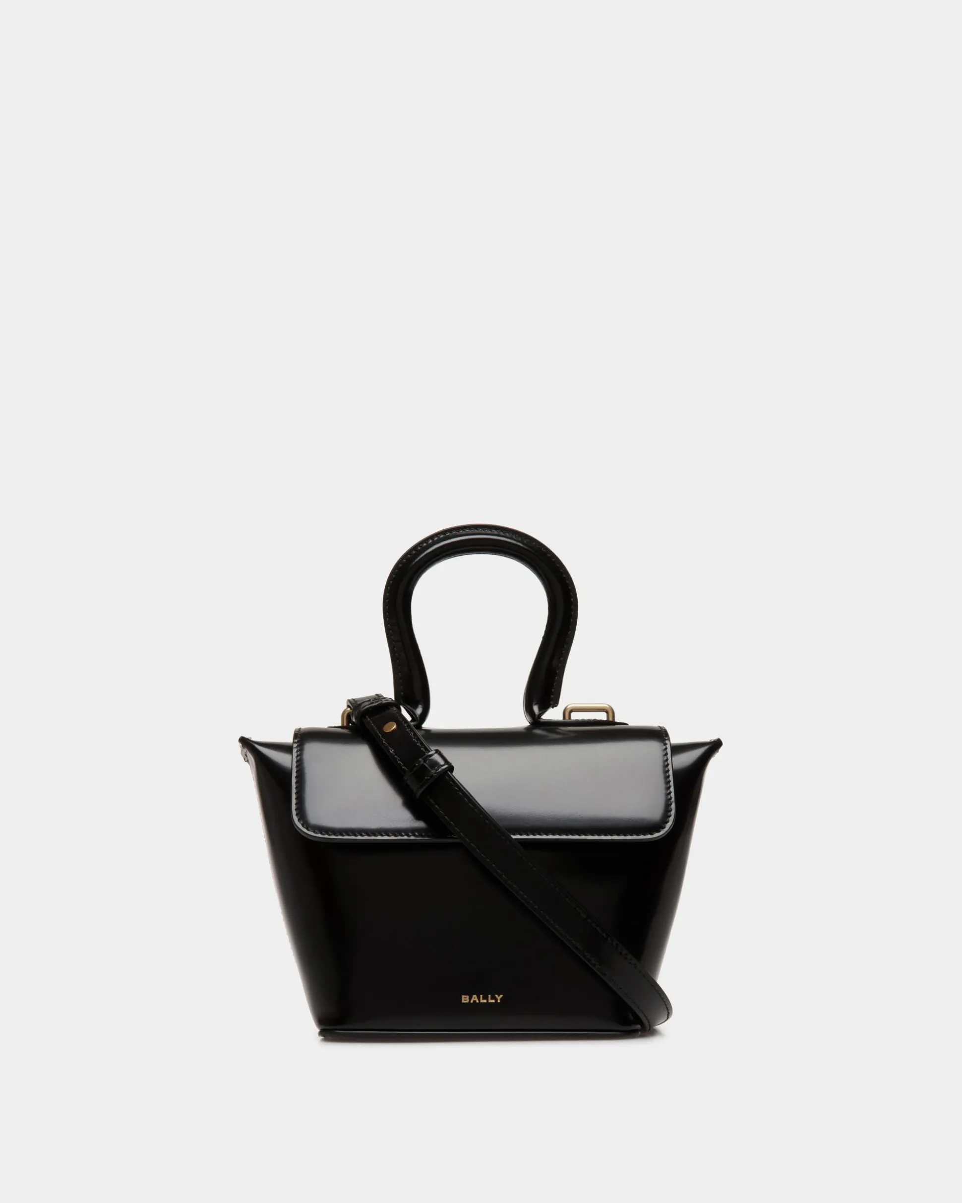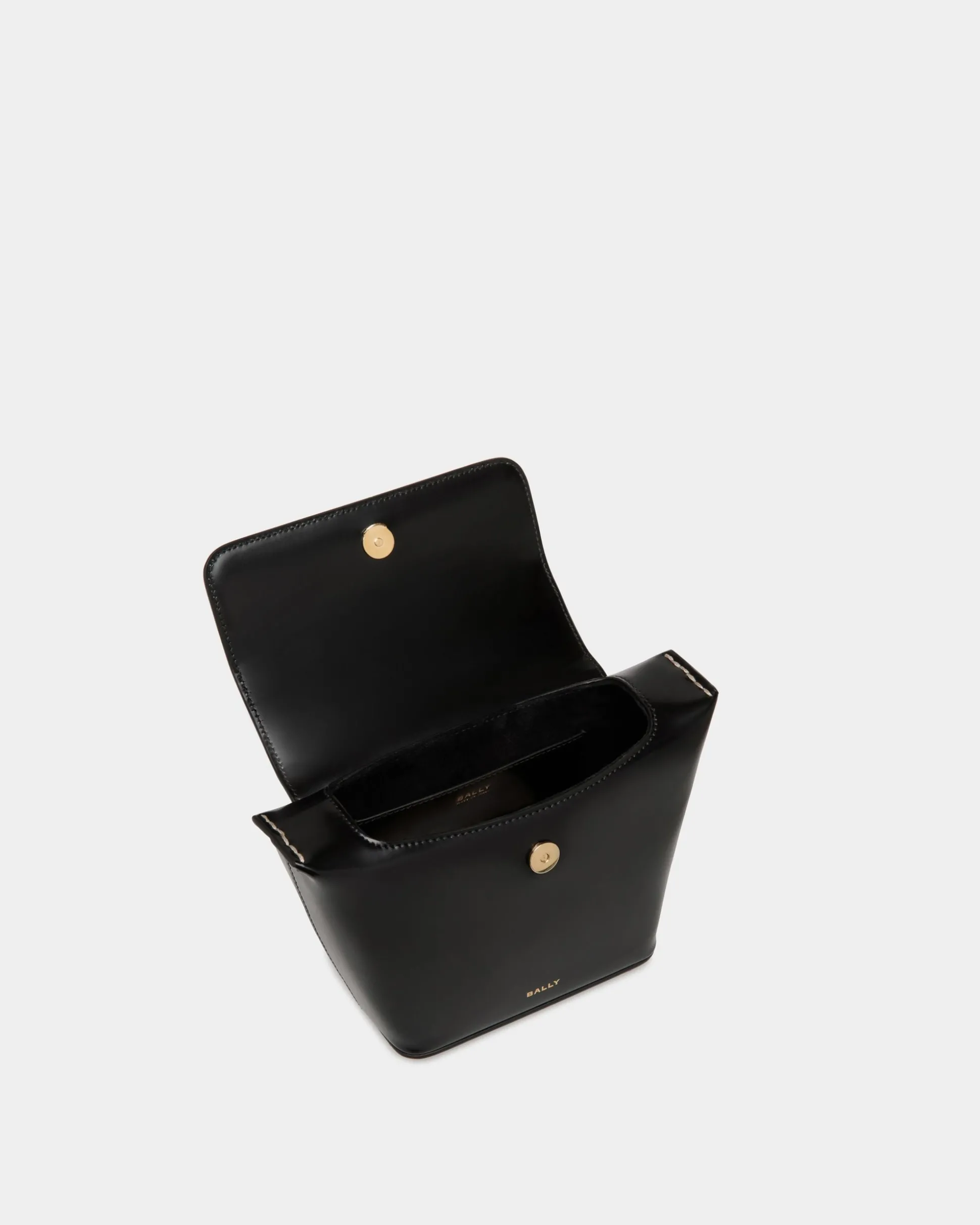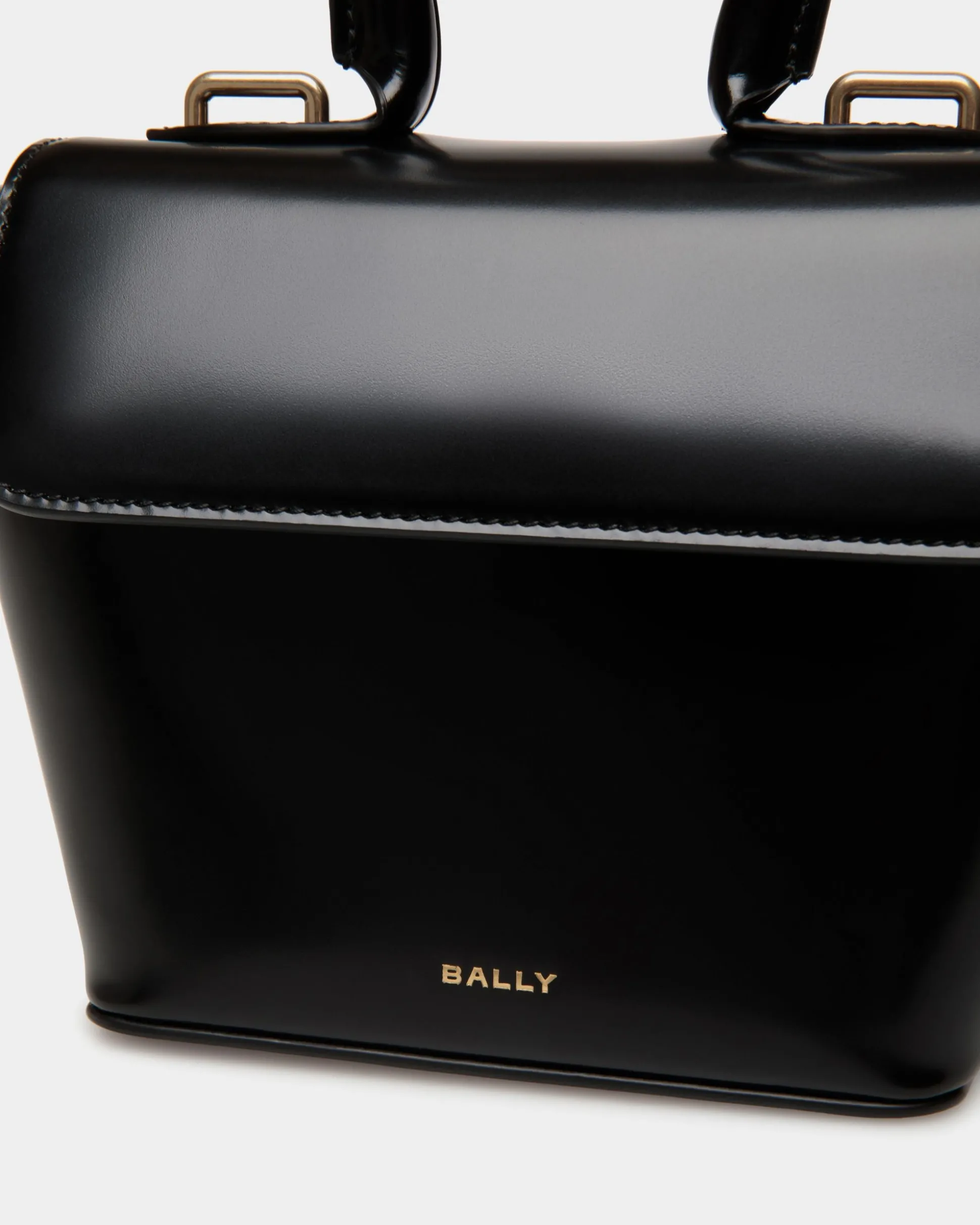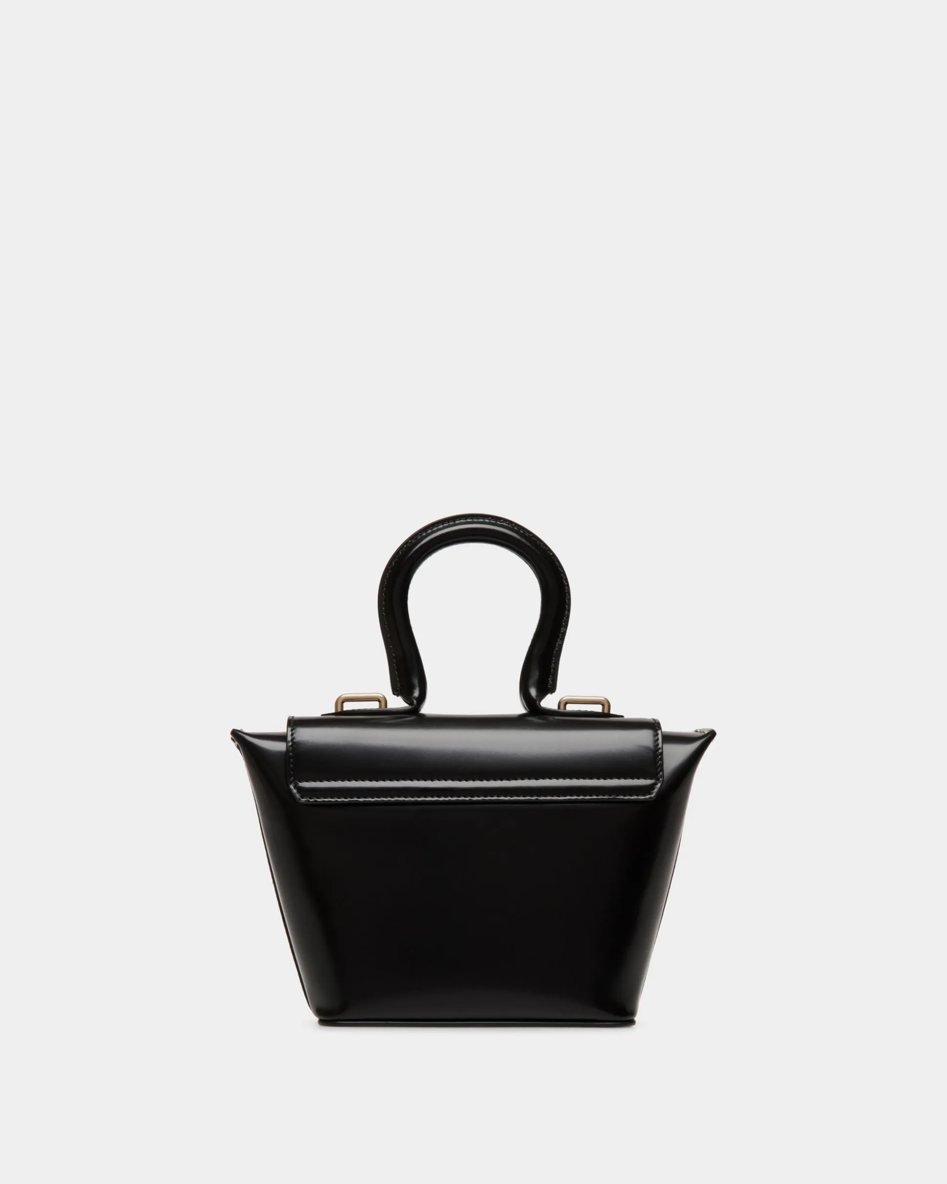 Seen on the Bally FW24 runway, the Belle minibag is crafted in black brushed calfskin. Essential gold-tone metal hardware and contrast topstitching at the sides complement its compact, unique silhouette.
