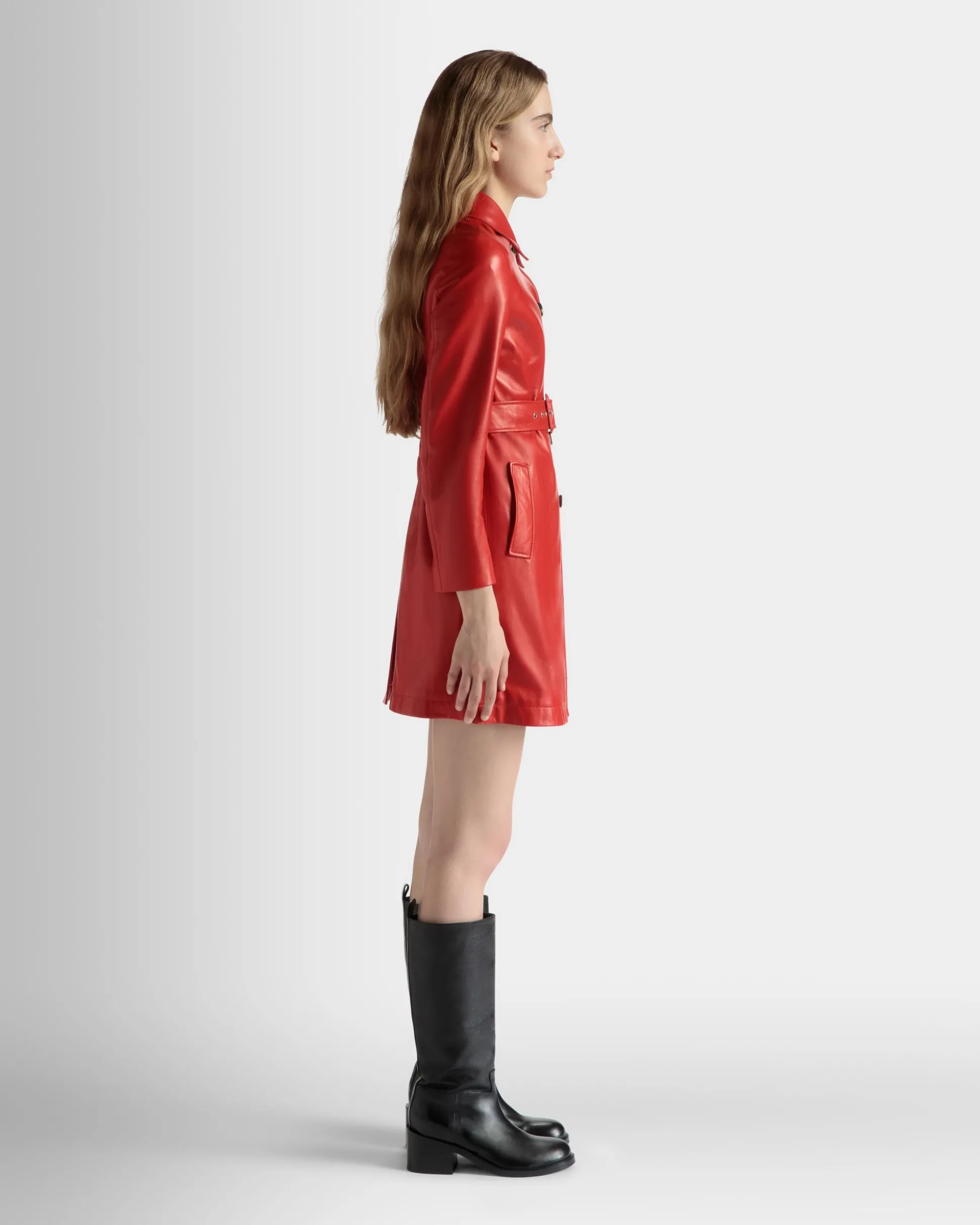 Candy Red leather midi coat with a matching belt to shape the silhouette. Crafted from luxurious nappa lambskin, it offers a supple handfeel which expresses the true potential of the material. Large horn buttons fasten the front.