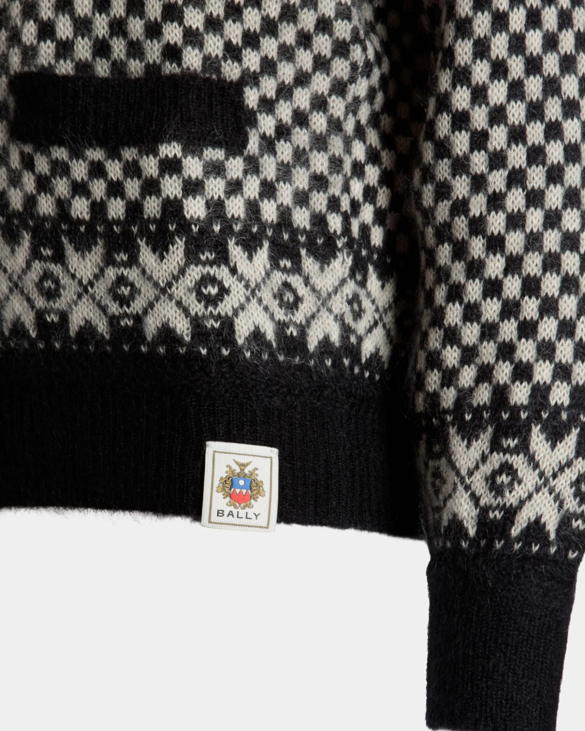 This soft mohair and silk cardigan is enlivened by different jacquard-knit geometric and checkerboard motifs in black and white. The front is fastened by mother-of-pearl Bally buttons.