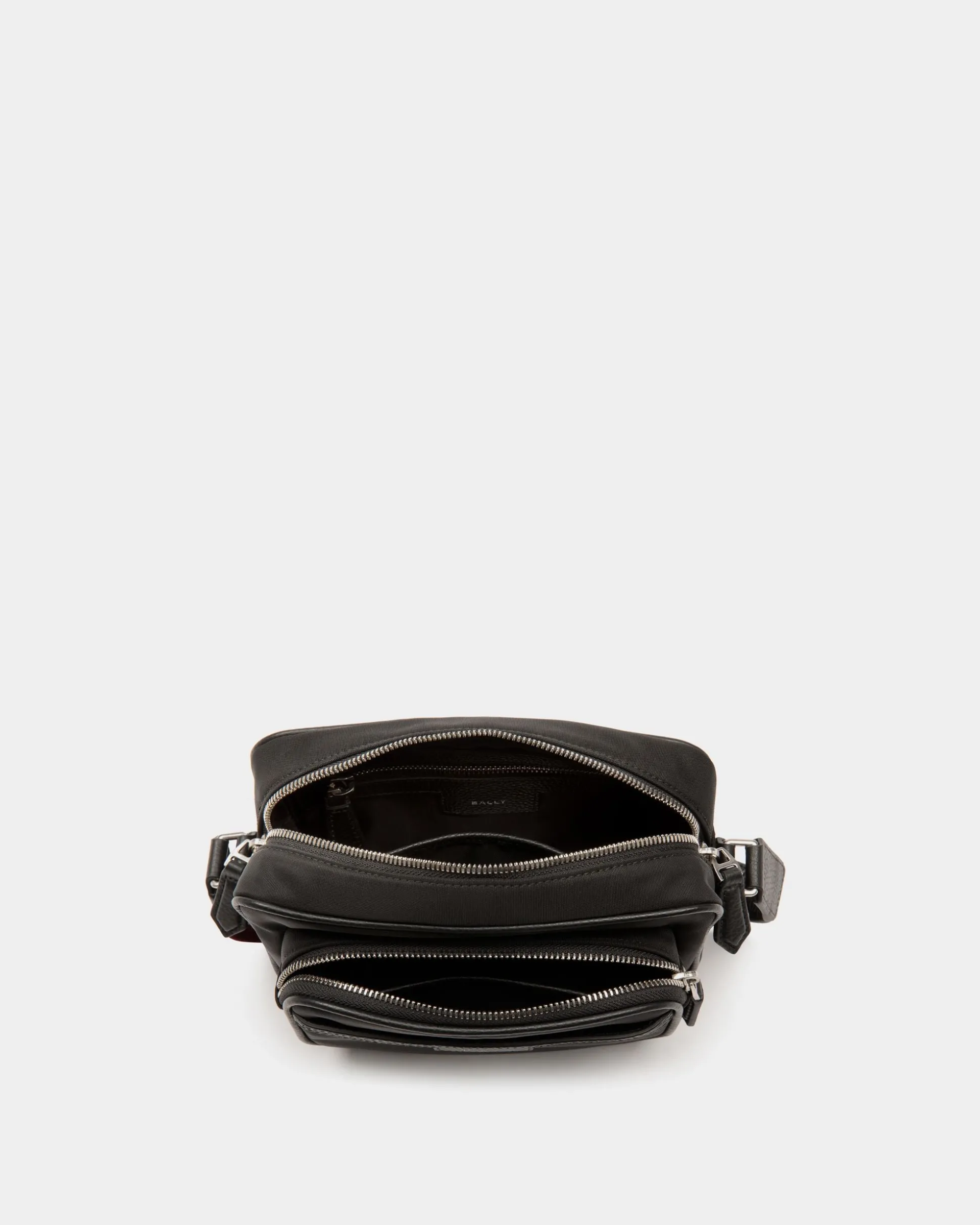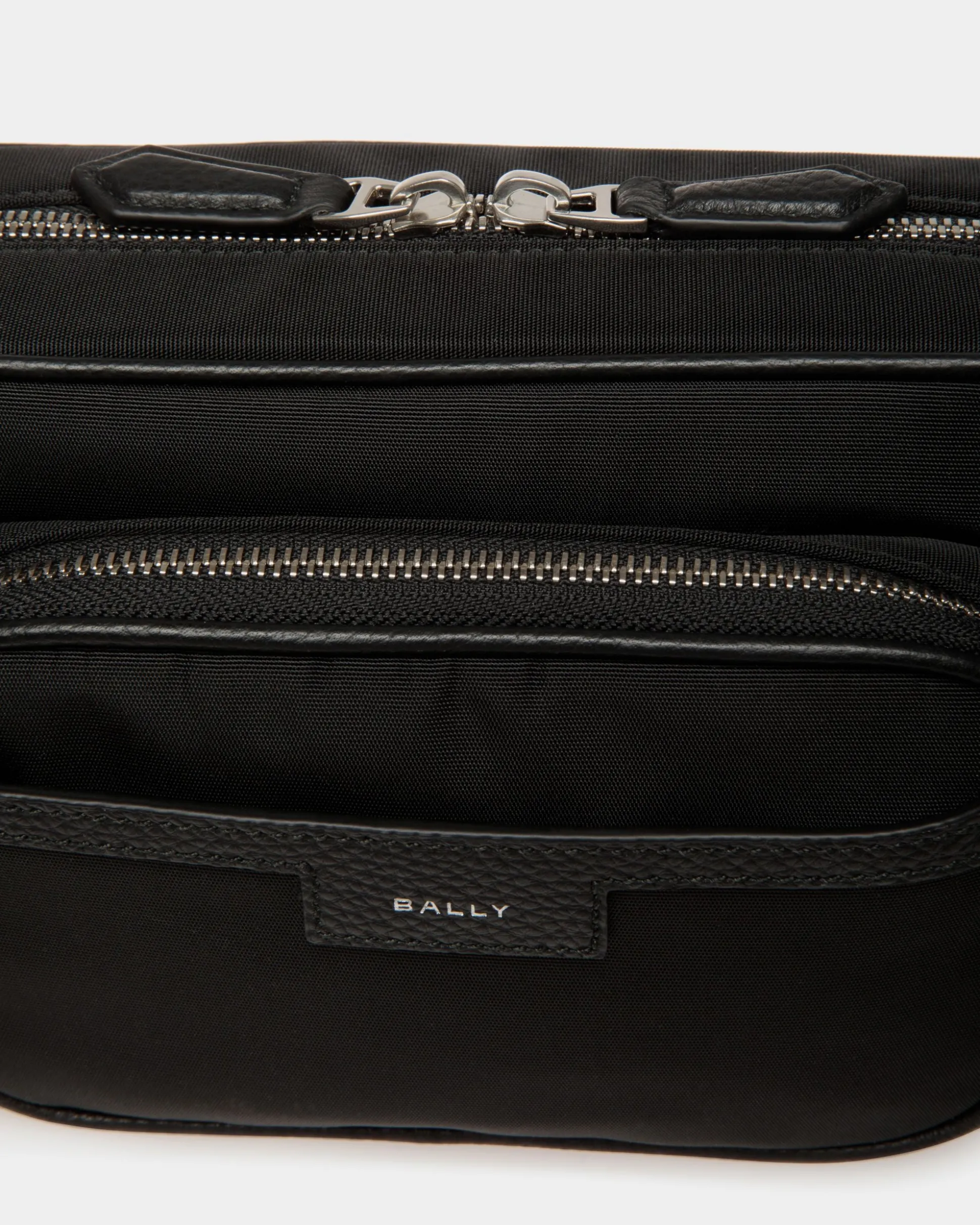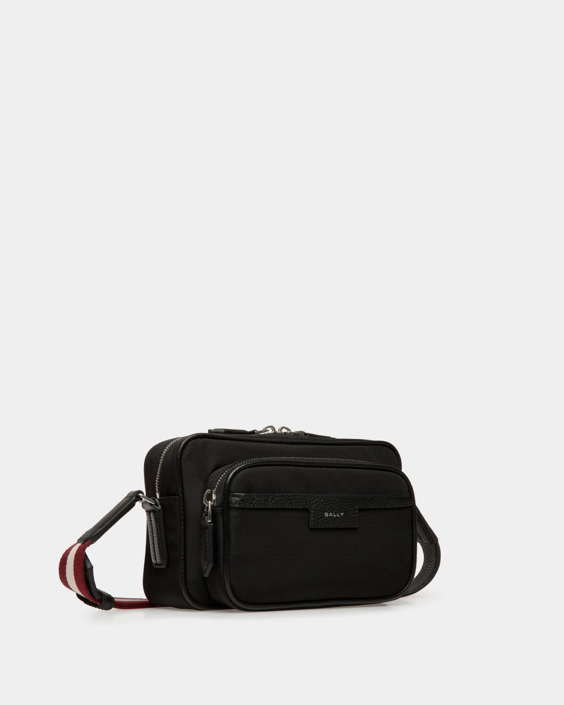 Crafted in black nylon fabric, the Code crossbody bag is a sleek and versatile accessory, elevated by an adjustable Bally Ribbon shoulder strap. With its spacious interior and convenient outer pocket, both secured by zippers, it effortlessly unites style and functionality for the modern man.