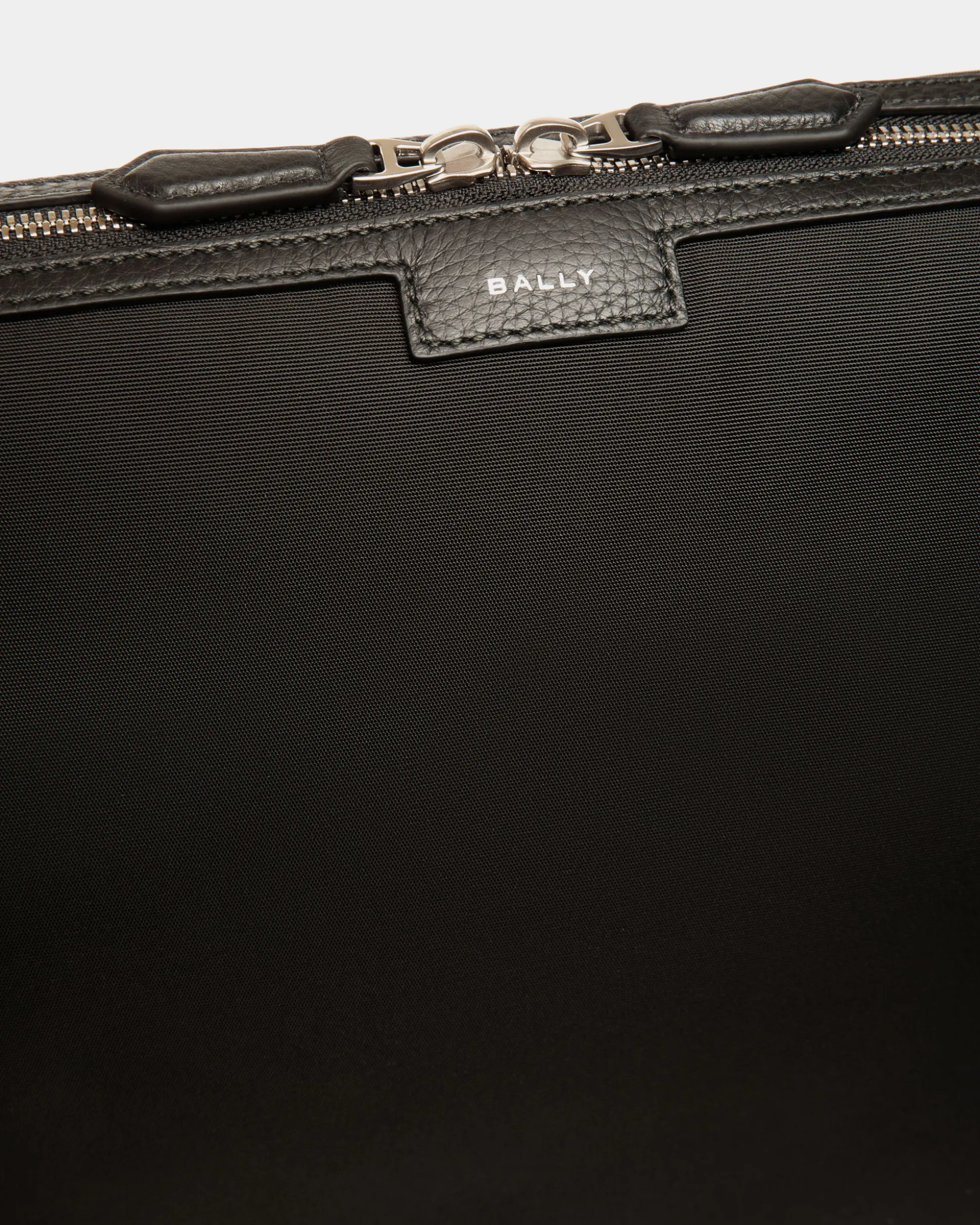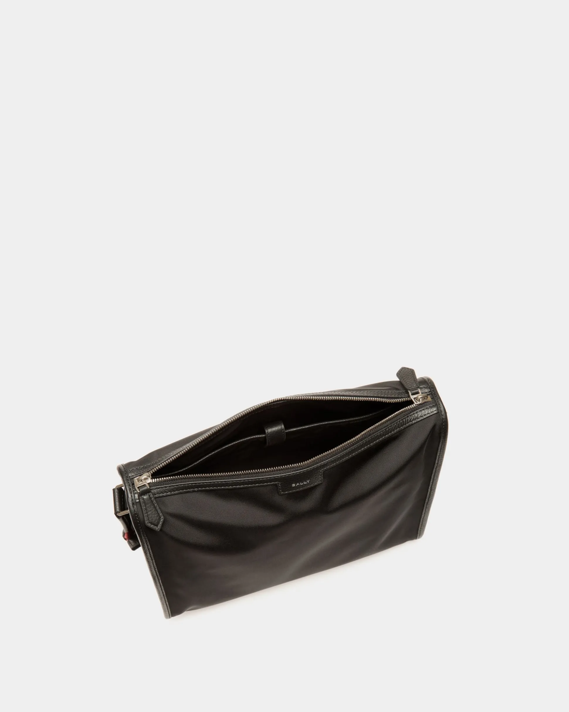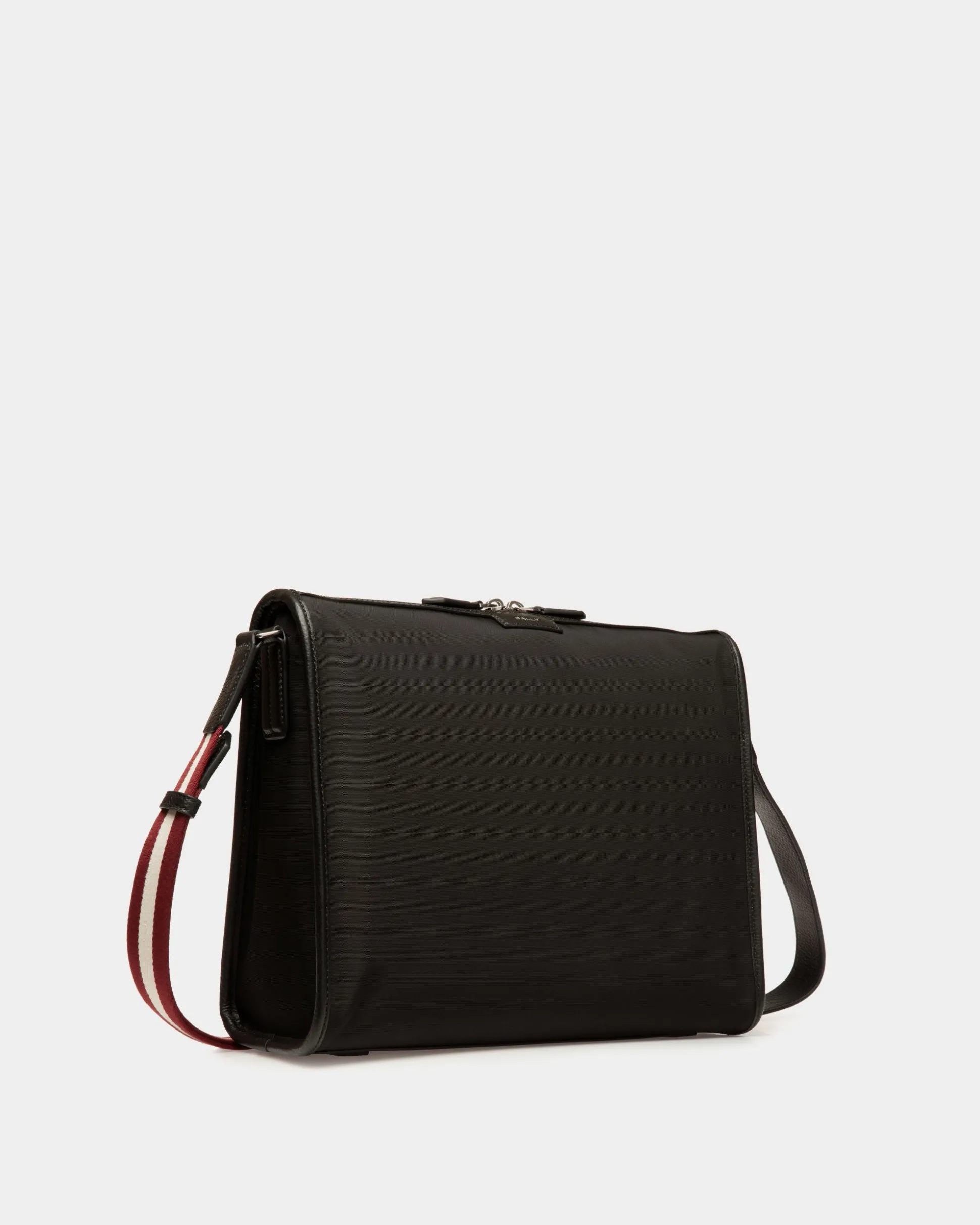 The Code messenger crossbody bag in black nylon is a sleek and versatile accessory. Trimmed in grained leather, it features a spacious interior, multiple pockets, and an adjustable Bally Ribbon strap for effortless transportation.