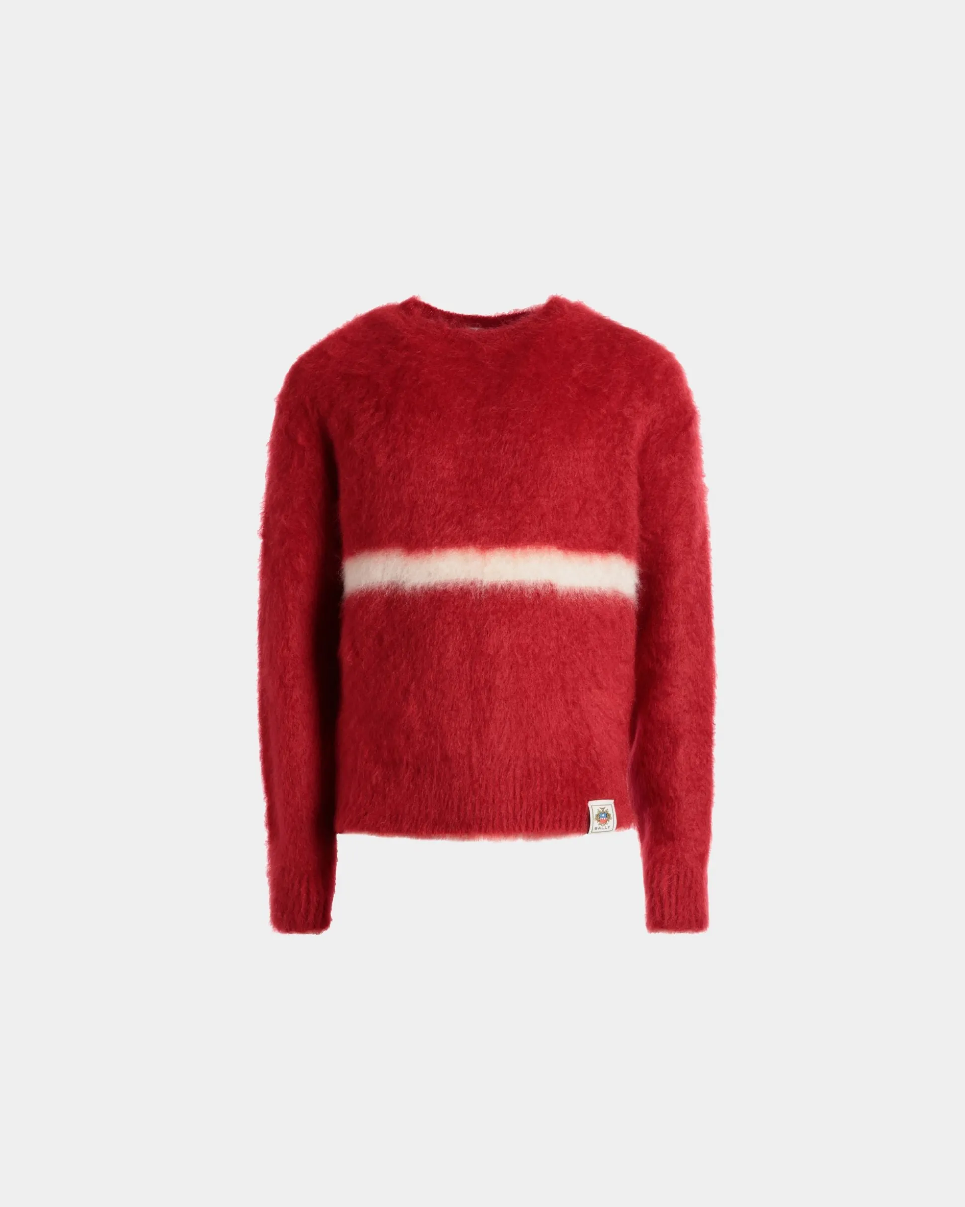 This long-sleeve pullover sweater unites the soft handle of brushed mohair with a vibrant red hue, crossed by a stripe in white. A Bally Crest label adorns the left hemline.