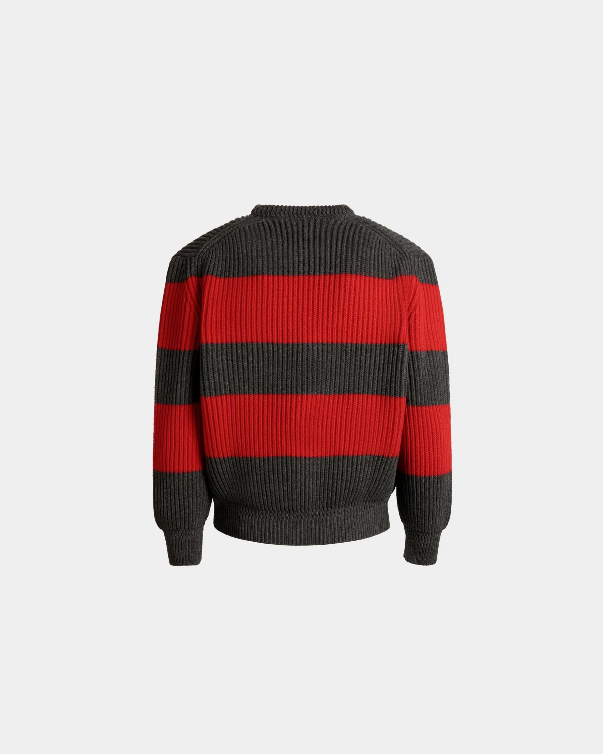 Bold Candy Red stripes cross the front and back of this grey sweater in ribbed knit wool. A Bally Crest label decorates the lower hem.