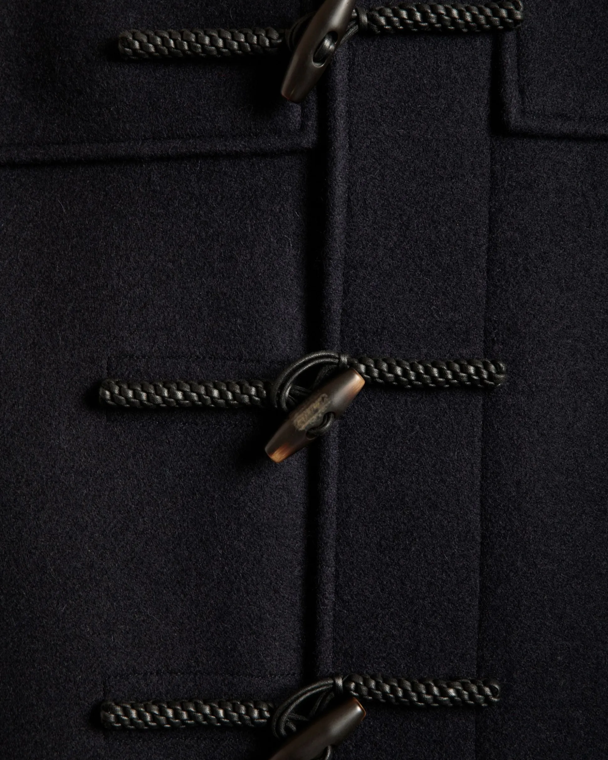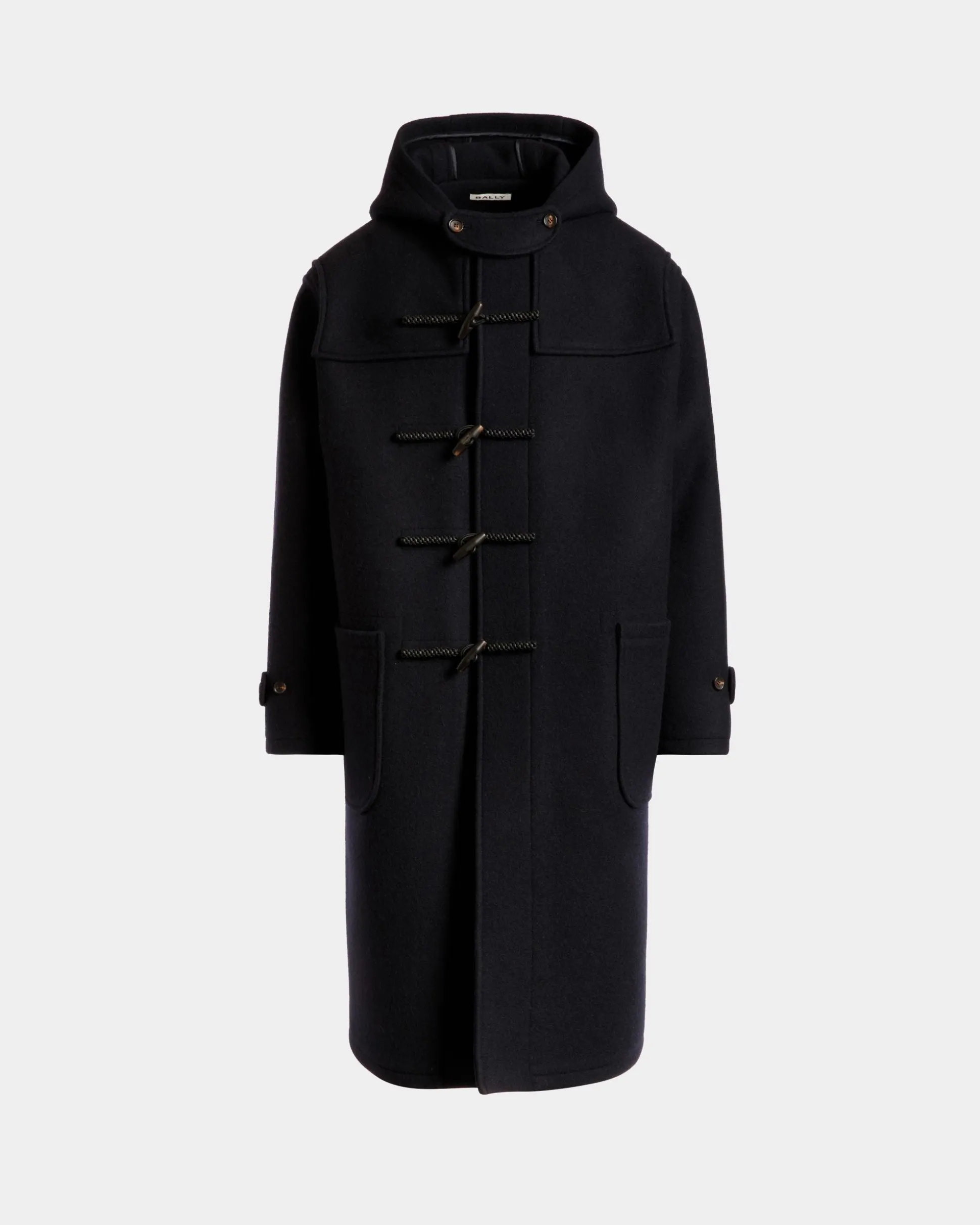 This long duffel coat is crafted with precision in navy blue winterweight felted wool, complete with a hood and a detachable neck protector. Toggles fasten the front.