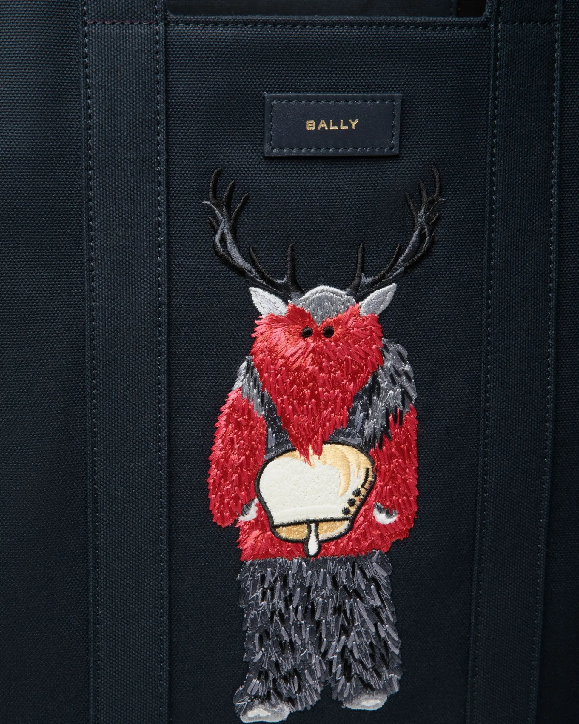 In navy blue cotton canvas, the Easy Bally tote is defined by a simple silhouette and roomy top handles. A colorful embroidered mythical creature from Swiss folklore embellishes the front.