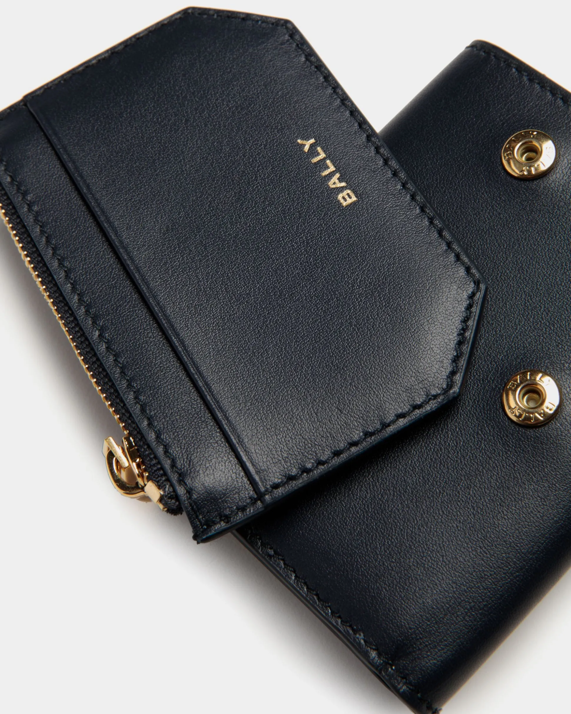 This compact Emblem wallet is crafted from navy blue leather. The zipped card and coin holder at the back can be detached and carried separately thanks to a few concealed snaps.