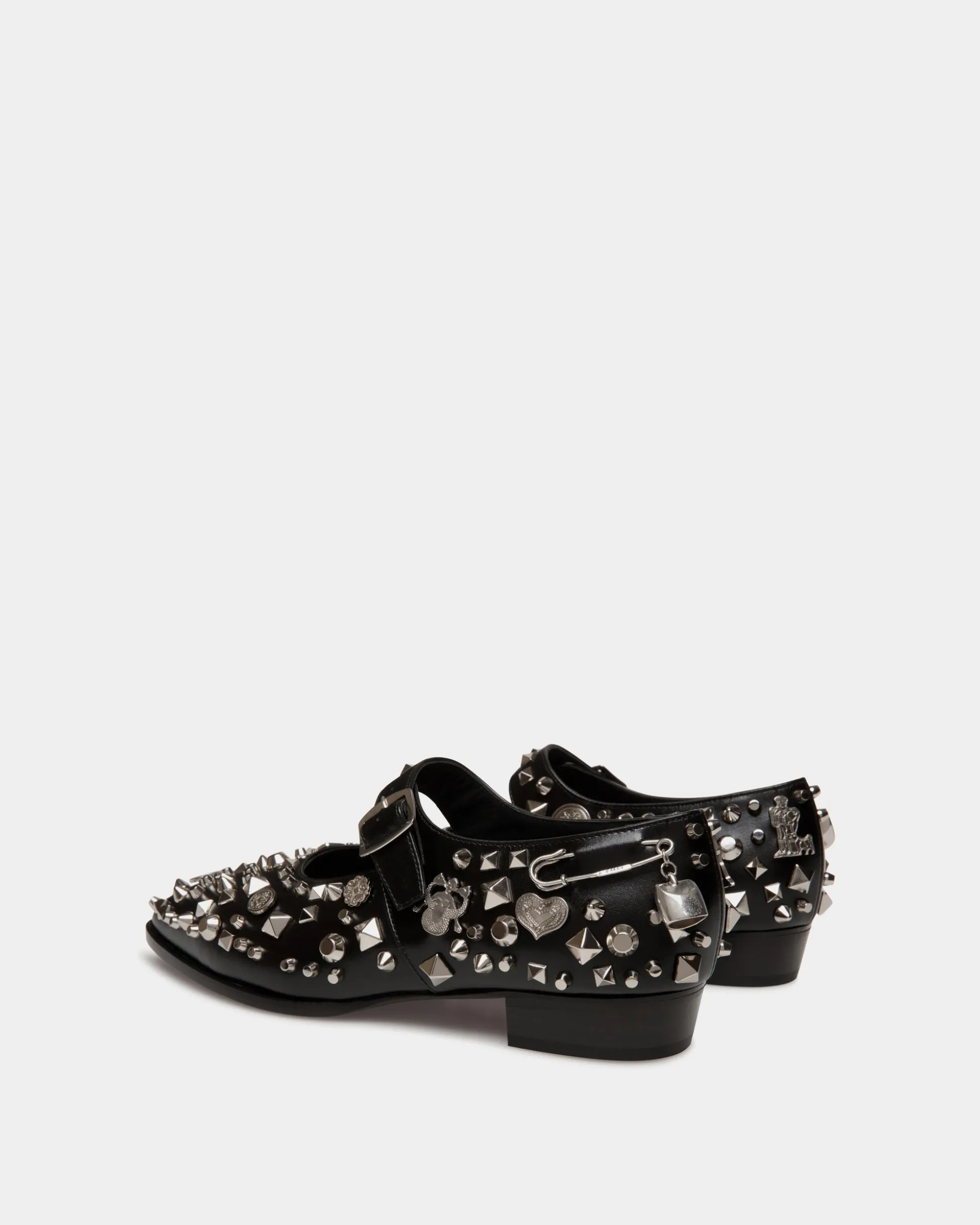 A statement shoe seen in the Bally FW24 fashion show, this Glendale Mary-Jane is a bold reinterpretation of an archival style. Unexpected and iconic metal details and a safety pin with a cowbell add extra attitude to the black leather upper.