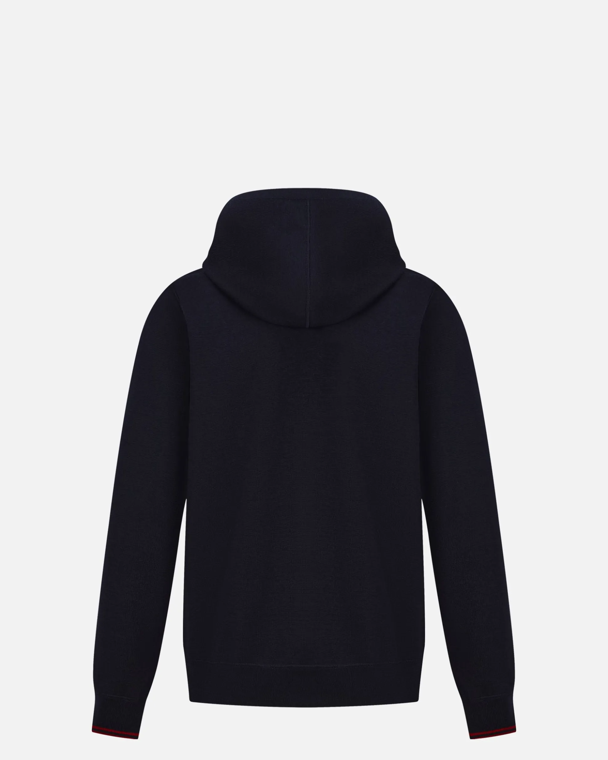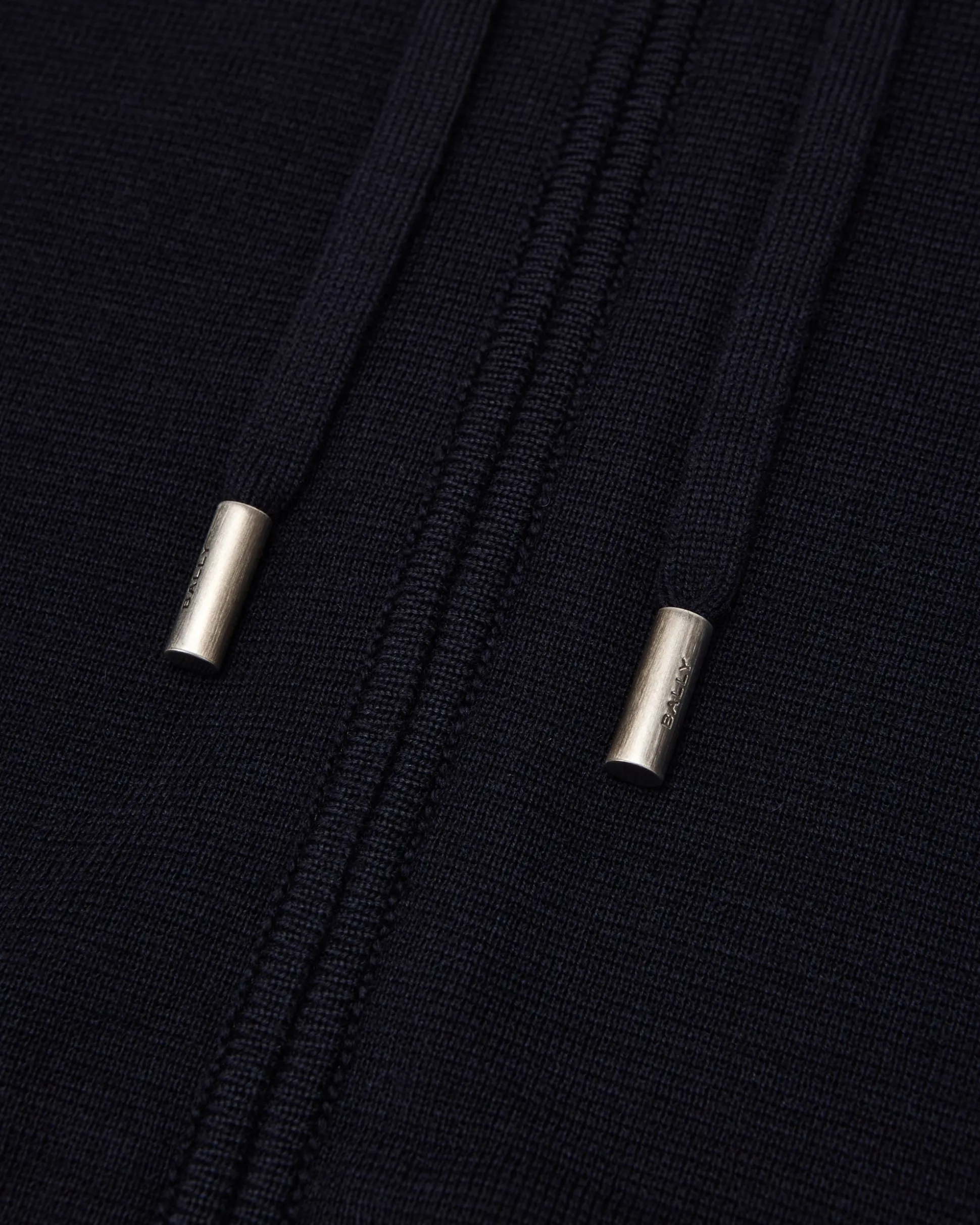 This navy blue wool hoodie is designed for versatility, with a red Bally Ribbon knit into the inside of the hood and on the cuffs.