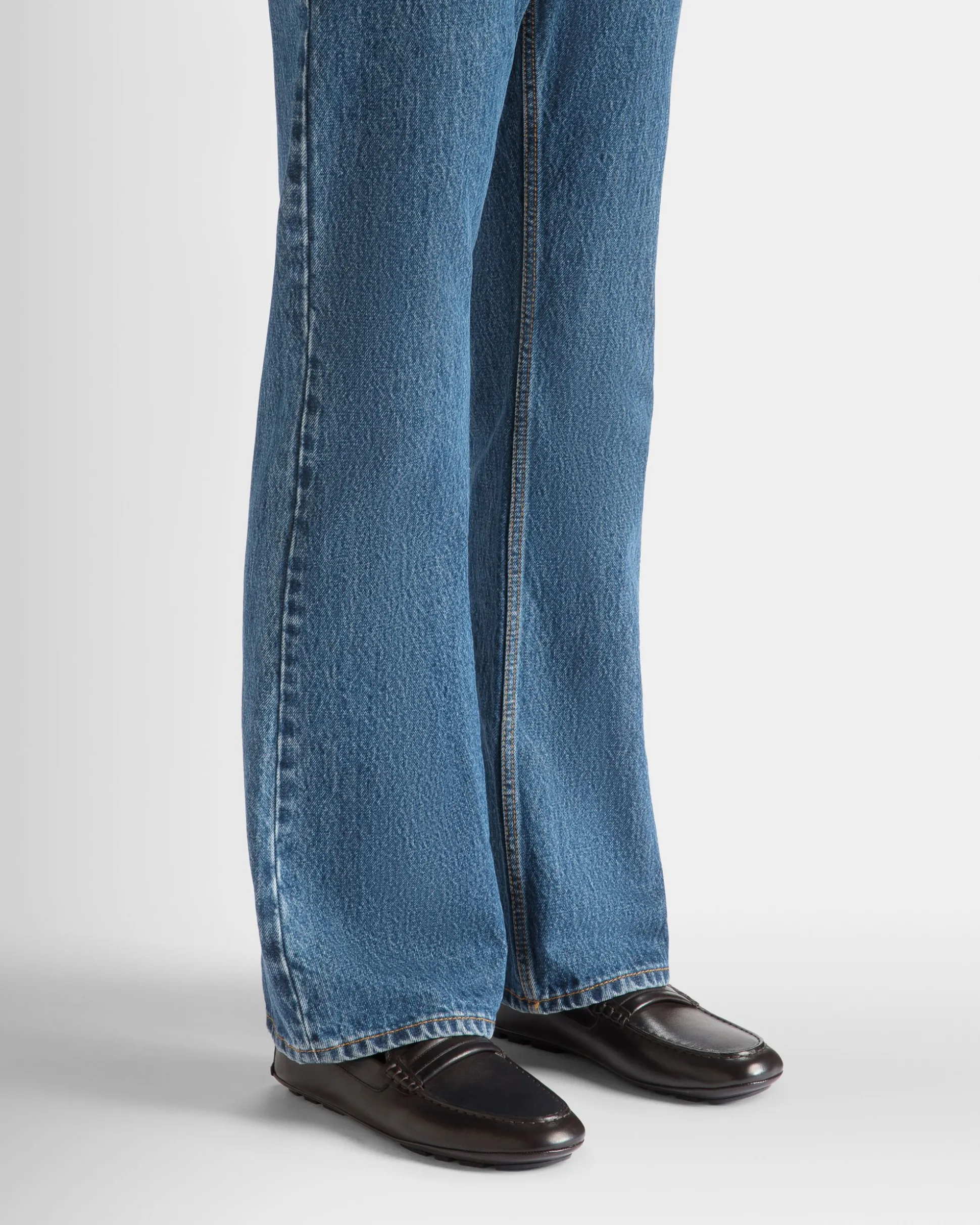 Kerbs driver crafted in sleek ebony leather with a split rubber sole. The apron stitching along the vamp reveals moccasin-level comfort. A debossed Bally logo trims the collar near the ankle.