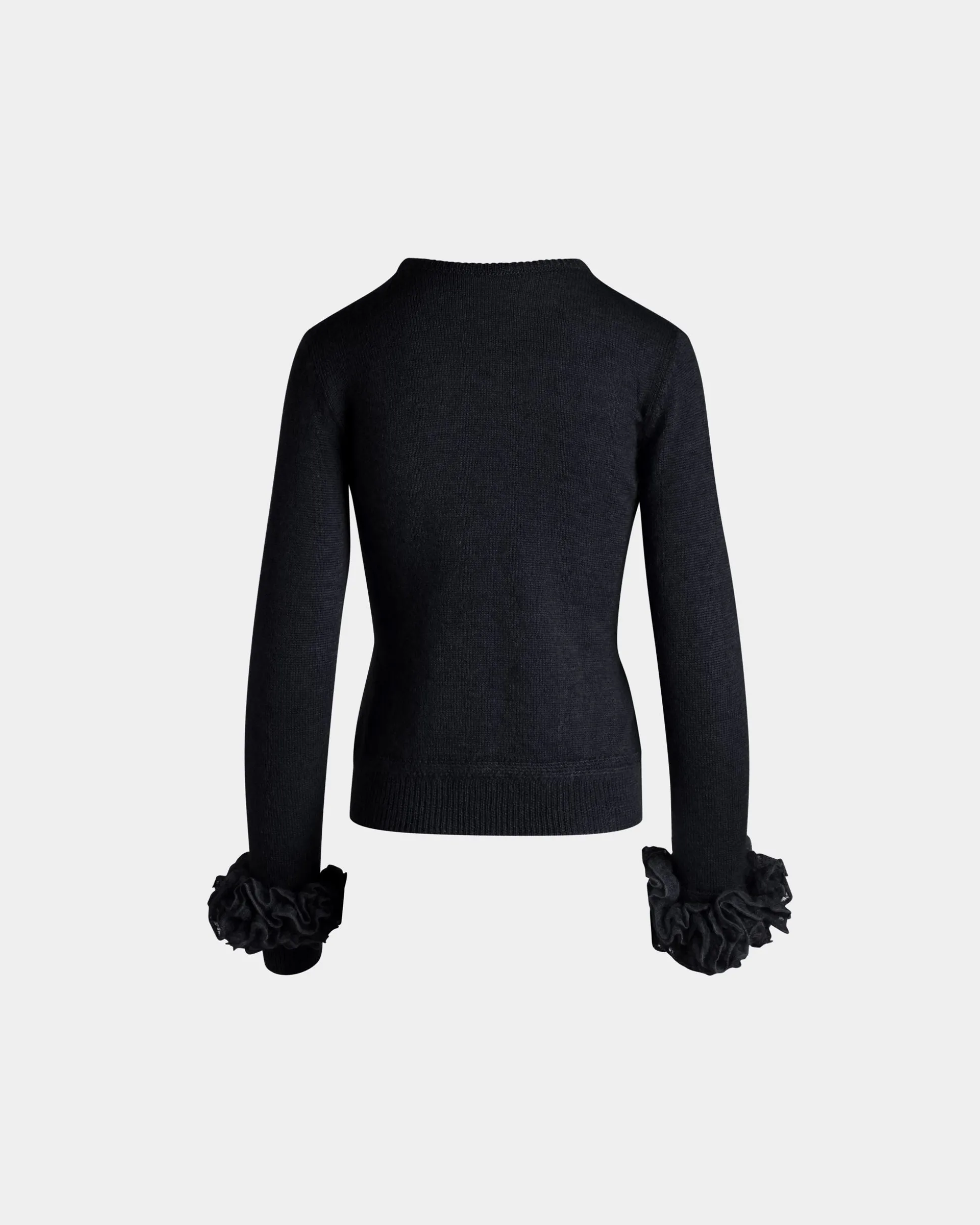 This navy blue long-sleeve knit top is knit from mohair and silk yarn and embellished by frills on the wrists for a feminine touch.