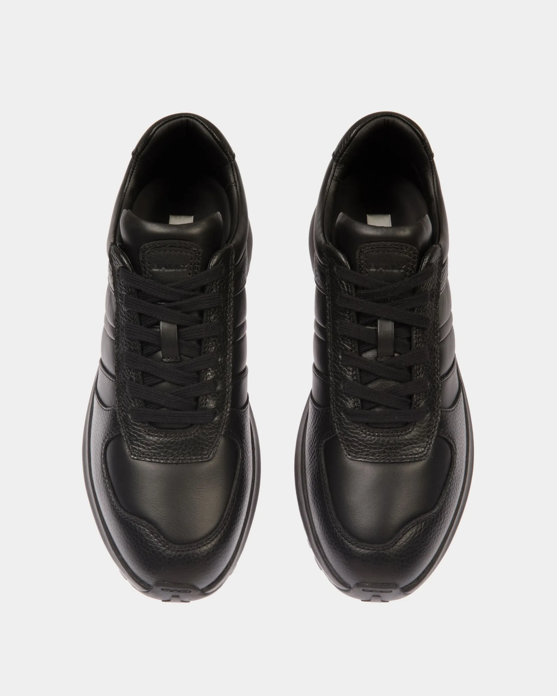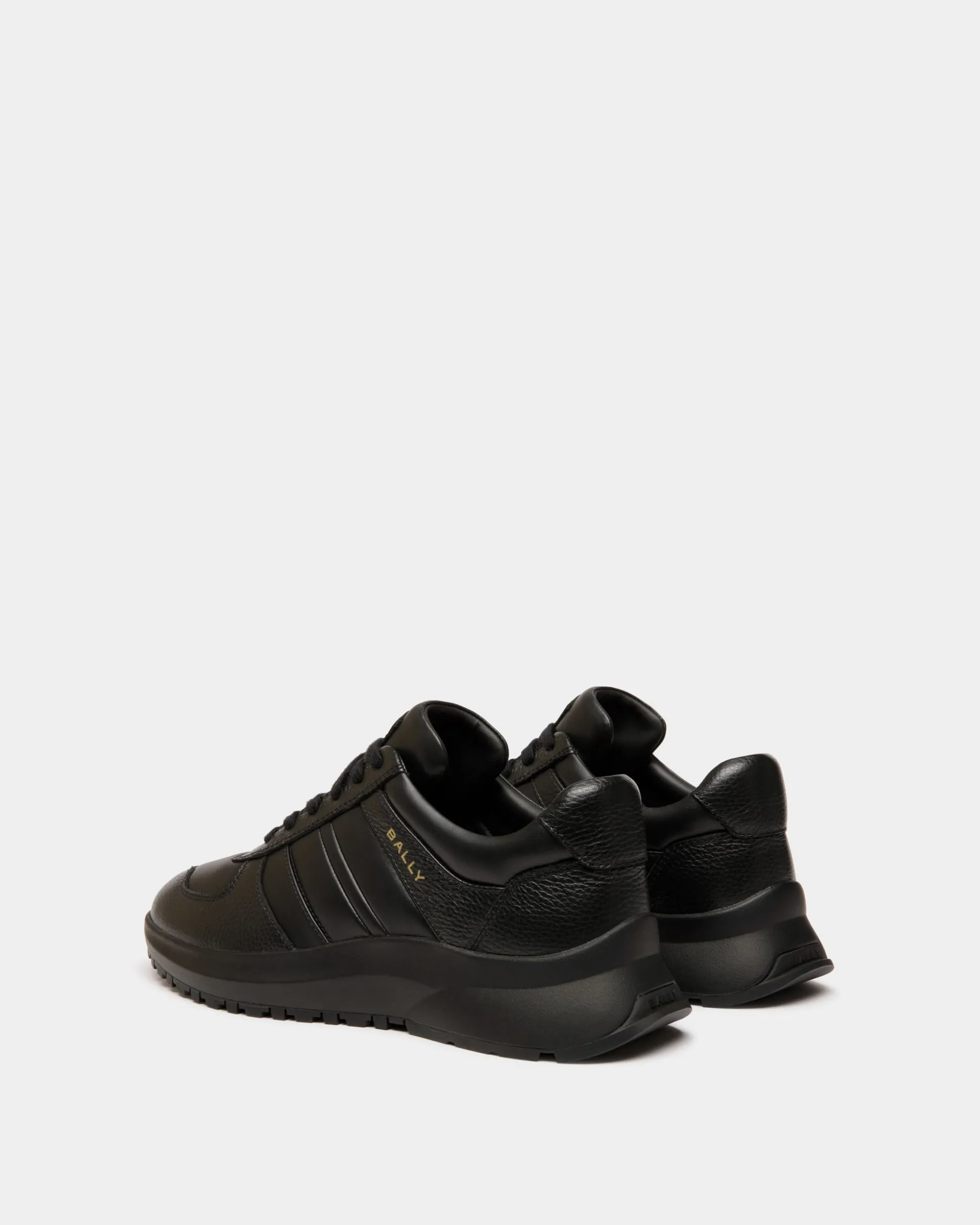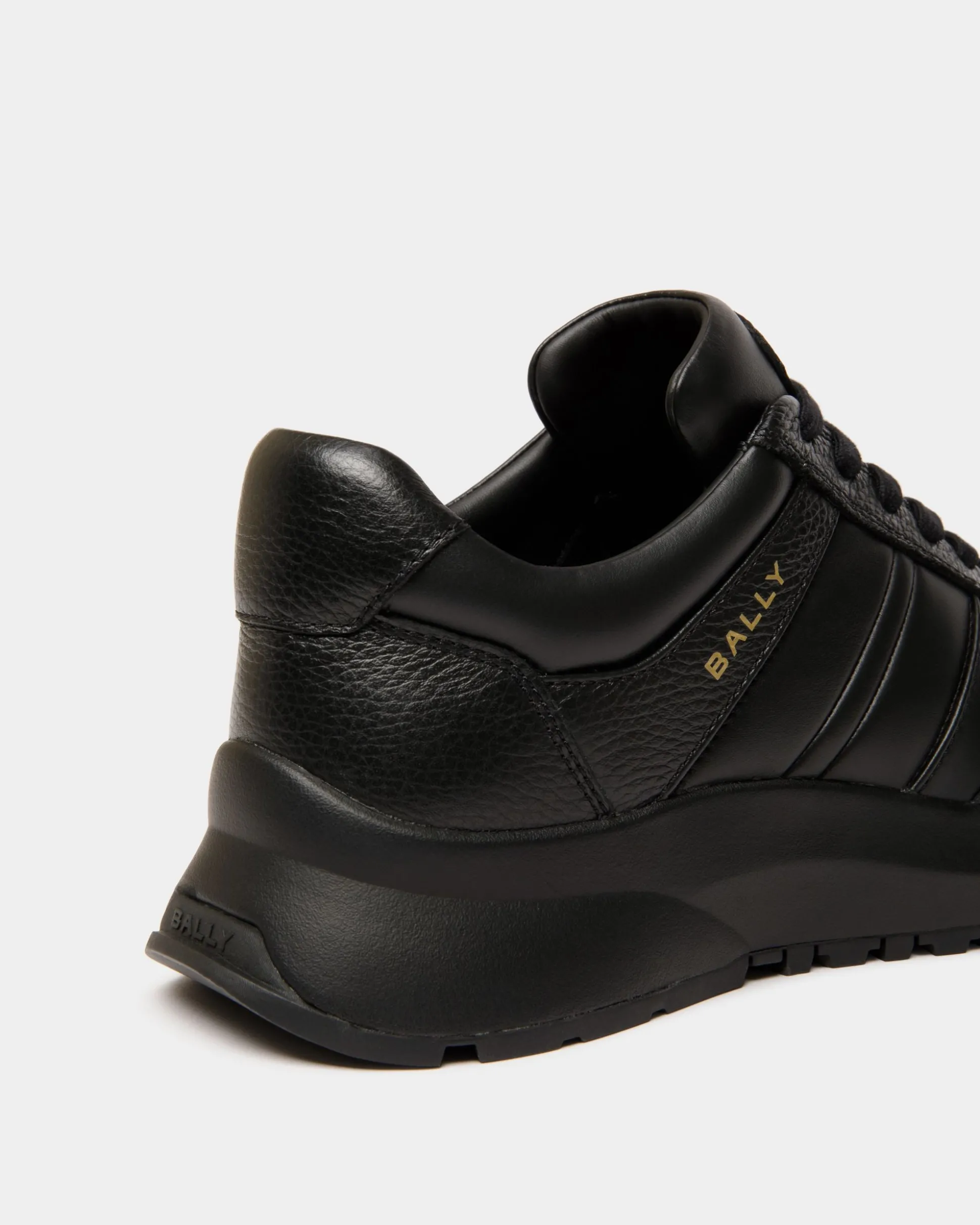 In grained and smooth black leather, this Outline sneaker has a chunky yet lightweight Vibram running sole for all-terrain grip. A gold-foil Bally logo trims the monochromatic Ribbon motif at the side.