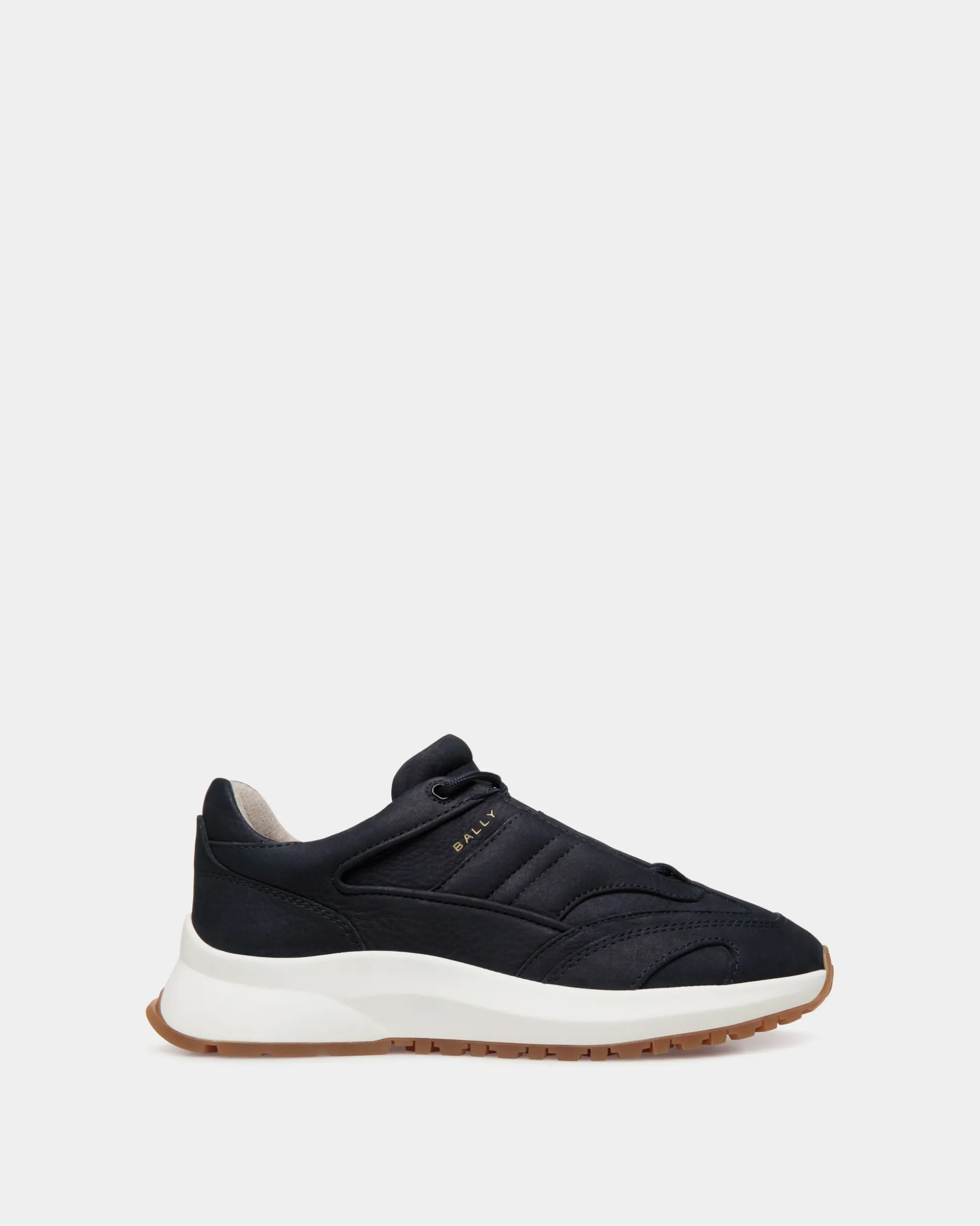 Inspired by running styles, this Outline sneaker in navy blue nubuck is enlivened by panels and stitching that subtly recall the Bally Ribbon at the sides. The thick Vibram rubber sole remains lightweight, with Bally grips on the outsole for all-terrain practicality.