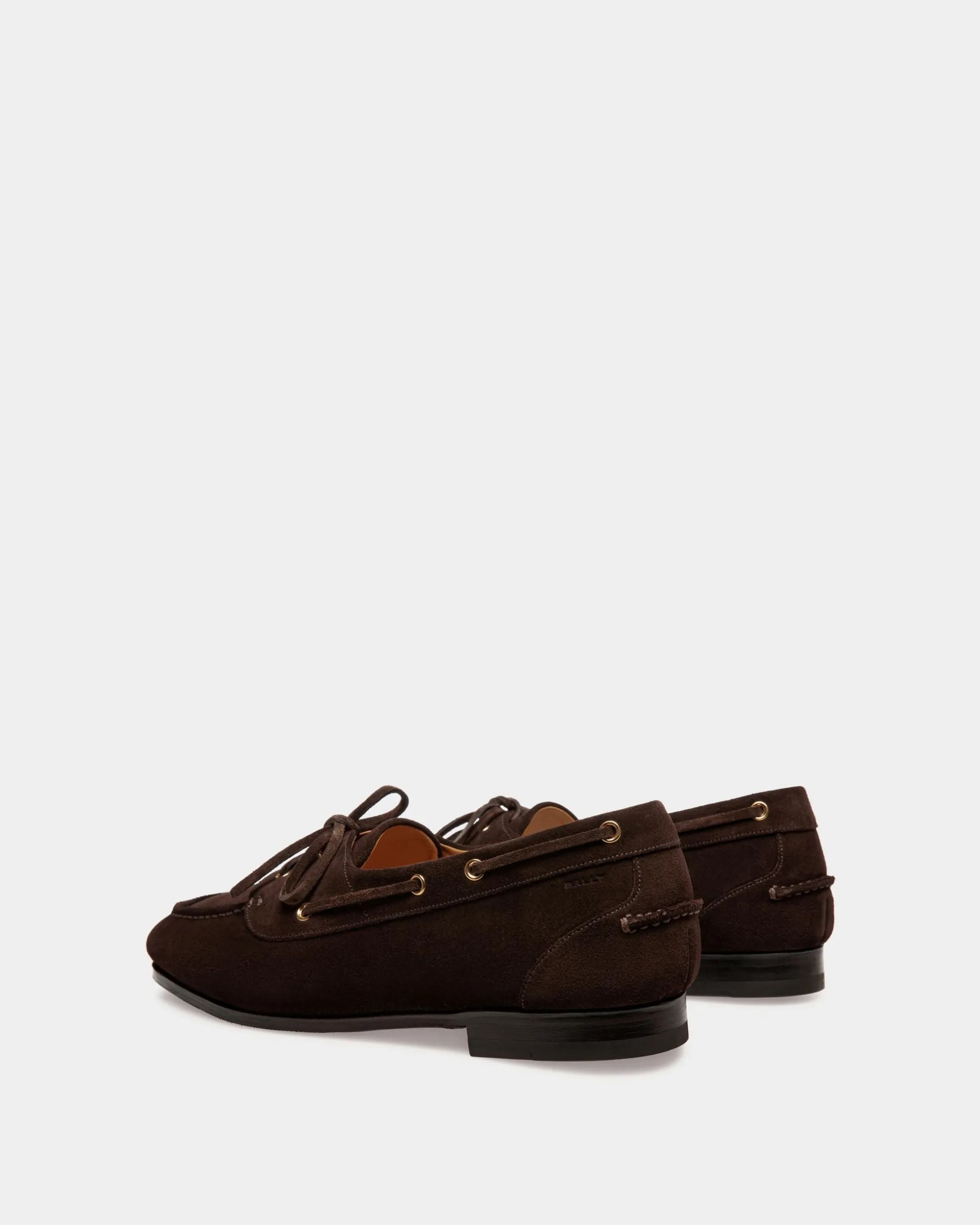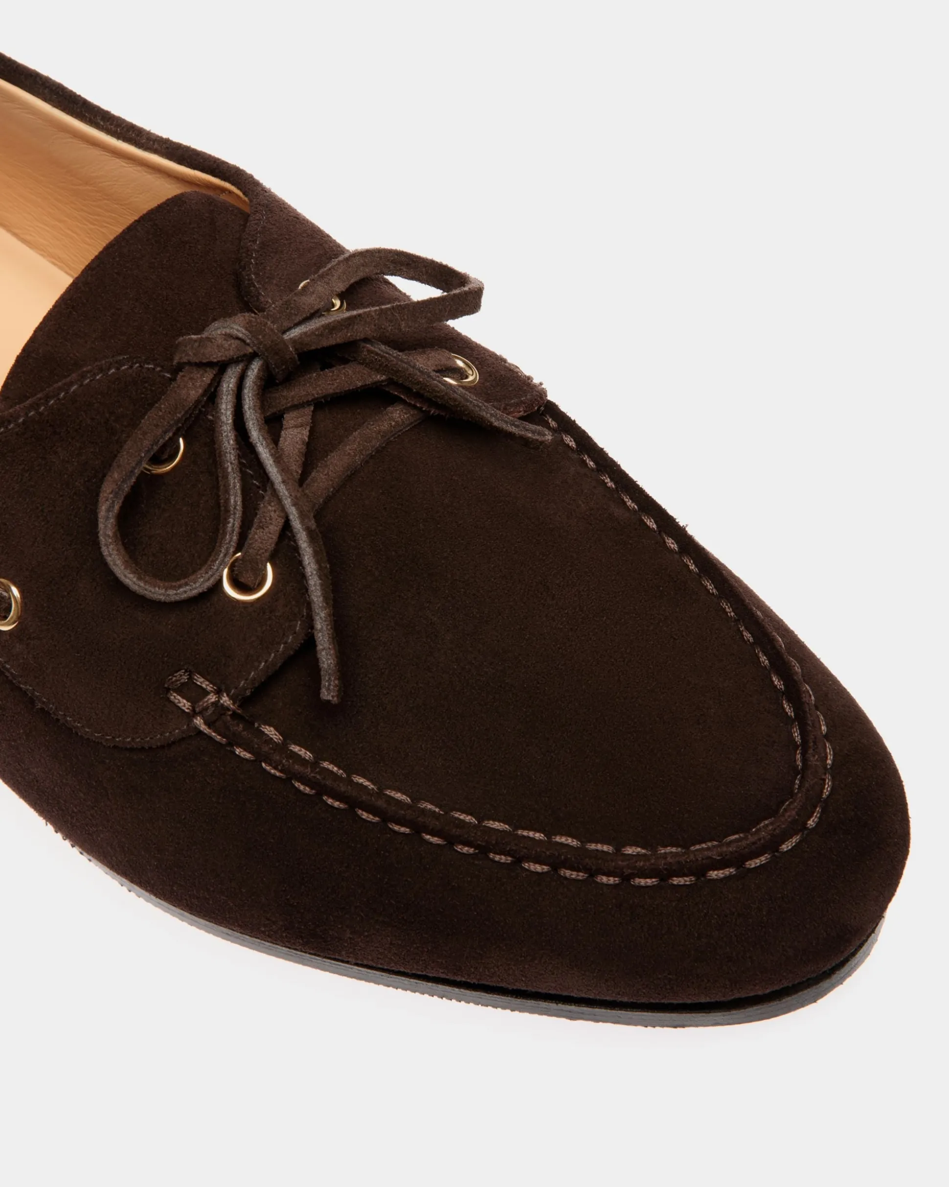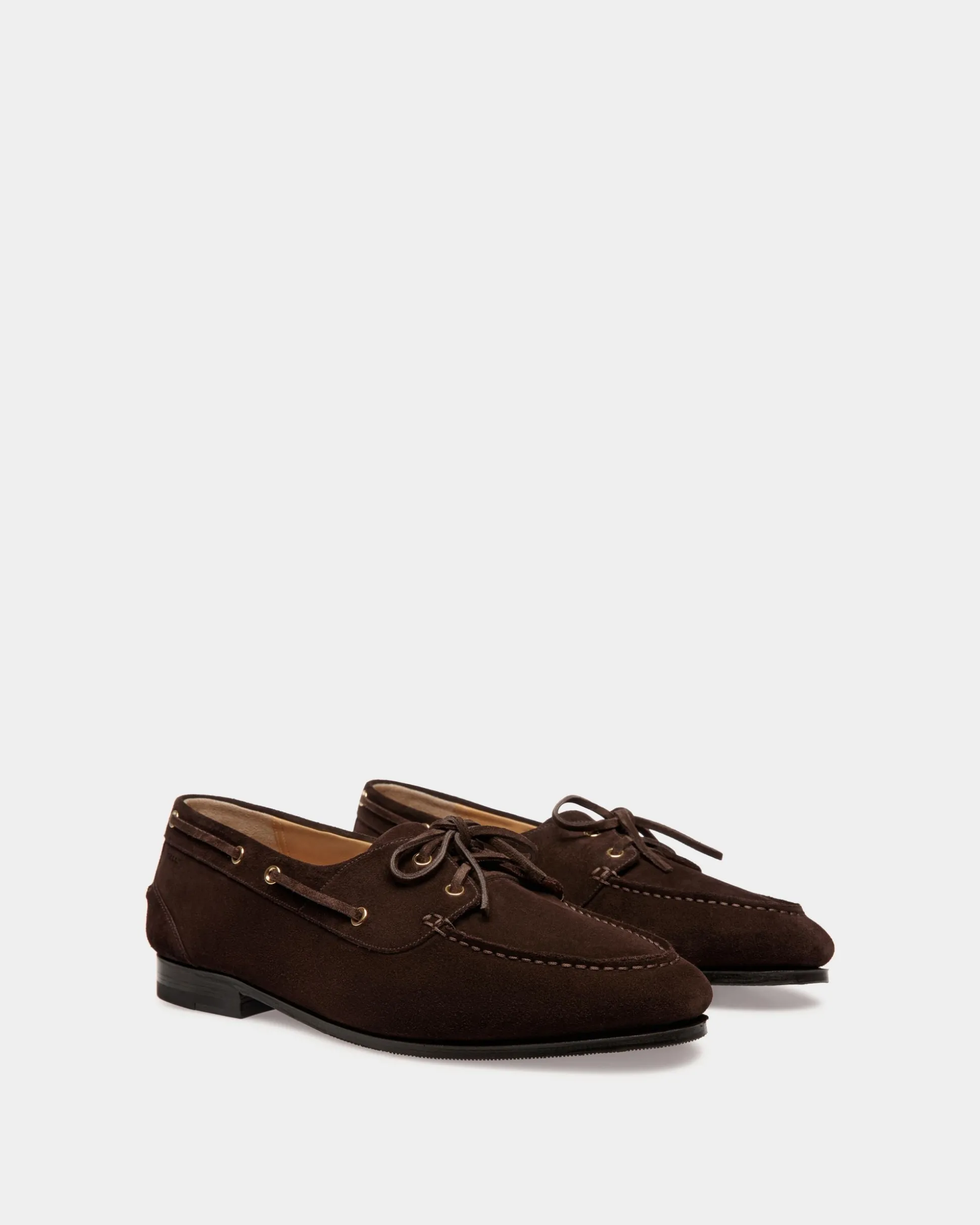 Crafted with precision in Switzerland, the Plume moccasin in a dark brown hue is made from luxurious calfskin with a suede finish. These shoes feature the aesthetics of boat shoes set onto a more formal sole.