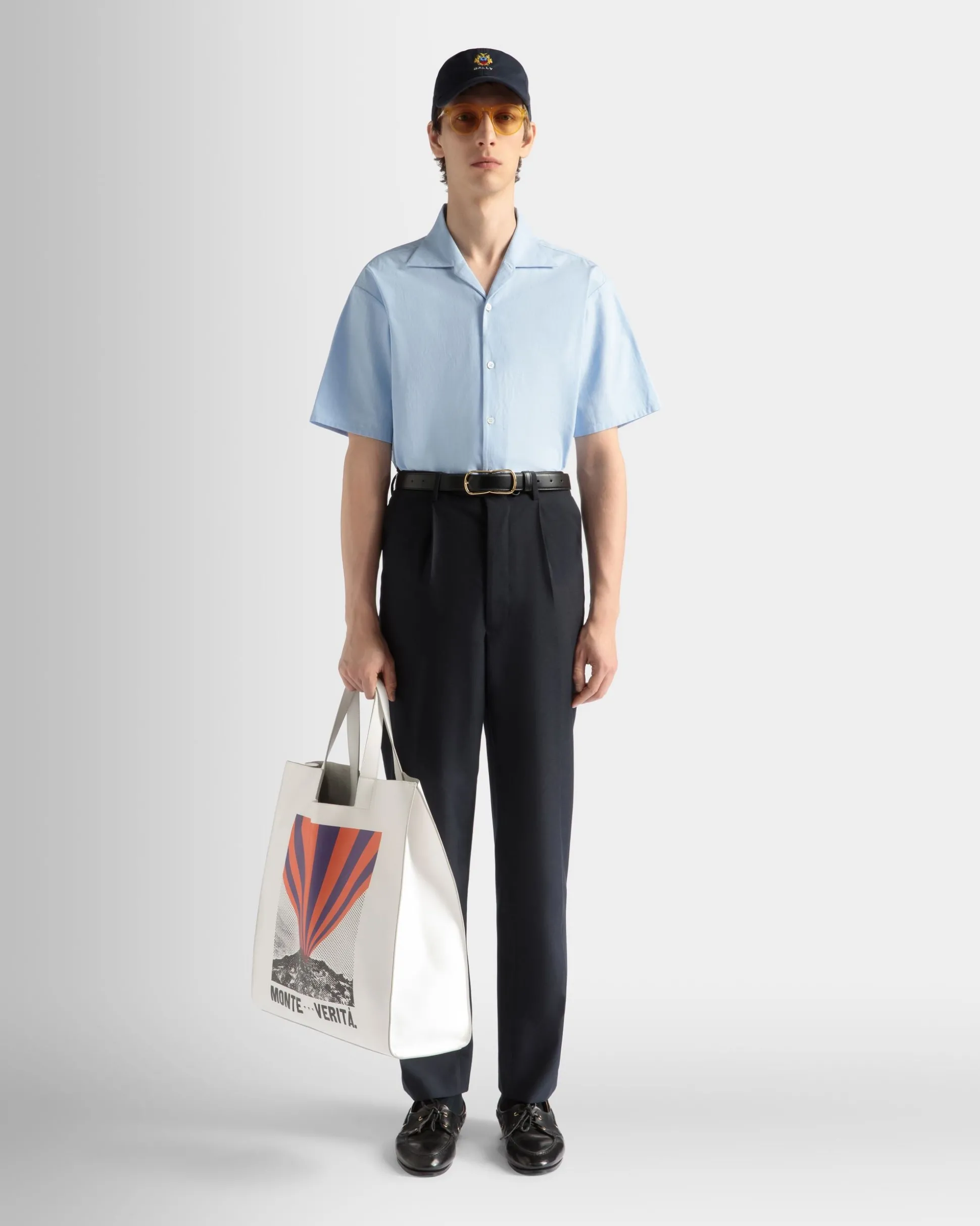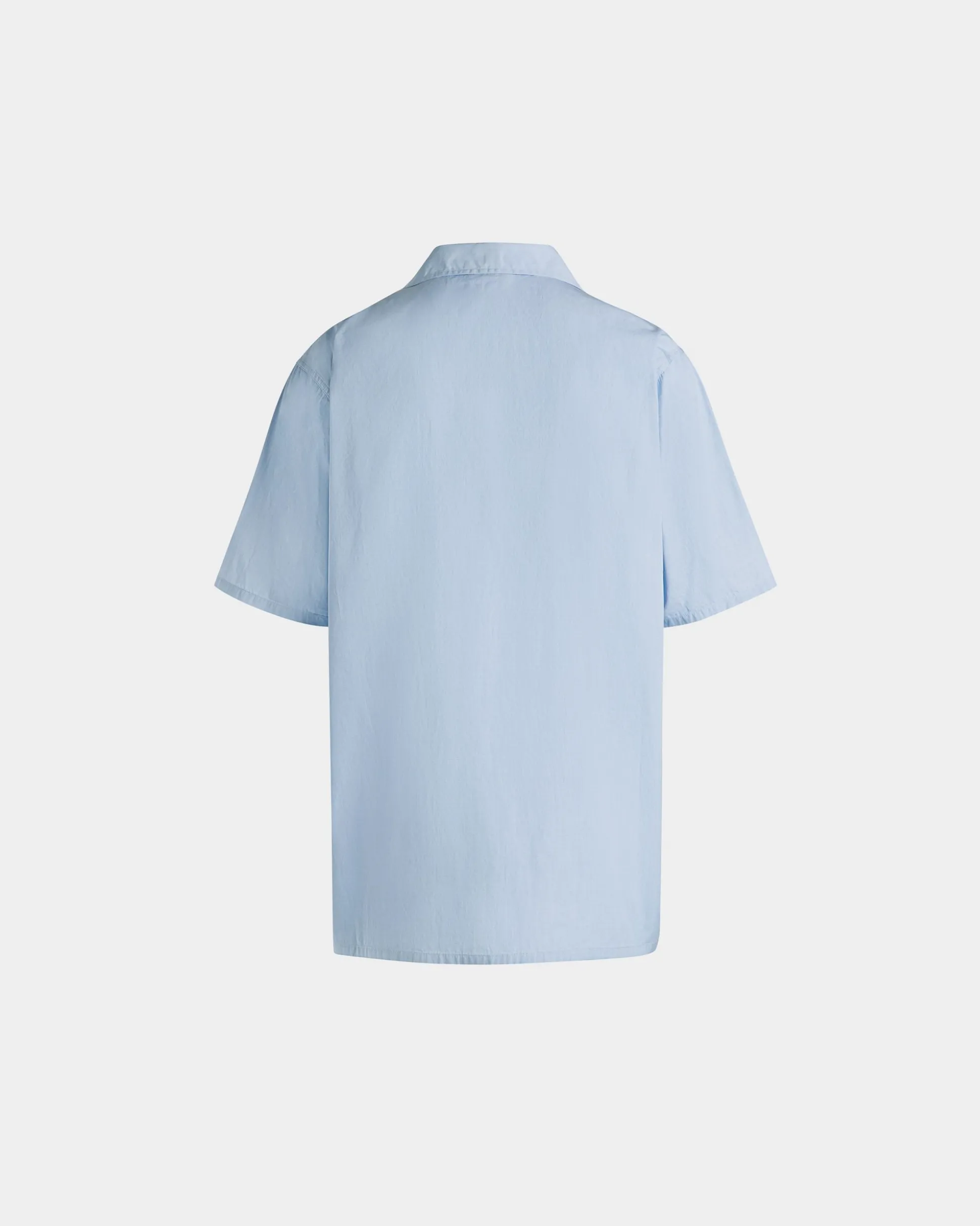 Light blue collared shirt in finest cotton. Just preppy enough, an embroidered Bally shield trims the left sleeve. Six buttons fasten the front.