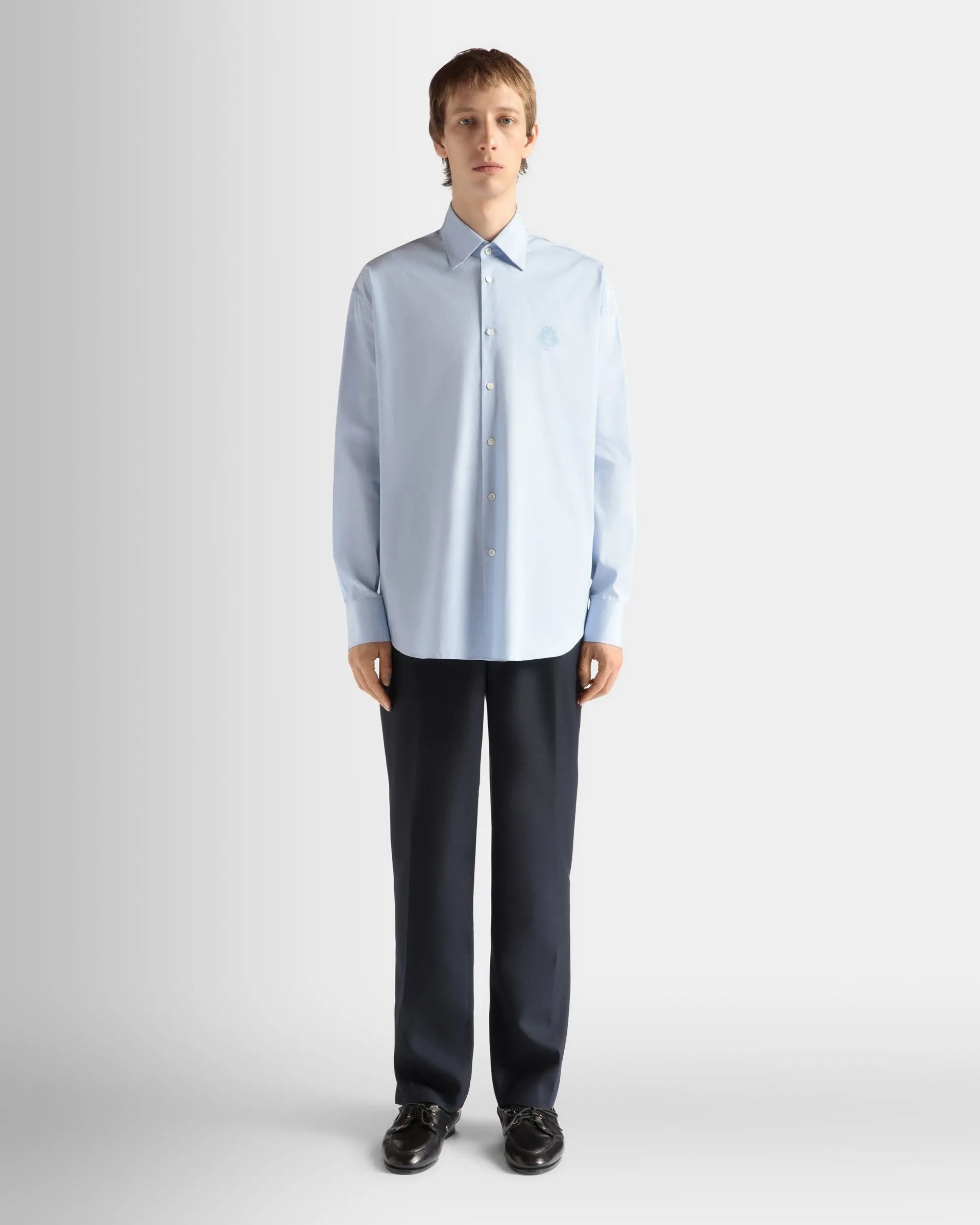 Understated elegance is at the core of this light blue cotton shirt. The perfect blend of comfort and essential luxury, it features a pointed collar, button fastening and button cuffs.