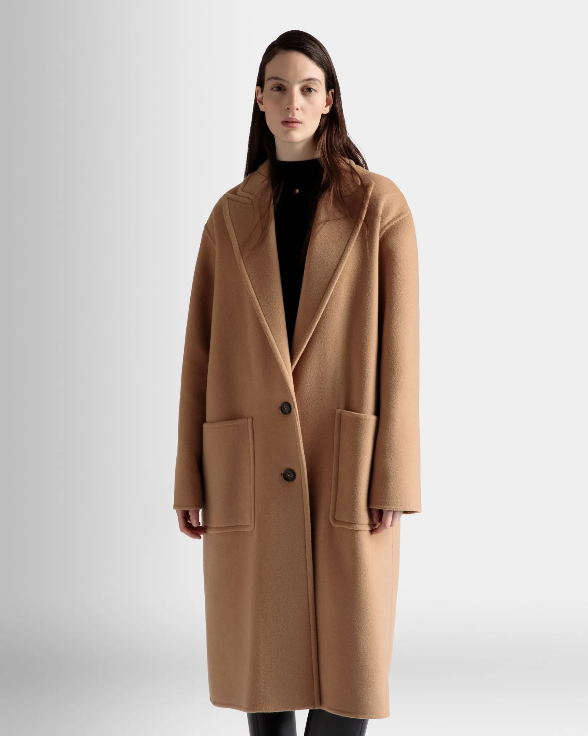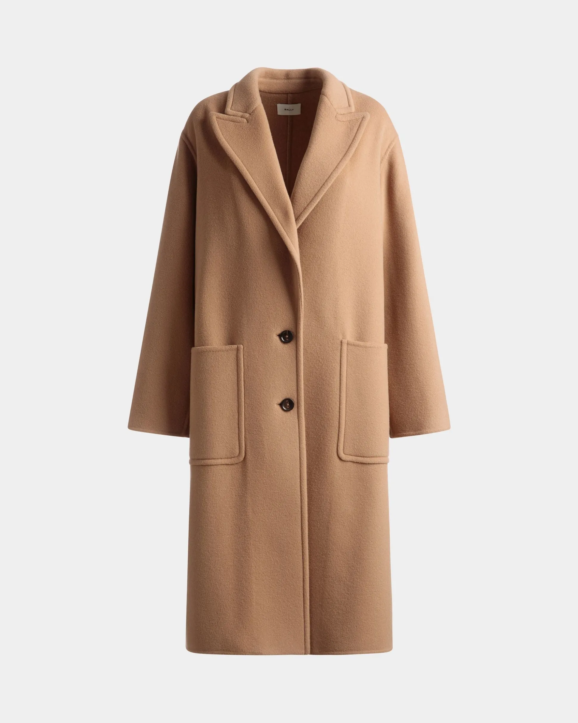 A luxurious outerwear staple, this camel-hued single-breasted coat is relaxed in fit, with oversized front pockets, two buttons, and a large collar.