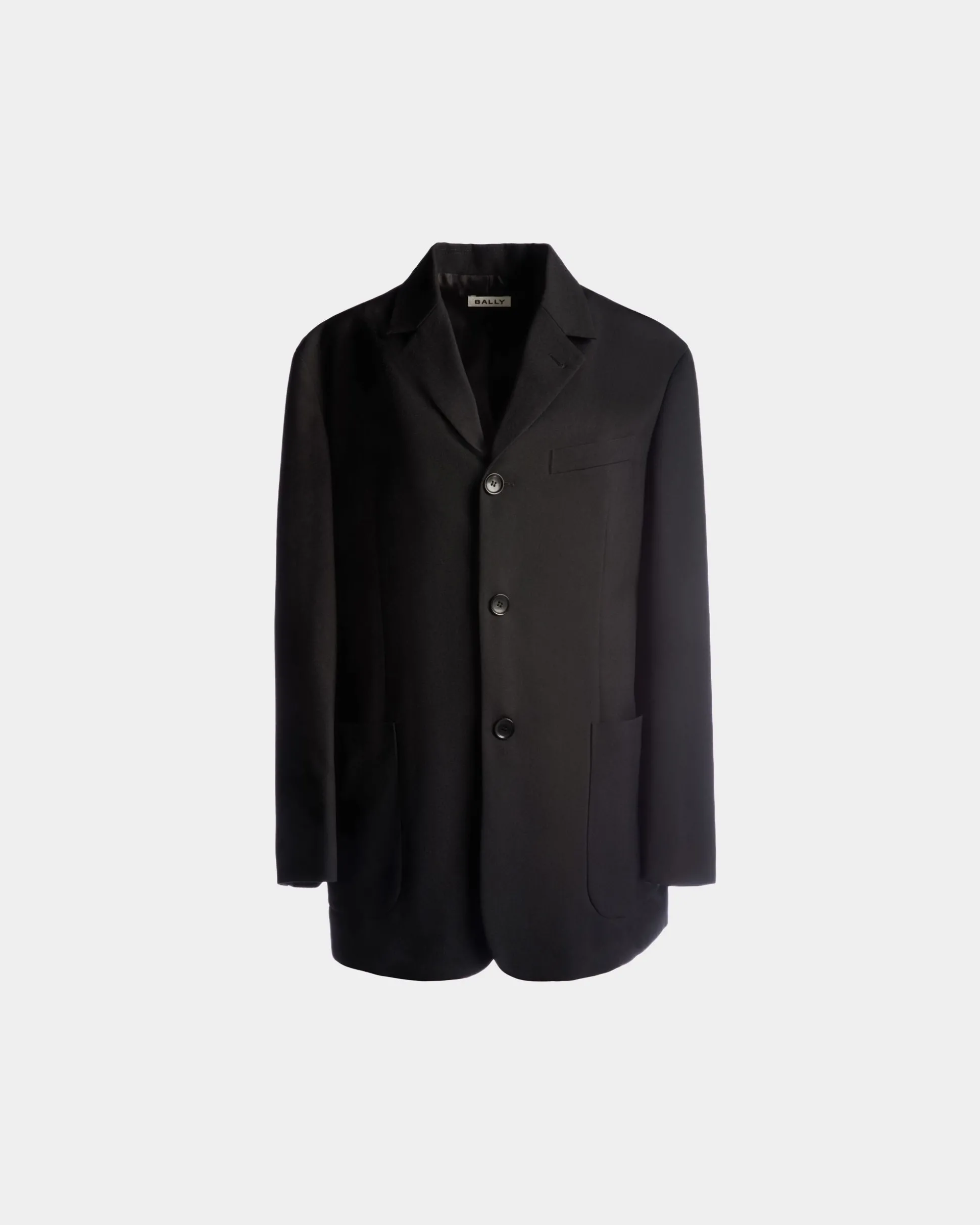 Pared back and essential, this single-breasted black wool jacket is made in Italy. Horn buttons close the front.