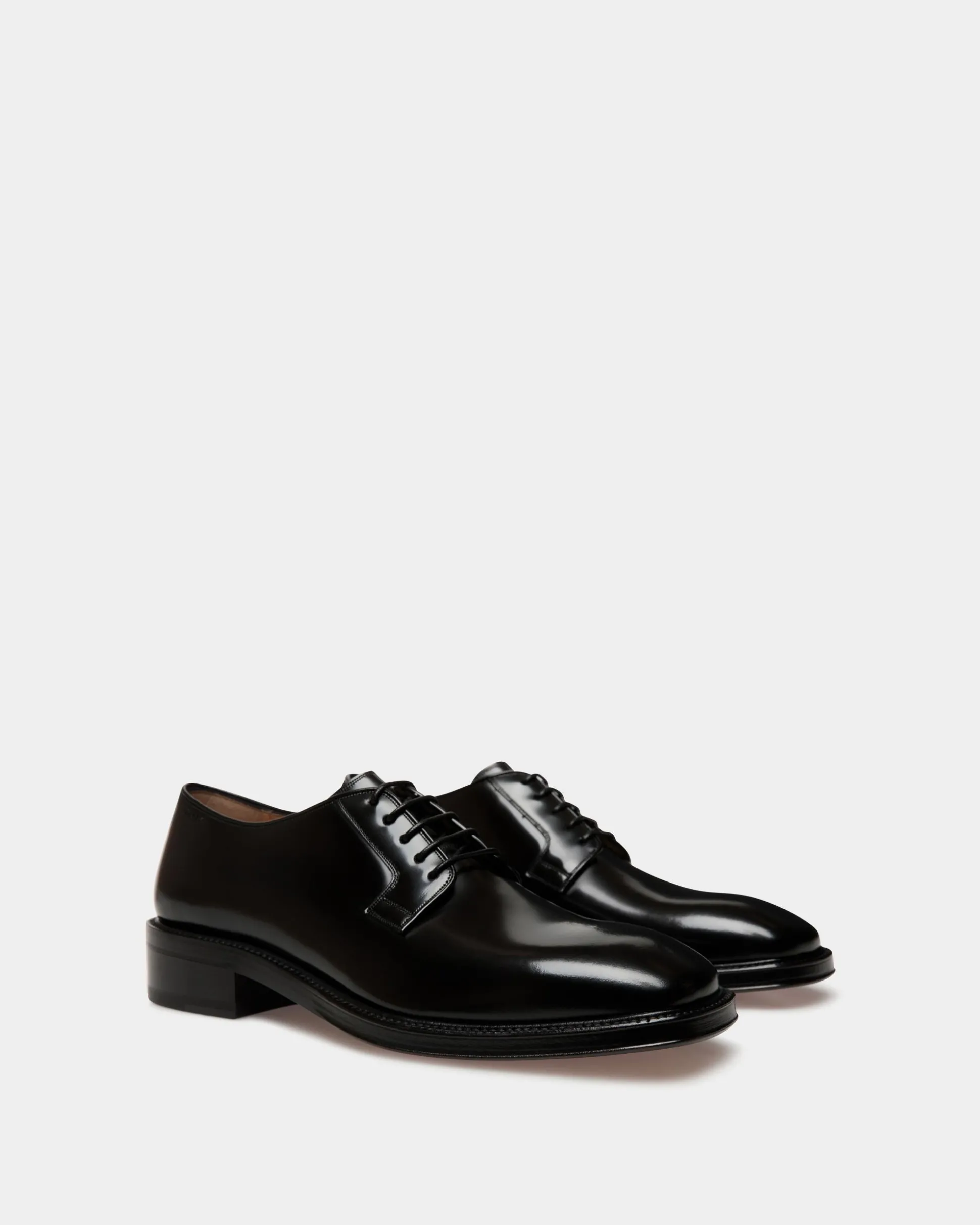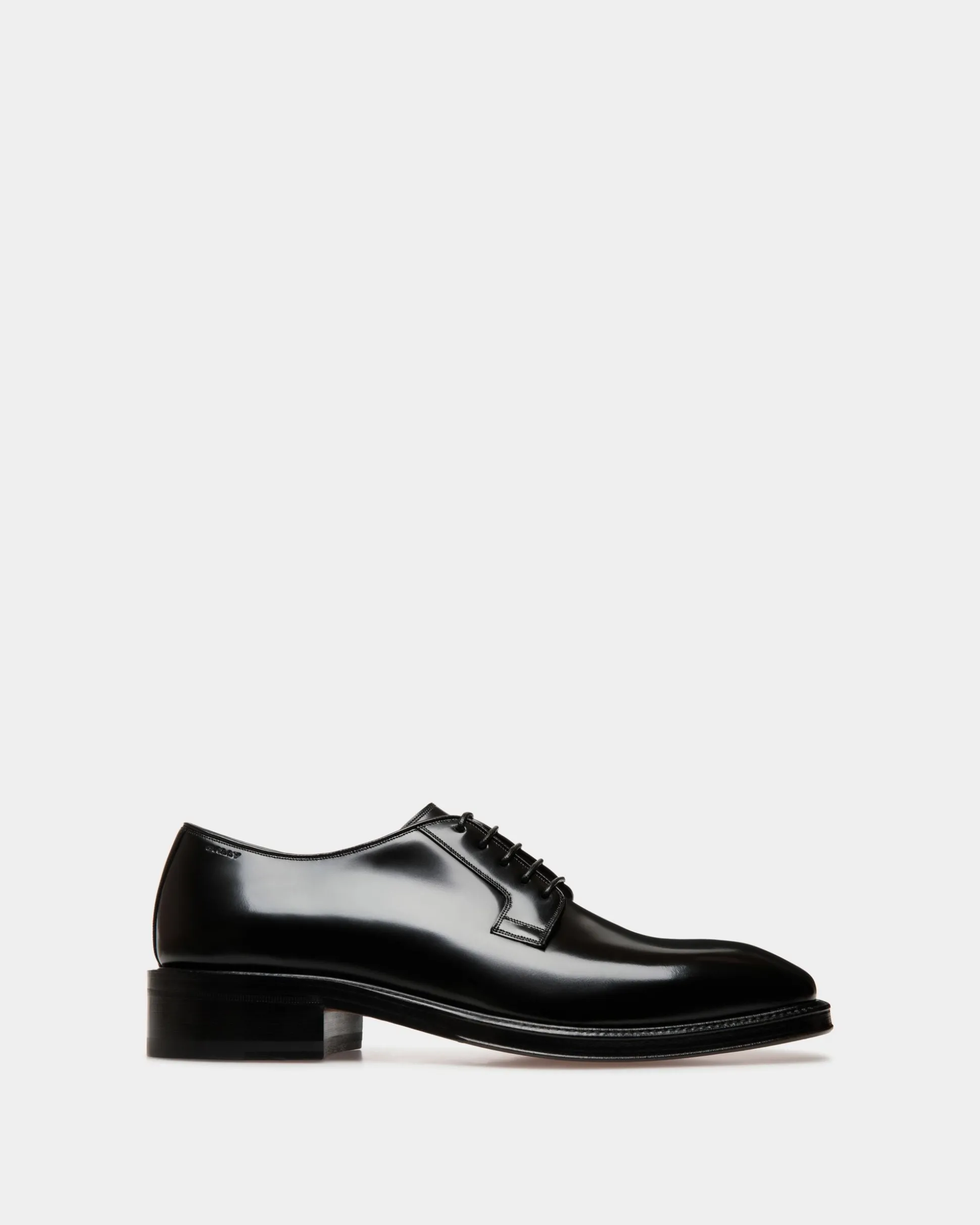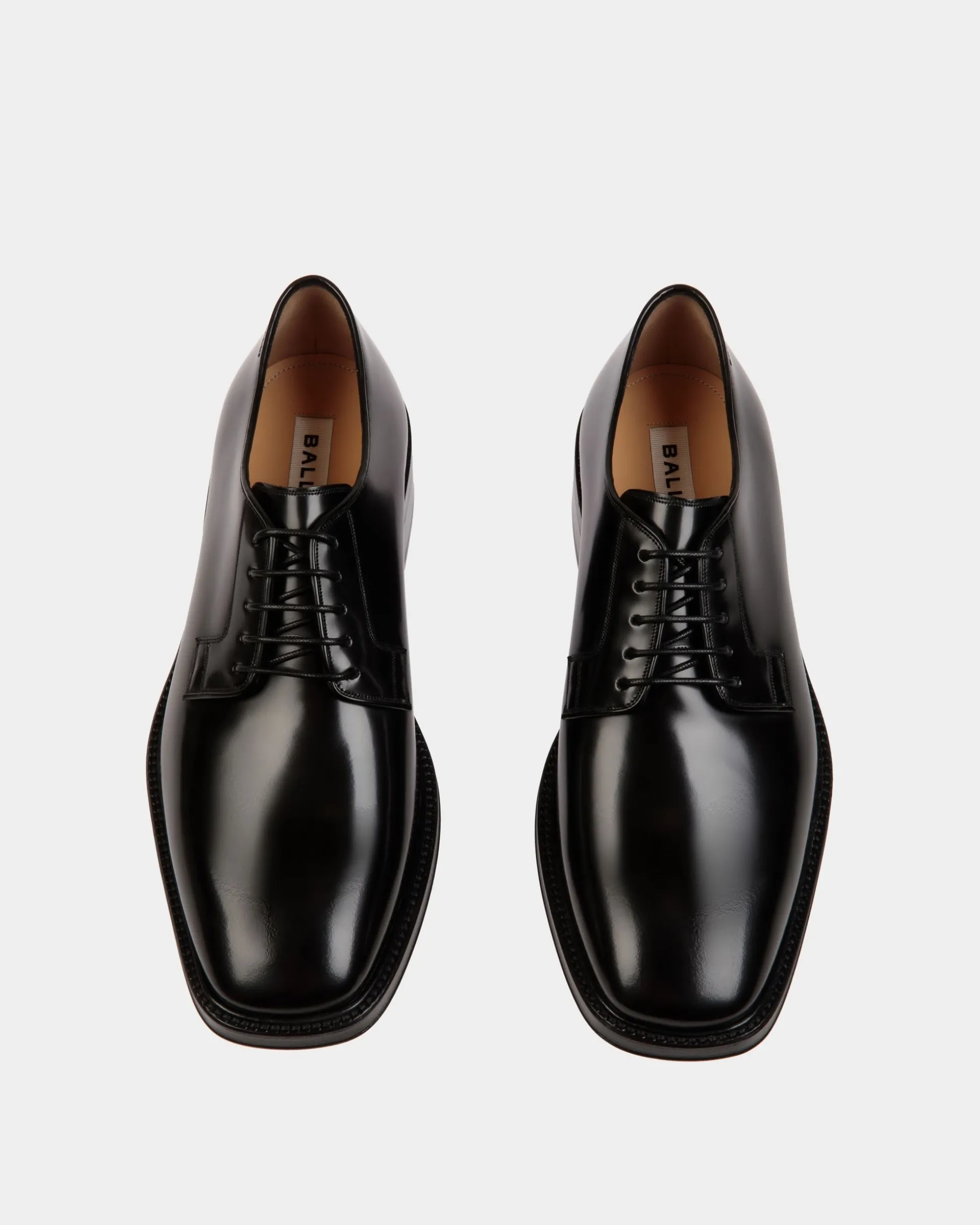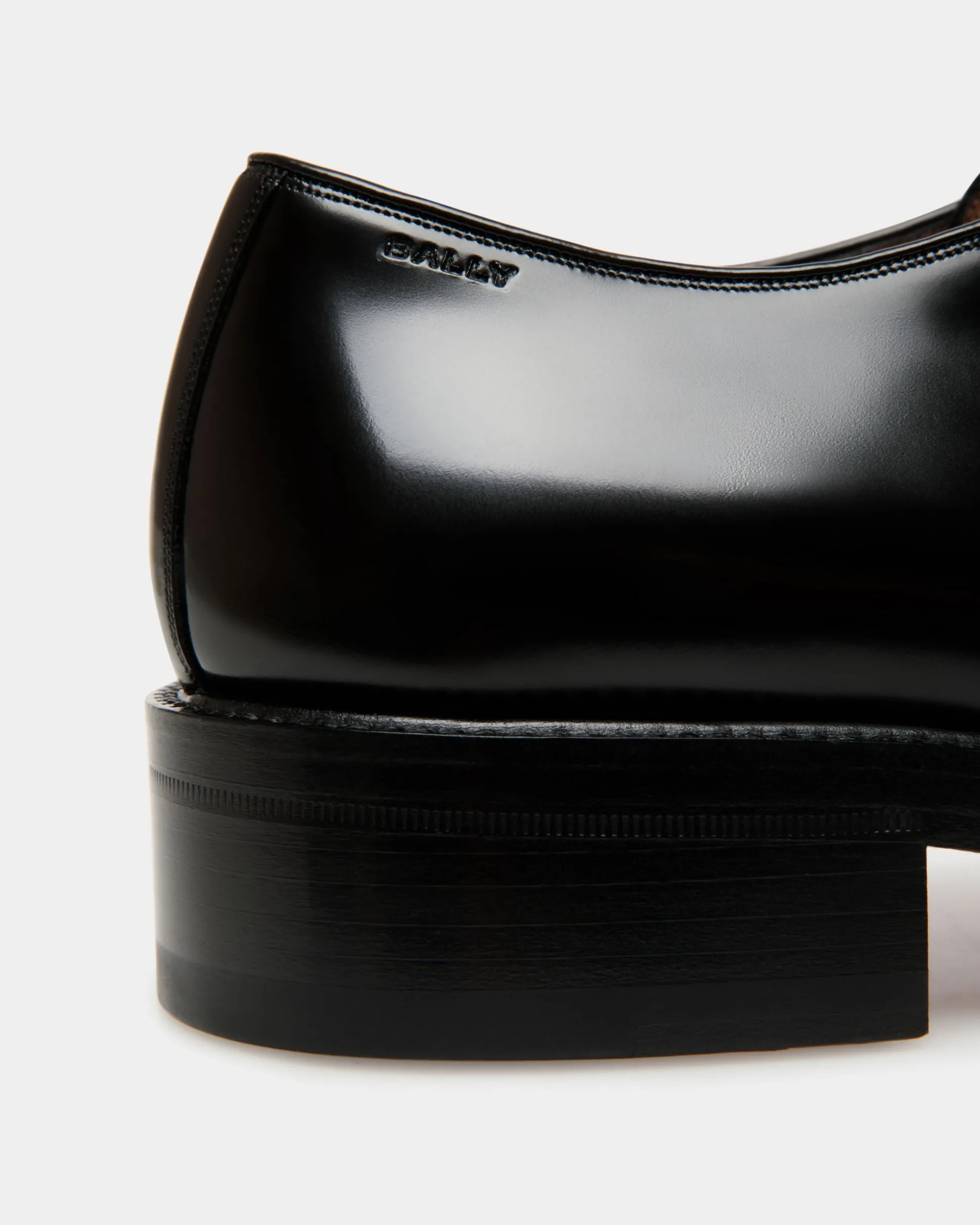 The Sockel derby shoe in black calfskin features a square toe and a stacked heel for decisive character. A discreet debossed Bally logo trims the opening at the heel.