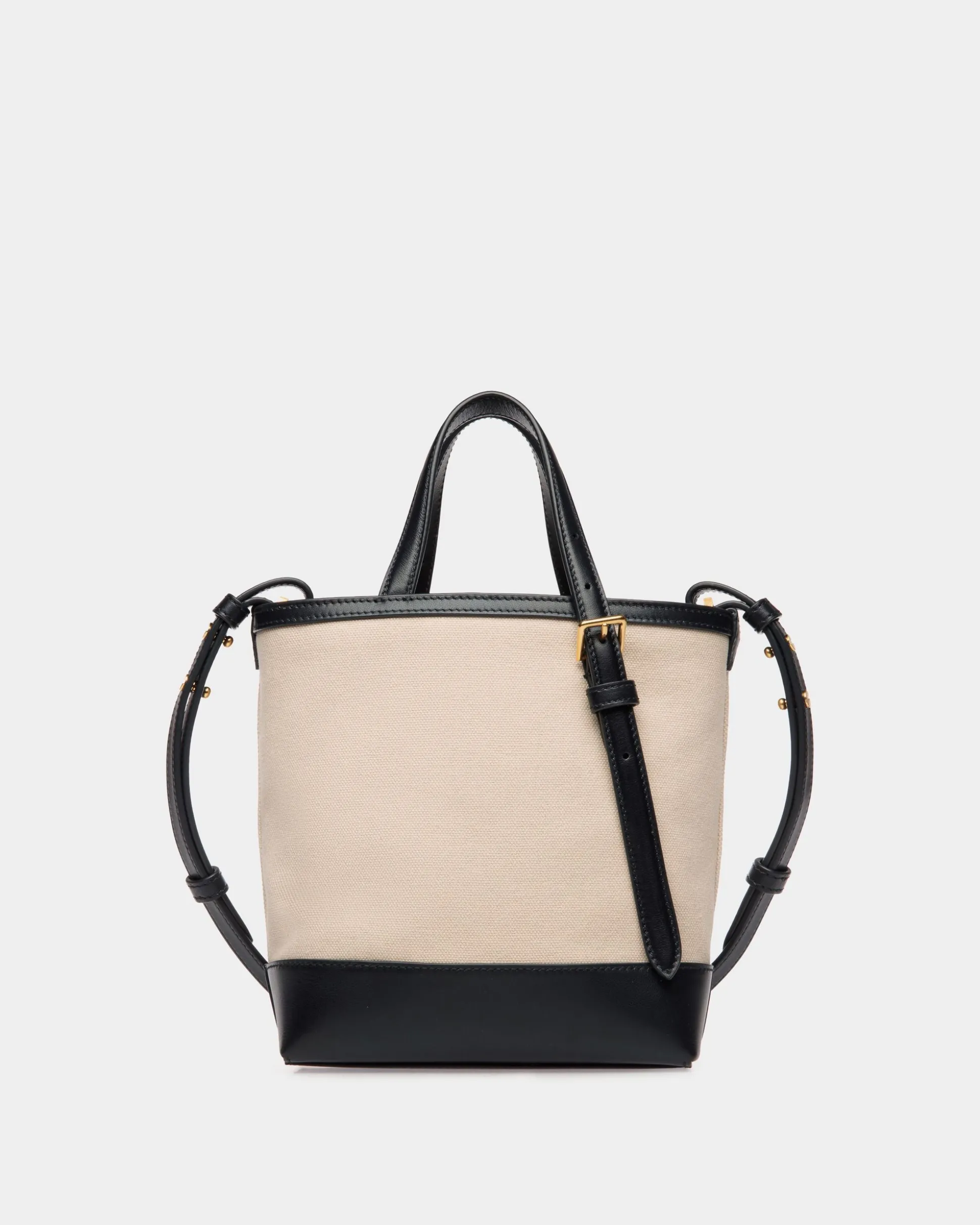 In a blend of natural canvas and navy blue leather, the compact silhouette of this summery tote bag features a detachable/adjustable shoulder strap and vintage lettering. Two top handles offer a range of carry options: shoulder, cross body and hand.