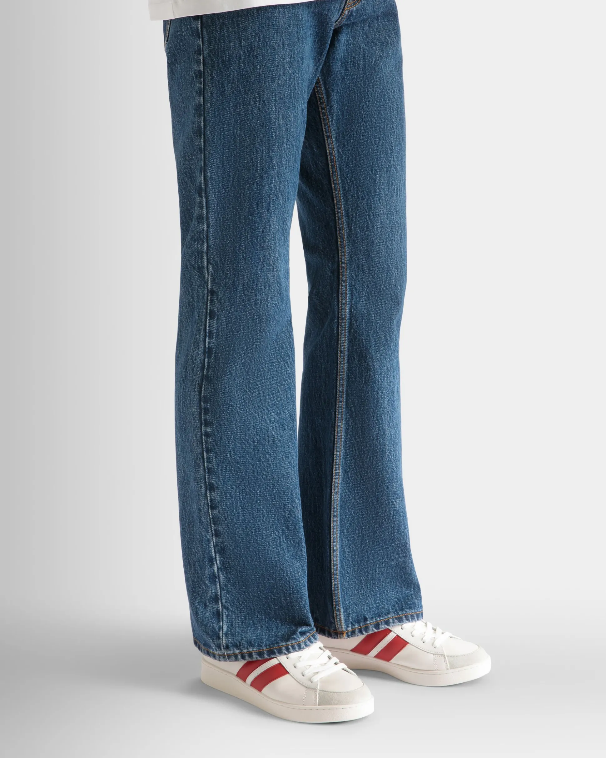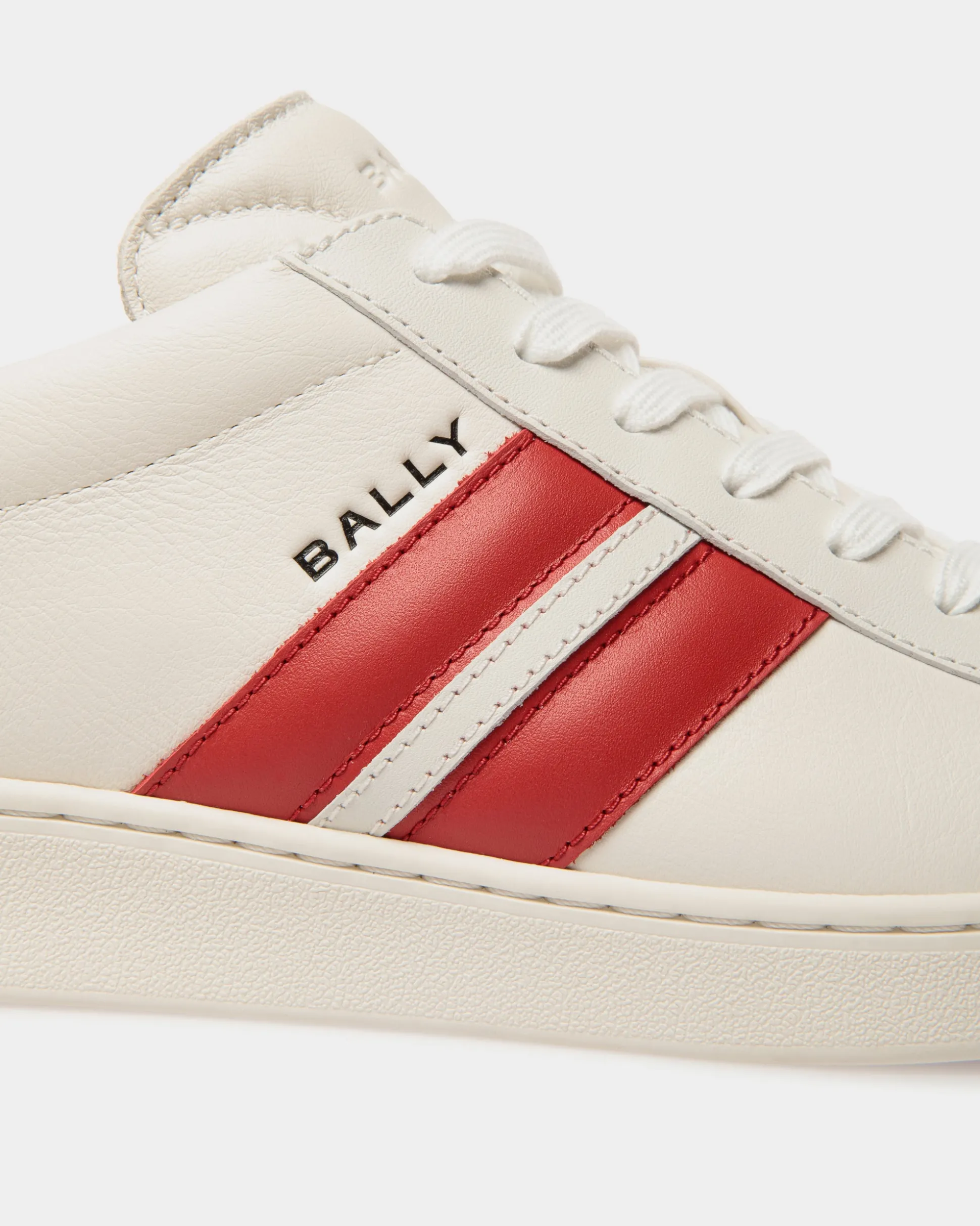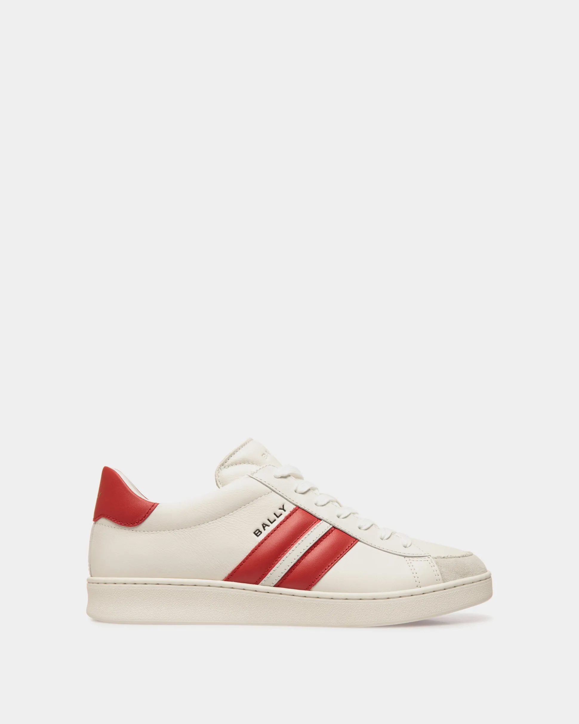 Crafted from premium white leather and finished with a classic rubber sole, these sneakers offer a modern twist on a timeless design. The Bally Ribbon and heel tab in candy red add a pop of color in a nod to Swiss heritage.
