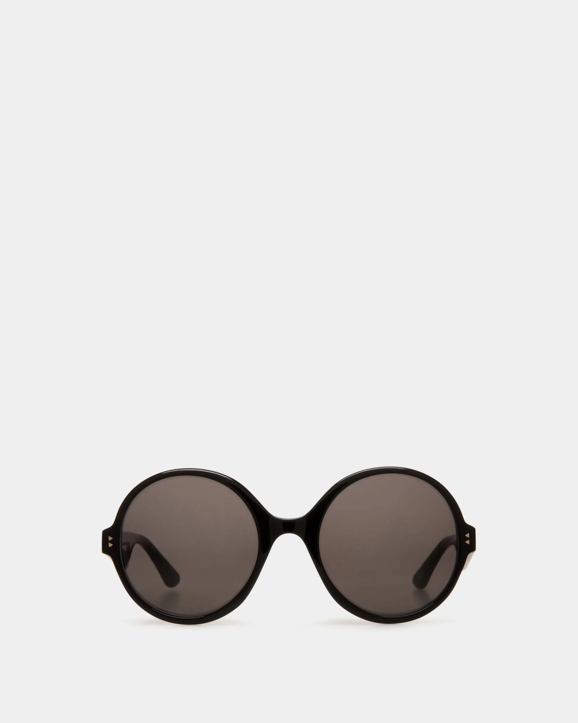 The oversize round lenses of the Ursula sunglasses are bold, curvaceous and iconic. Seen here in black acetate with black lenses, their sculptural quality is complemented by the equally voluptuous temples, trimmed by the Bally logo.