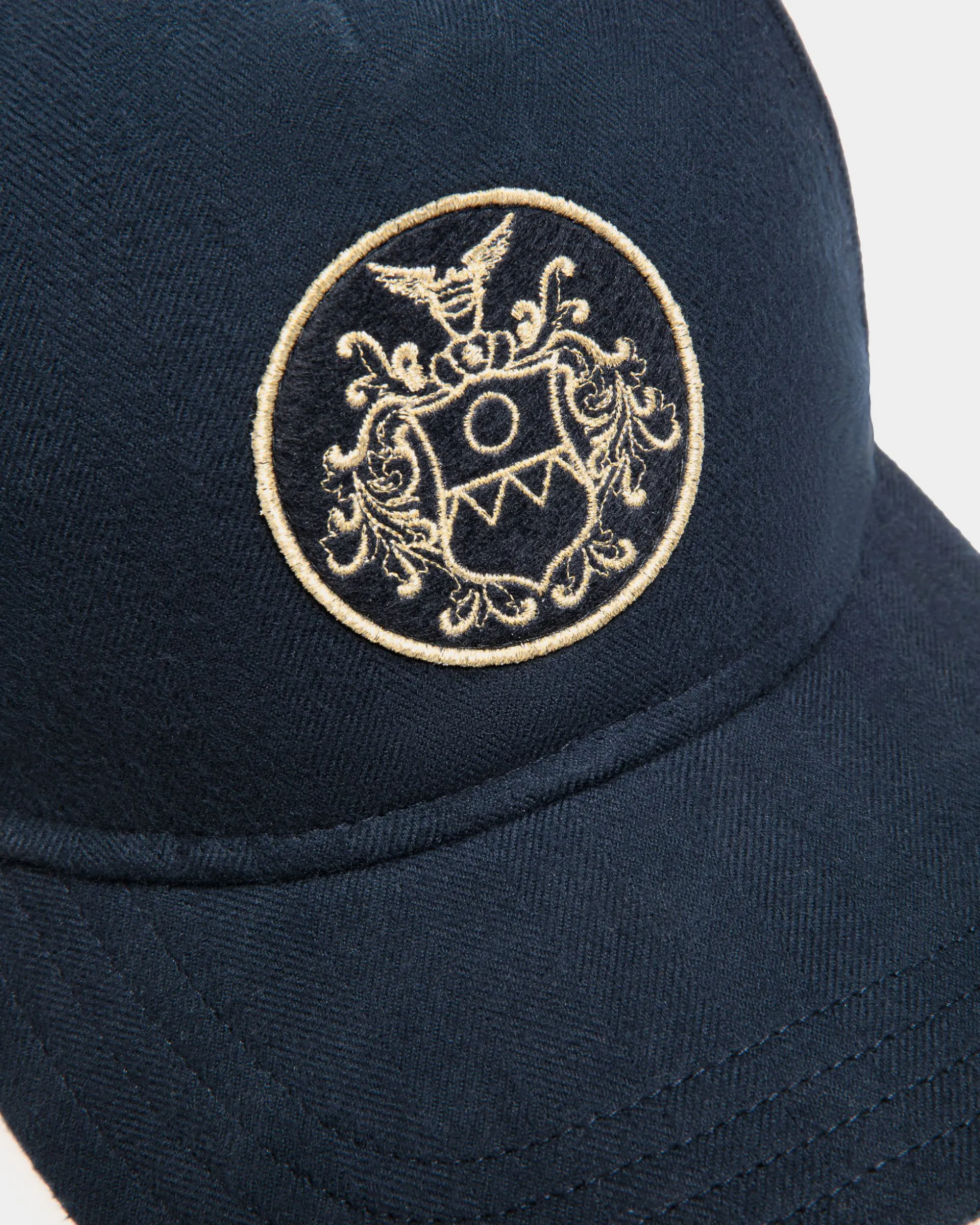 An embroidered Bally Crest adds interest to the front of this baseball hat in navy blue woven cotton.