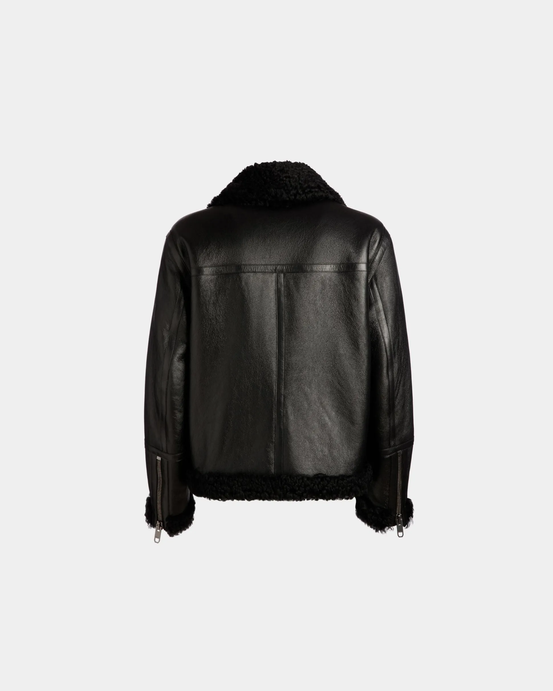 This black leather jacket from the Adrien Brody Travel Collection is trimmed in warm shearling and has ample pockets with metal zippers.