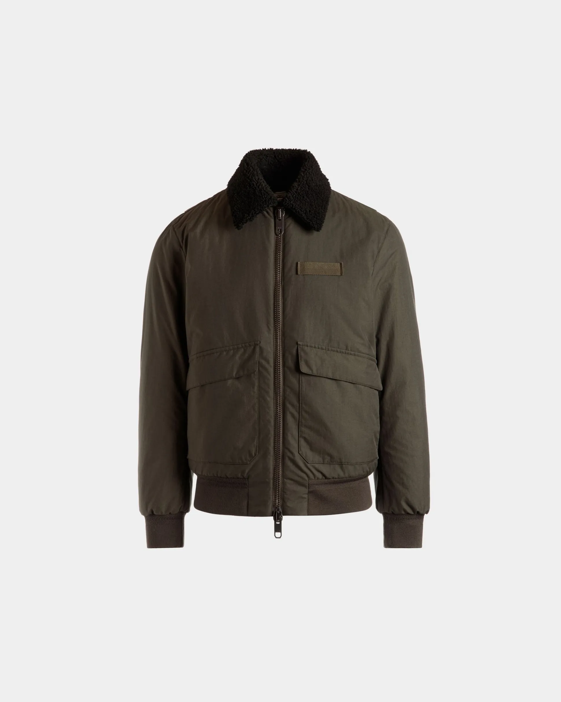 Adrien Brody has lent his discerning eye to the design of this jacket in olive green nylon cloth. Roomy patch pockets, a metal zipper and warm shearling on the collar attest to its travel-ready character.