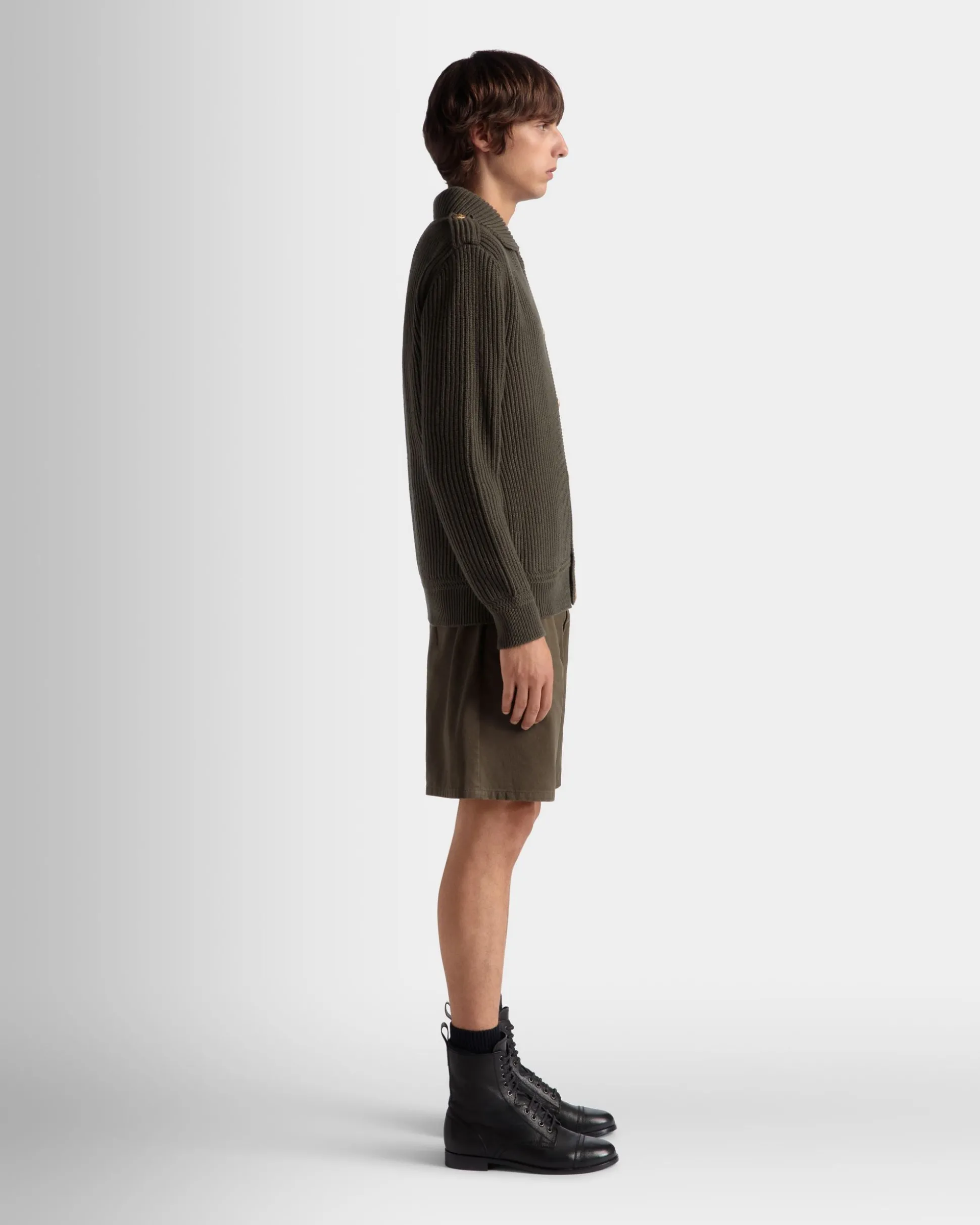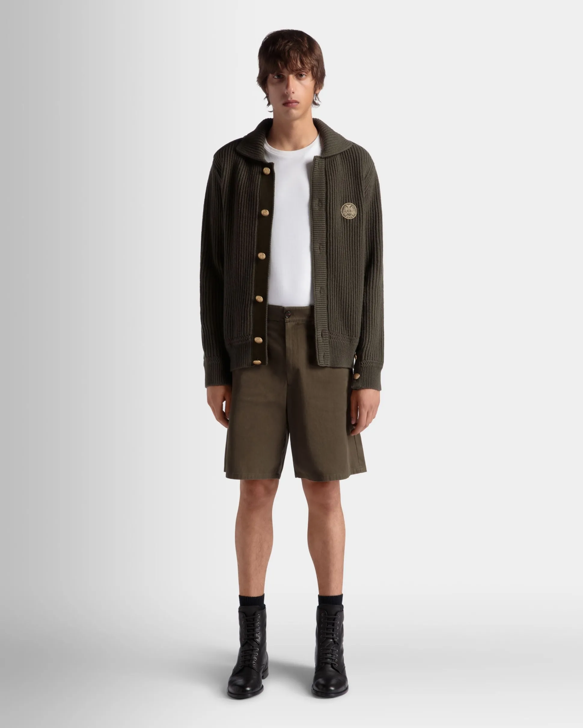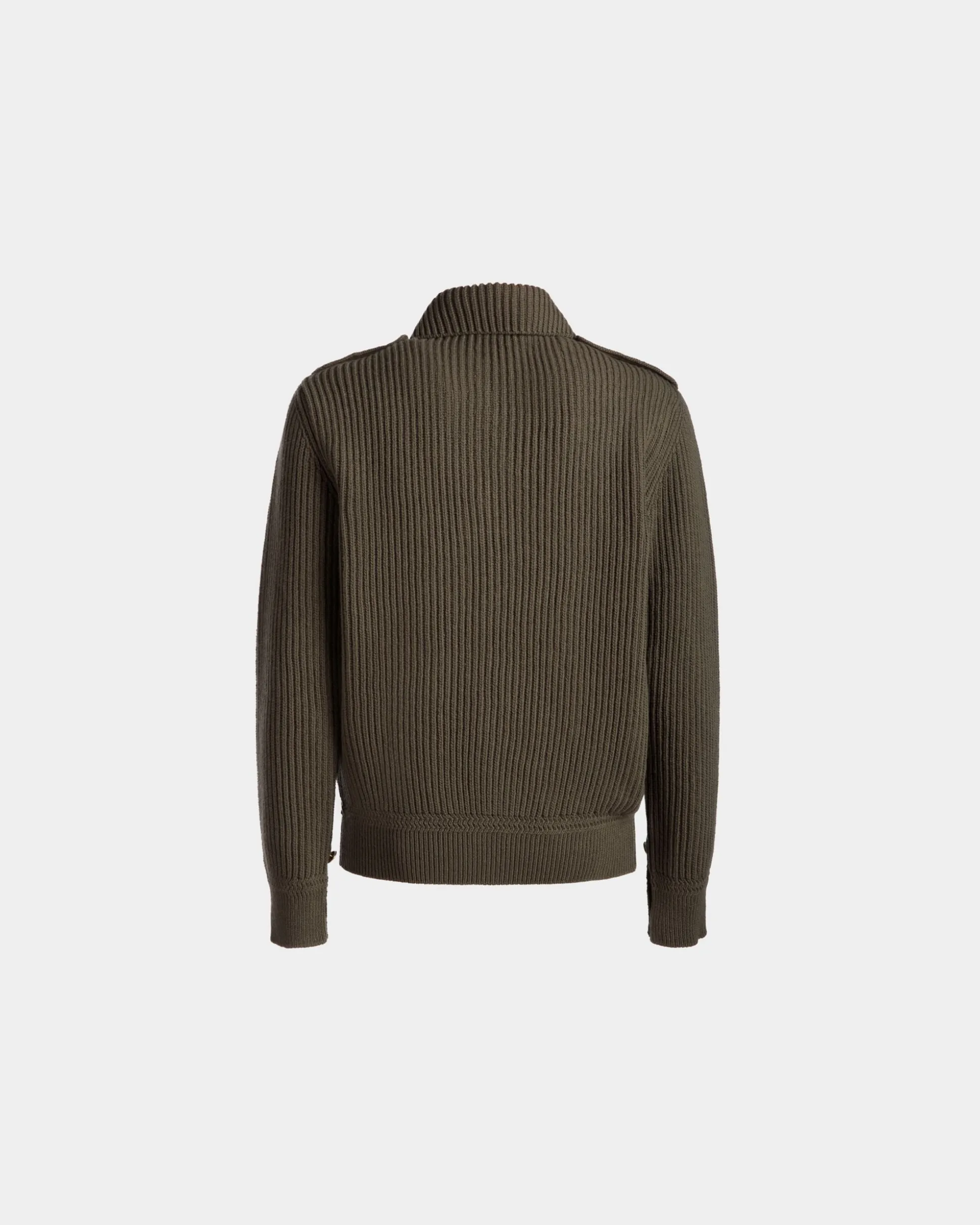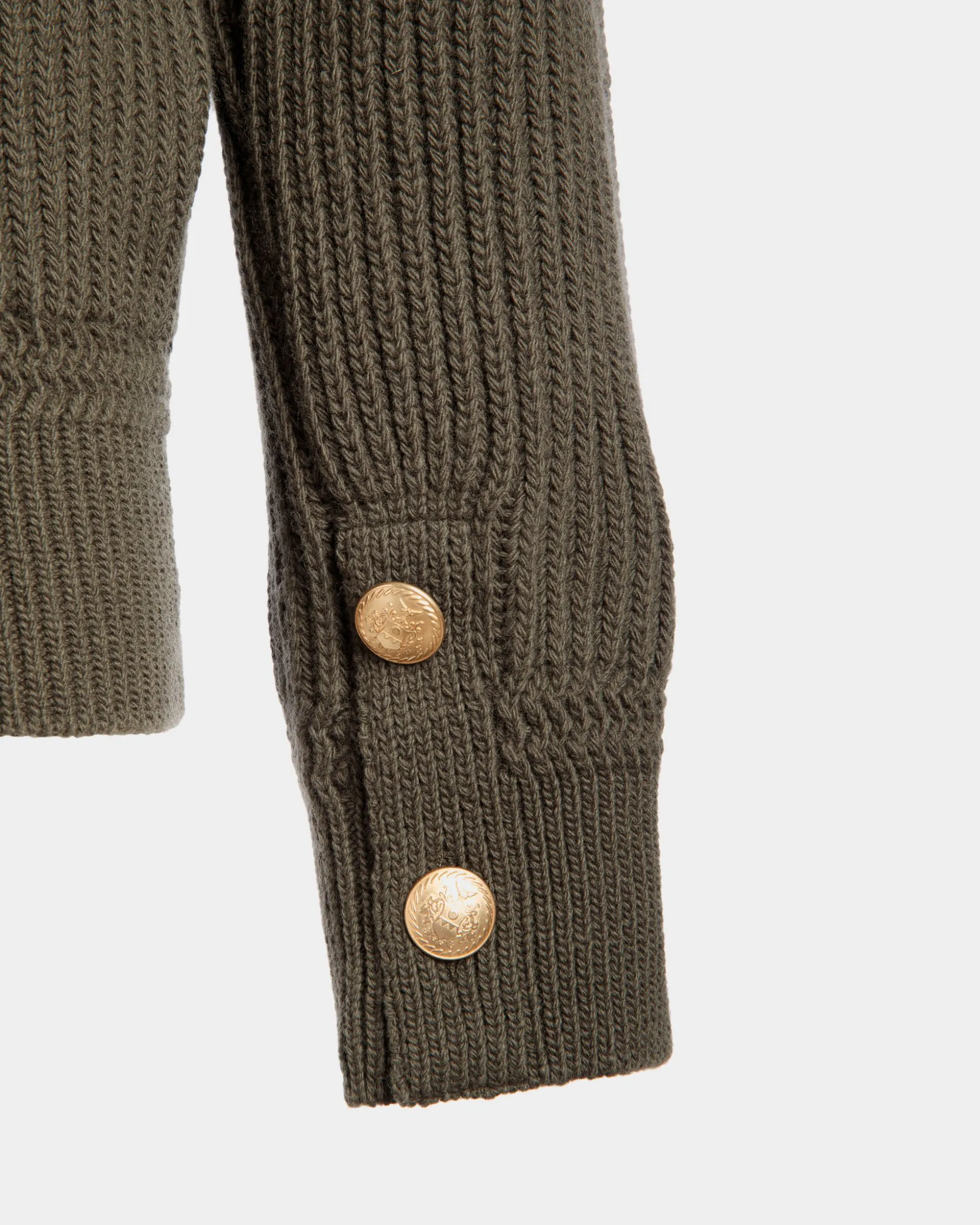 This rib-knit cardigan from the Adrien Brody Travel Collection is fashioned from military green wool. Gold-tone buttons, epaulettes and an embroidered Bally Crest patch give it a utilitarian note.