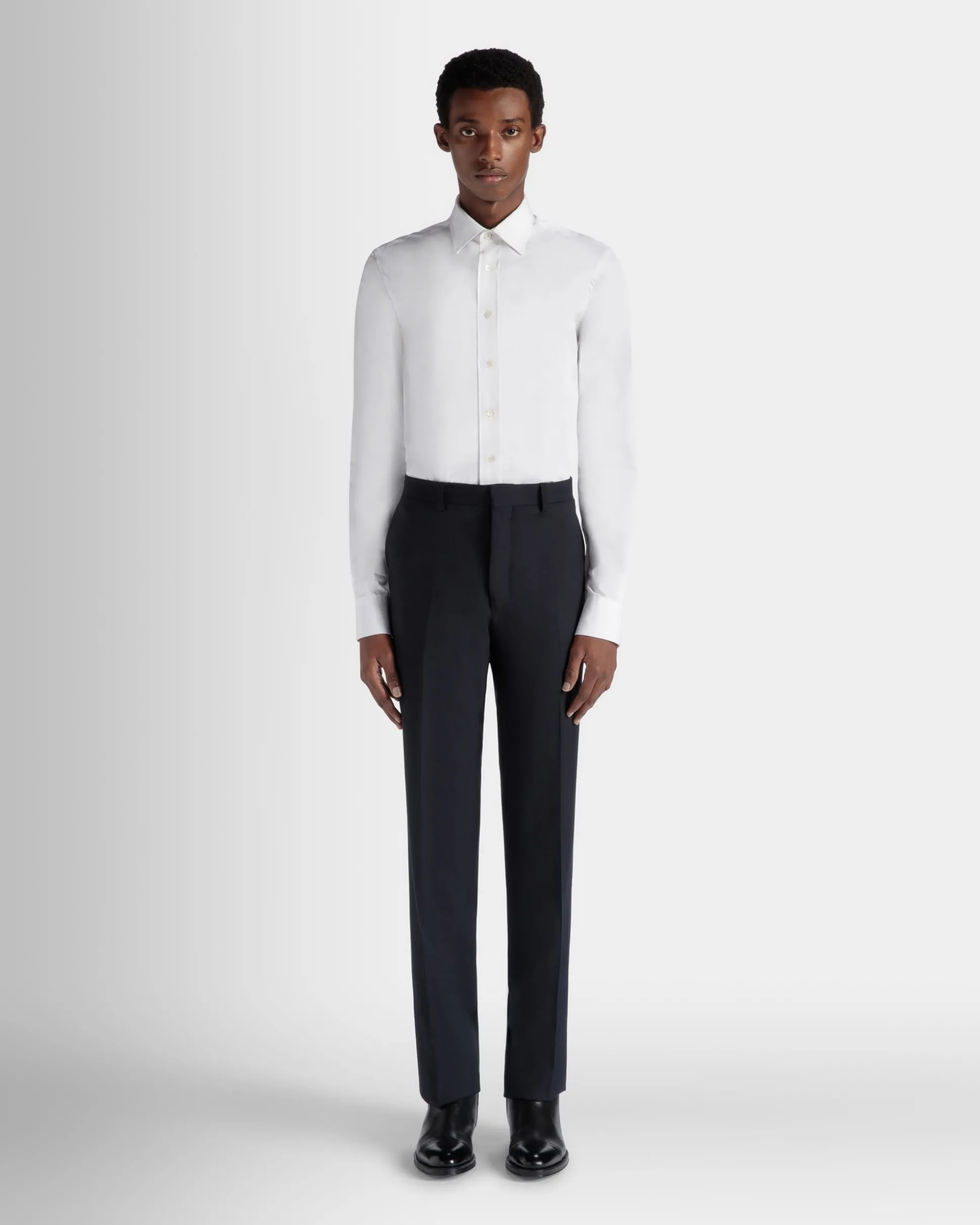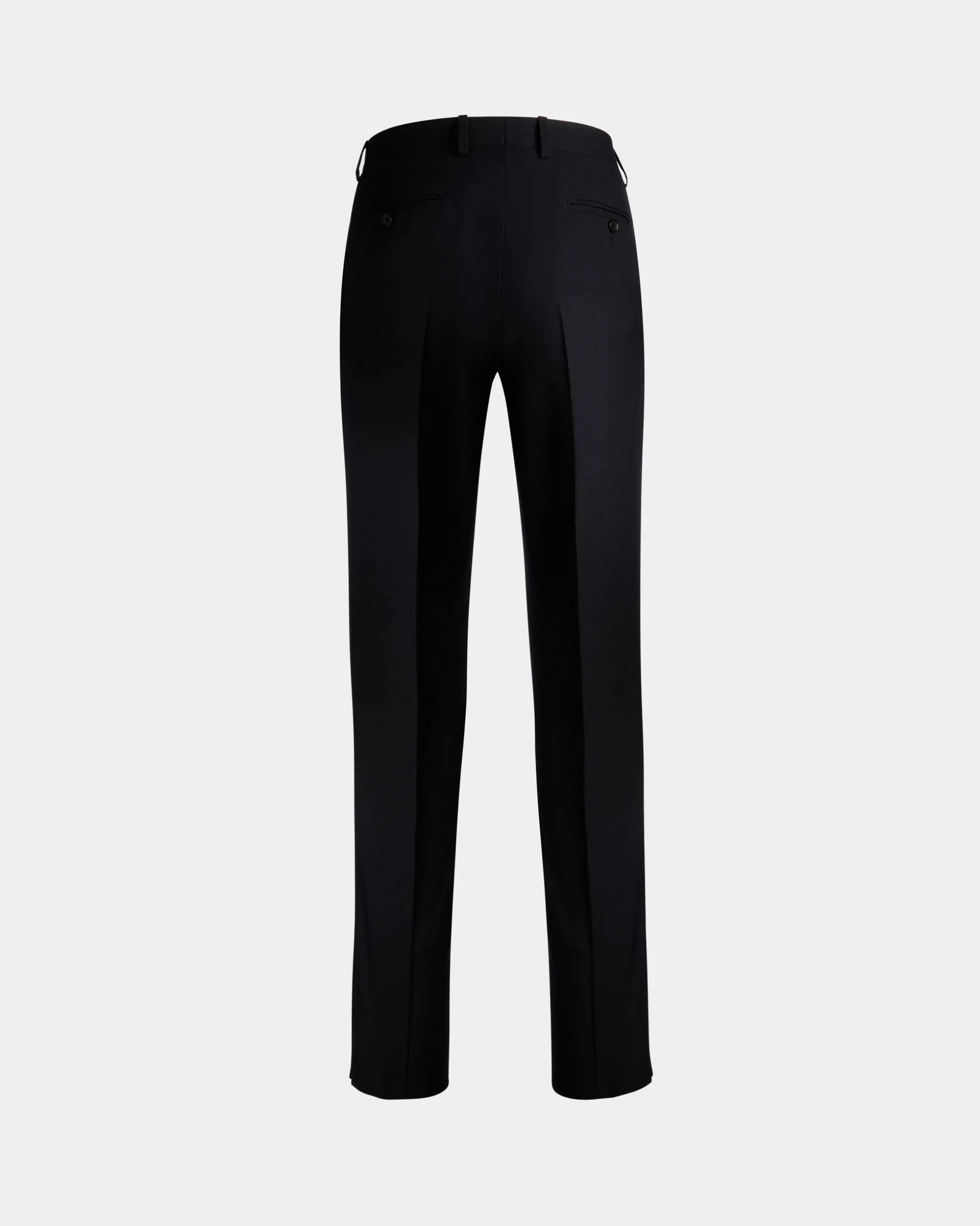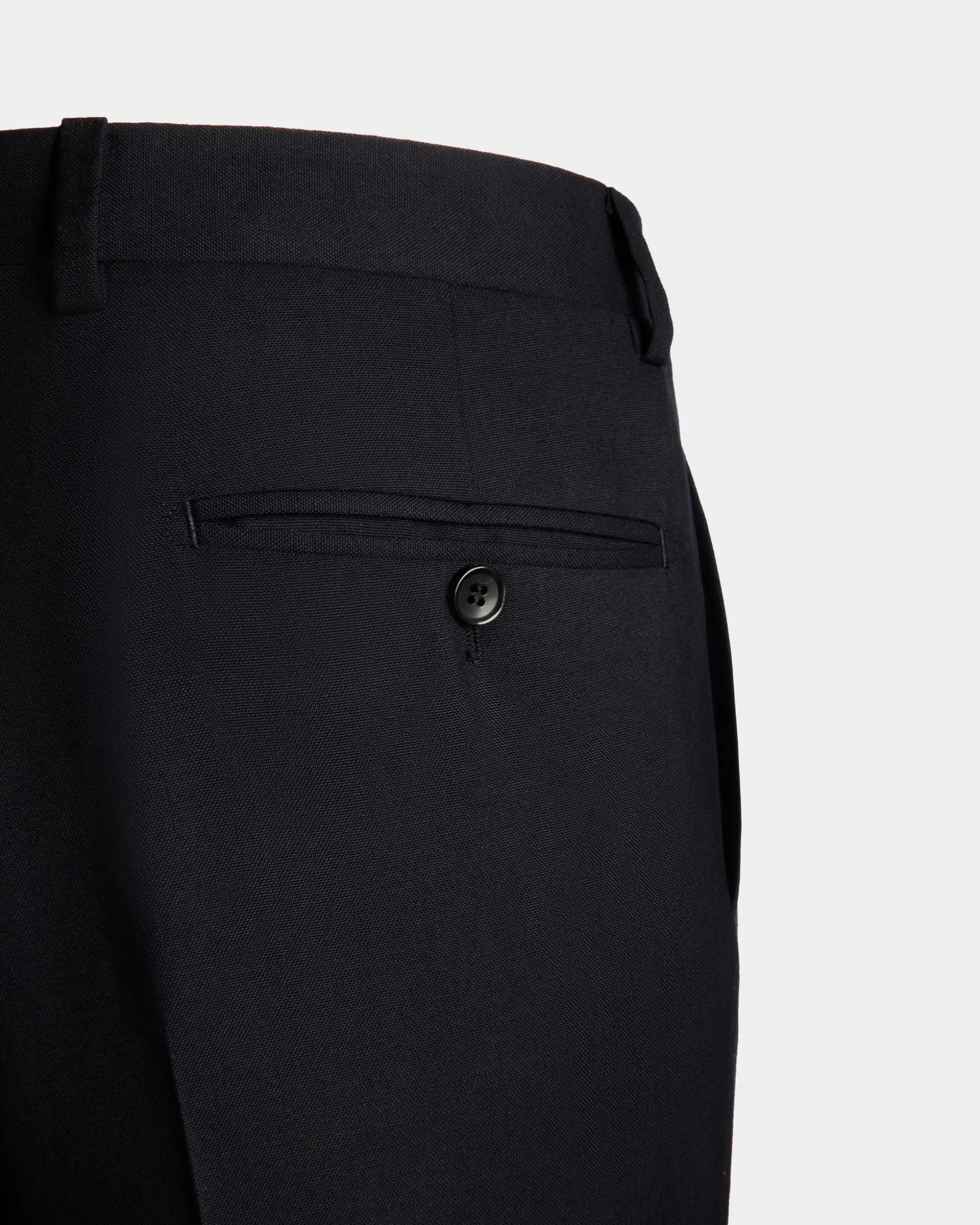 Pin-tucks which extend into central creases define these navy blue wool pants from the Adrien Brody Travel Collection. Double welt and button rear pockets and hip pockets guarantee their practical nature.