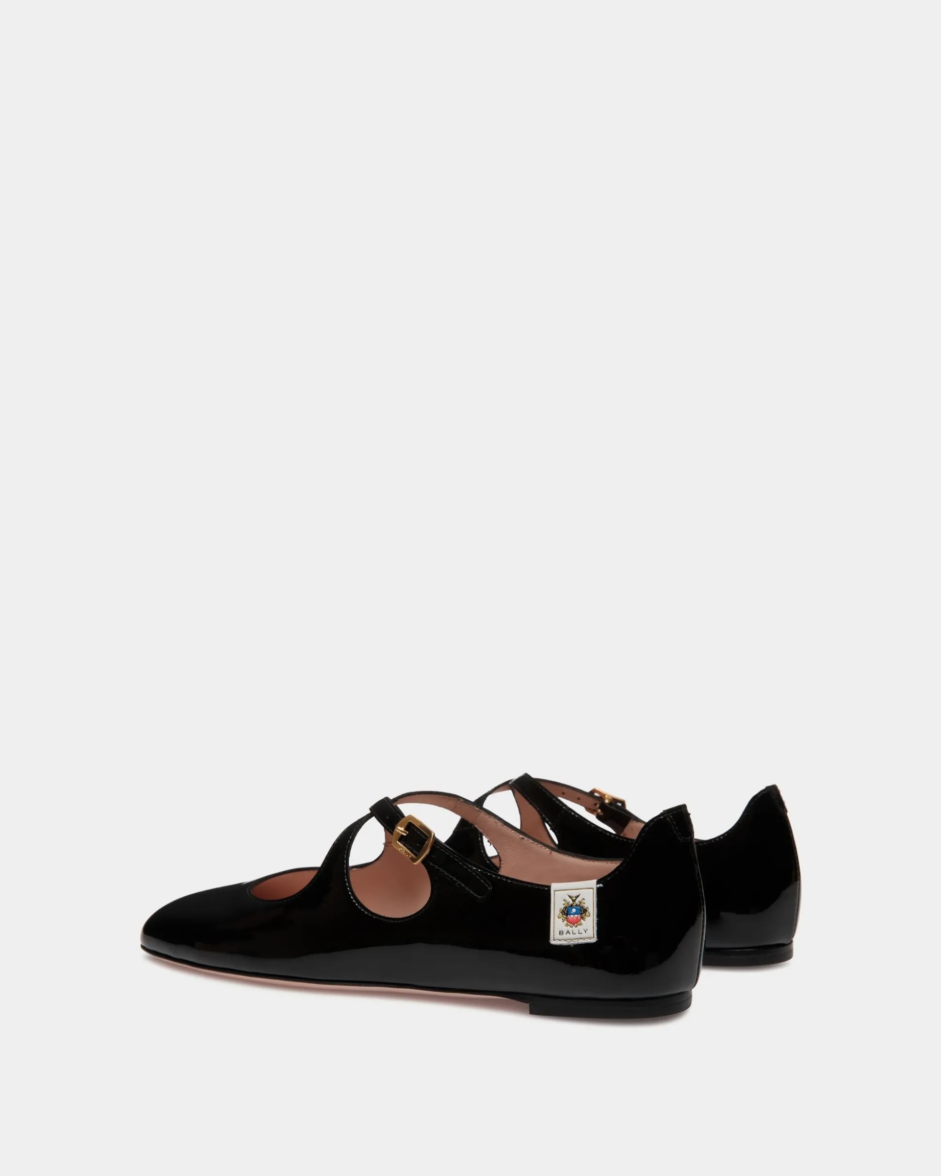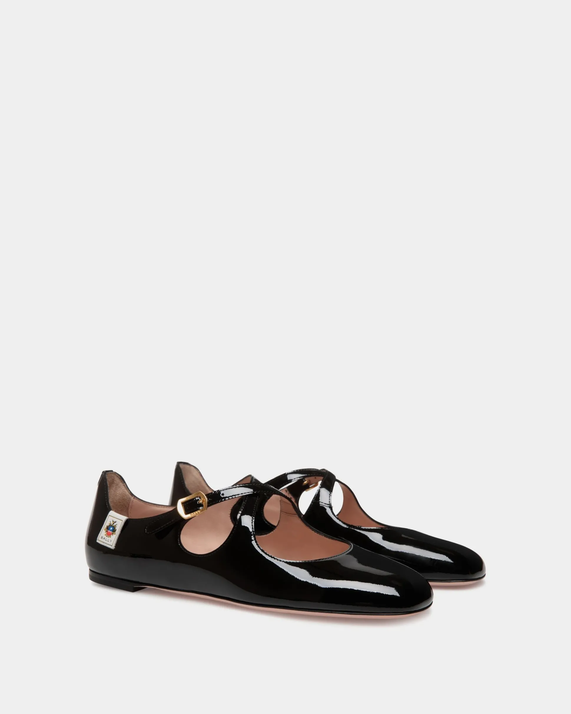 Crafted with precision, this Mary Jane ballerina with criss-cross straps is in black patent leather, finished with a Bally Crest label at the ankle.