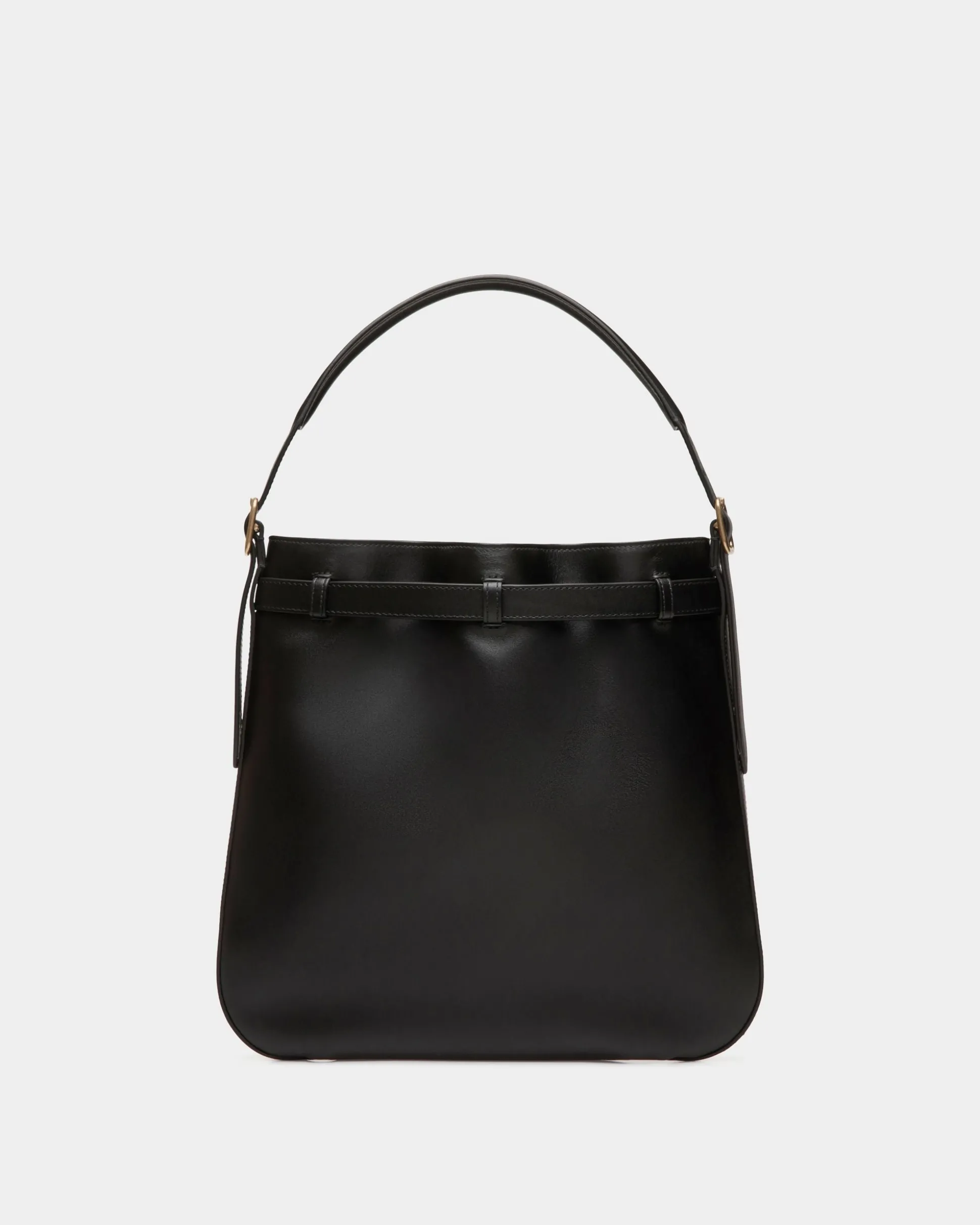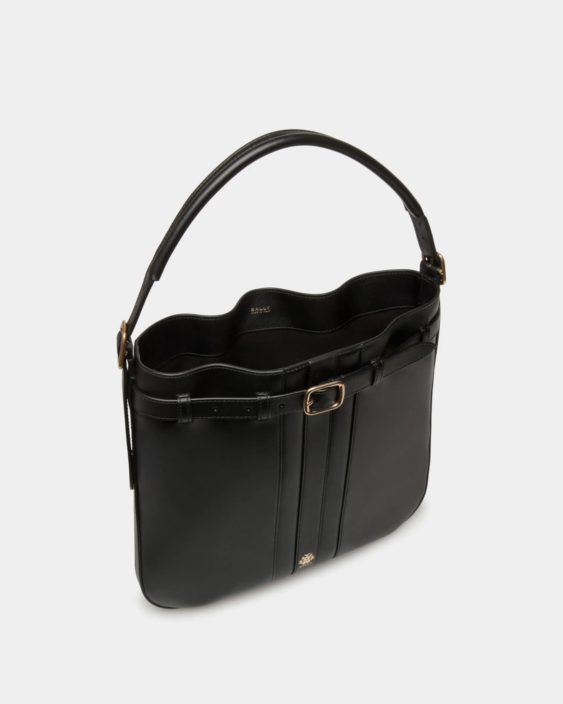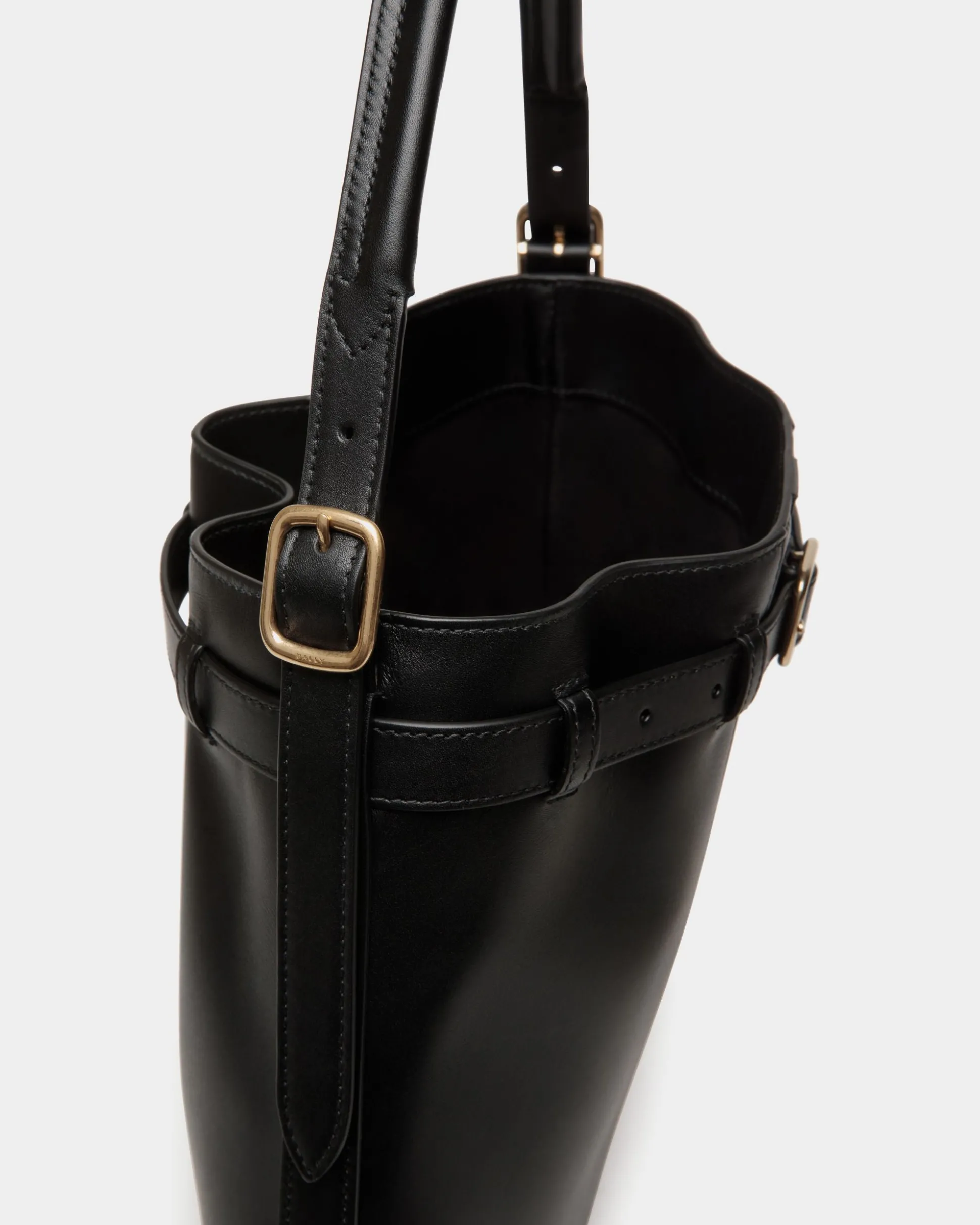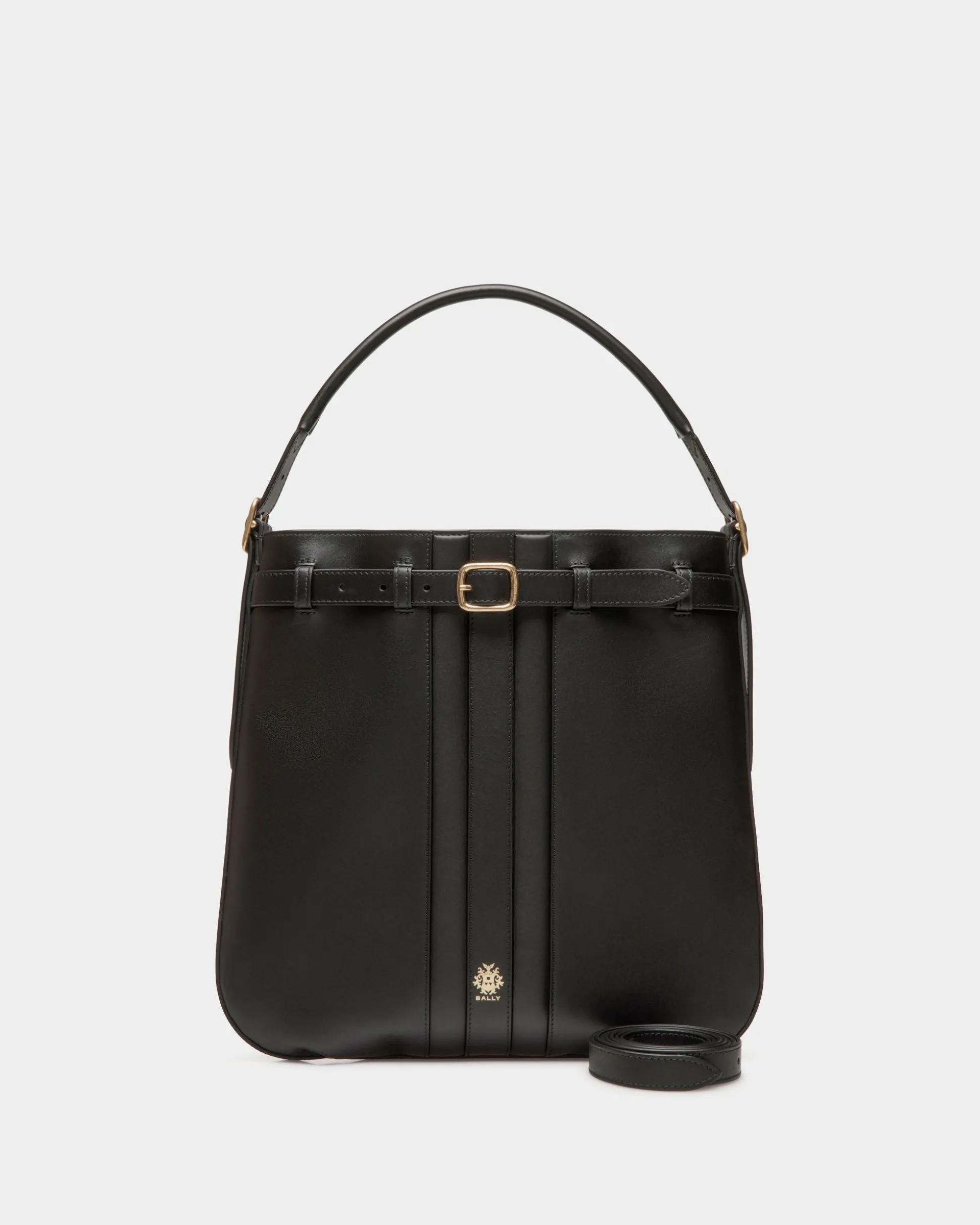 Featured in the FW24 Bally fashion show, this Beckett crossbody bag in black calfskin has an adjustable strap secured by a gold-tone metal buckle. An inlay Ribbon and a foil Crest represent Bally signifiers.