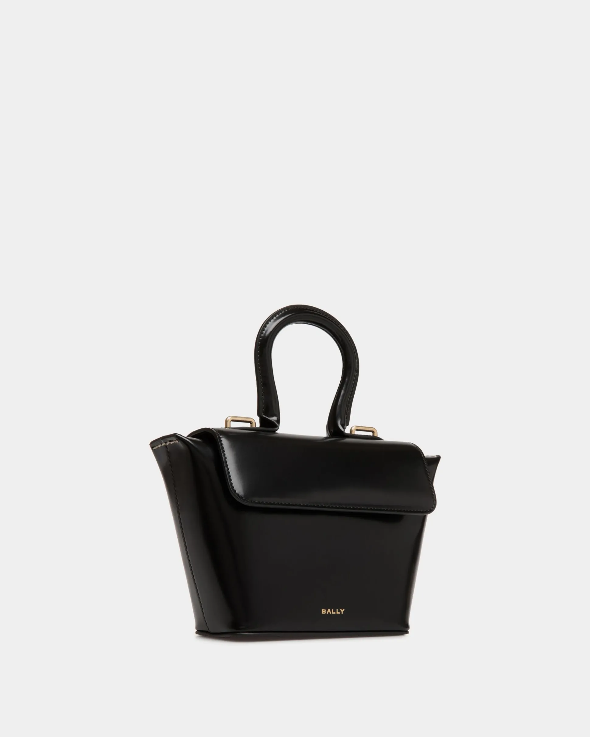 Seen on the Bally FW24 runway, the Belle minibag is crafted in black brushed calfskin. Essential gold-tone metal hardware and contrast topstitching at the sides complement its compact, unique silhouette.