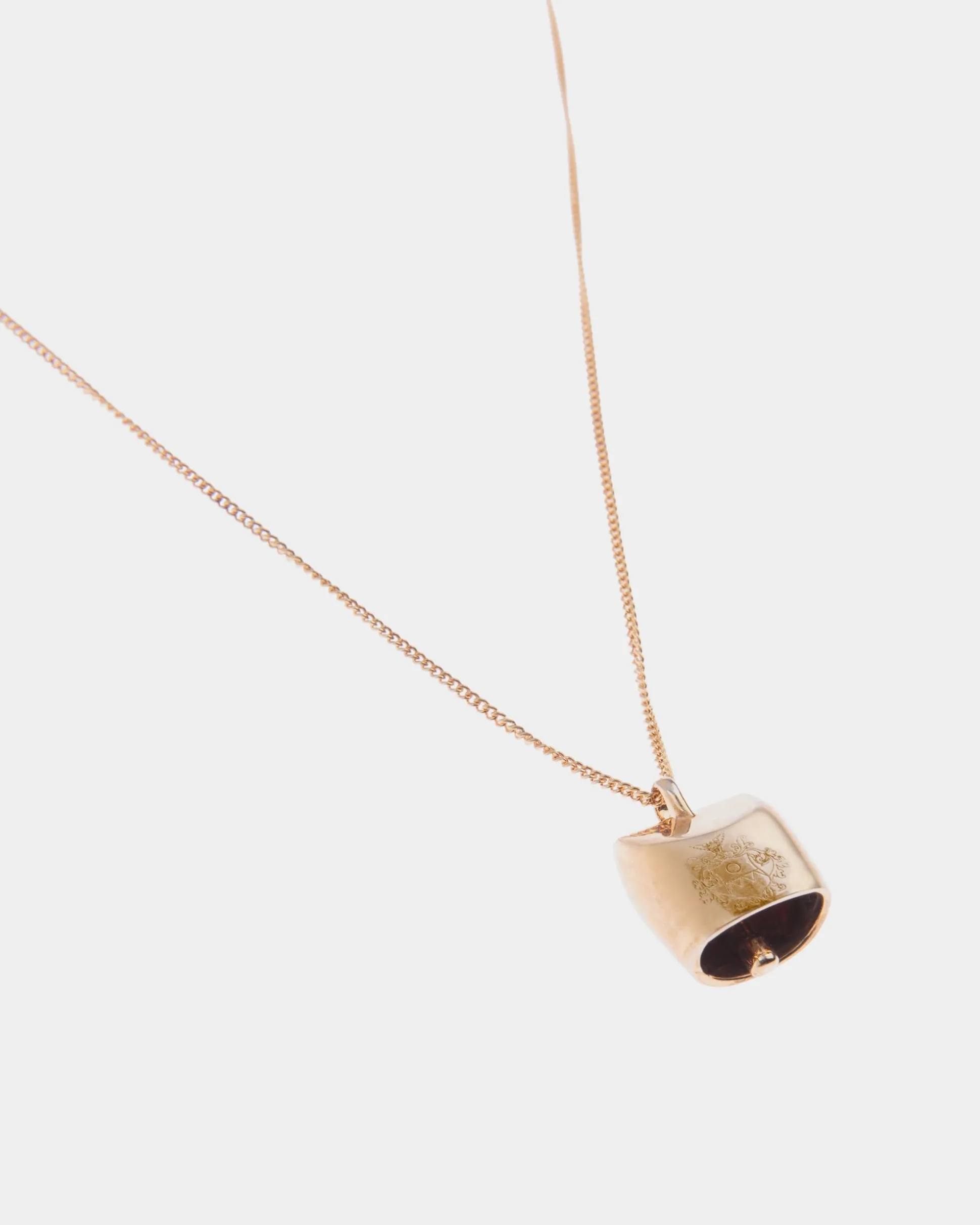 Belle necklace crafted from gold-tone eco brass, with a small Bally Crest engraved on the front of the charm. This exquisite piece brings Swiss lore and Alpine heritage to modern wardrobes.