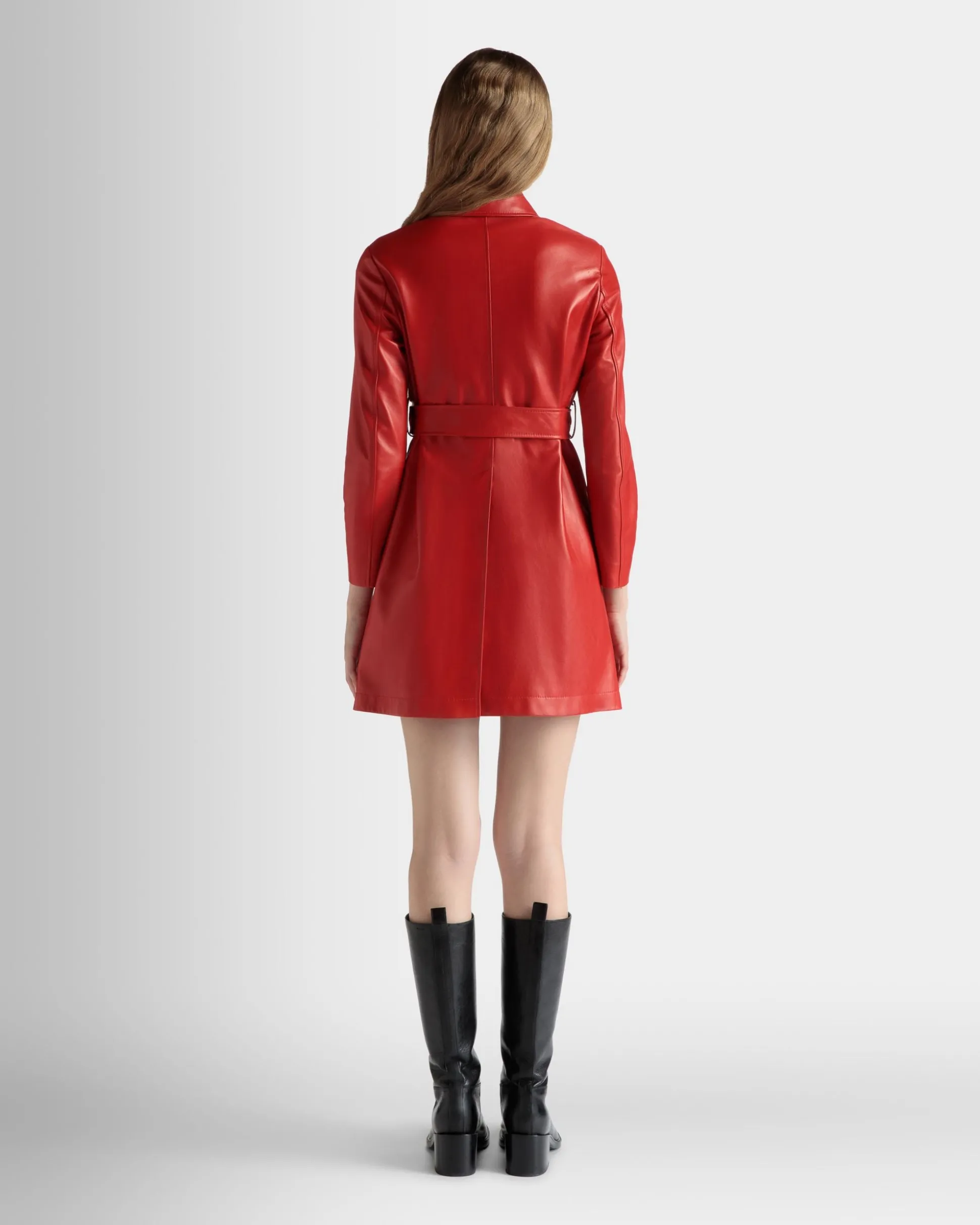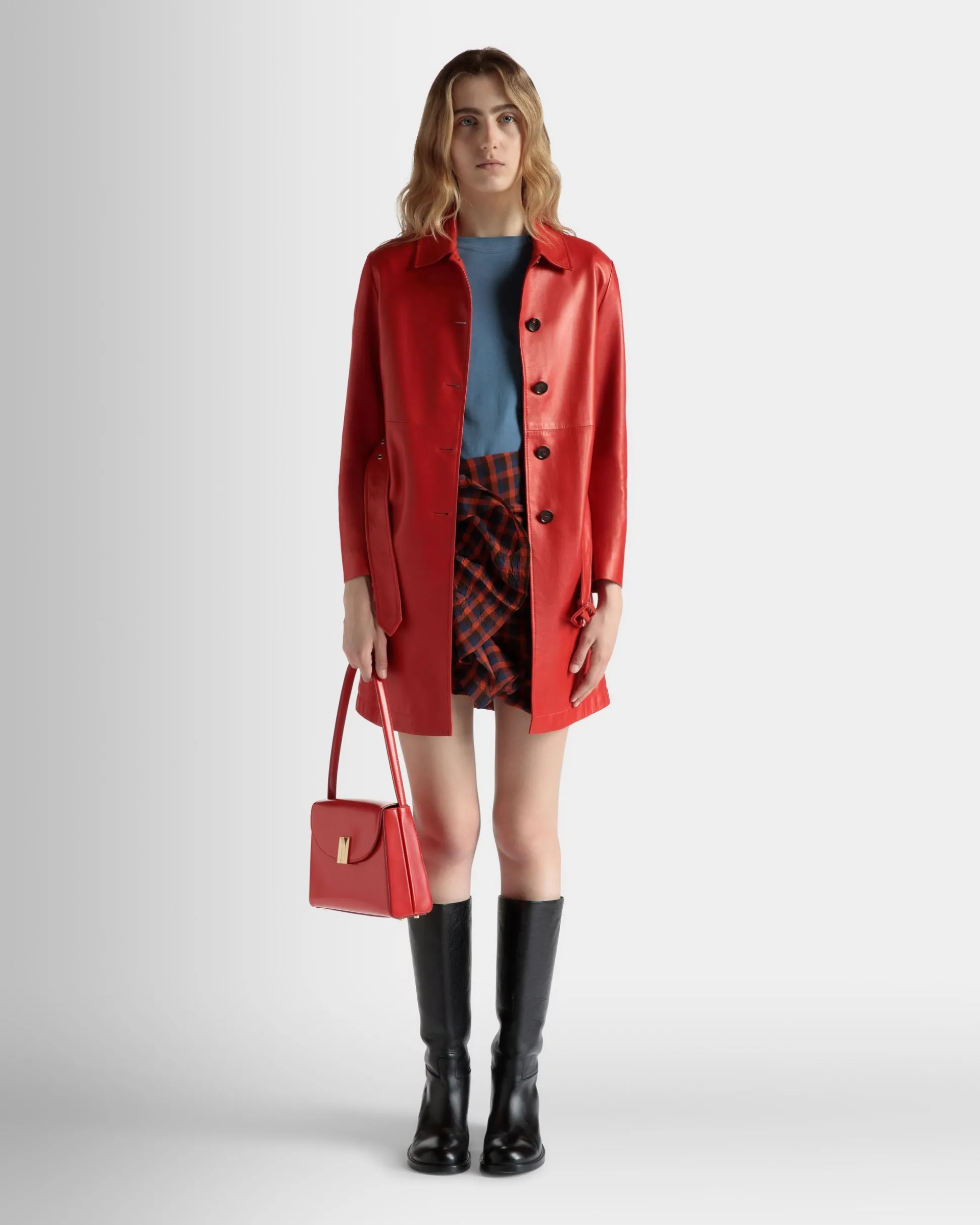 Candy Red leather midi coat with a matching belt to shape the silhouette. Crafted from luxurious nappa lambskin, it offers a supple handfeel which expresses the true potential of the material. Large horn buttons fasten the front.