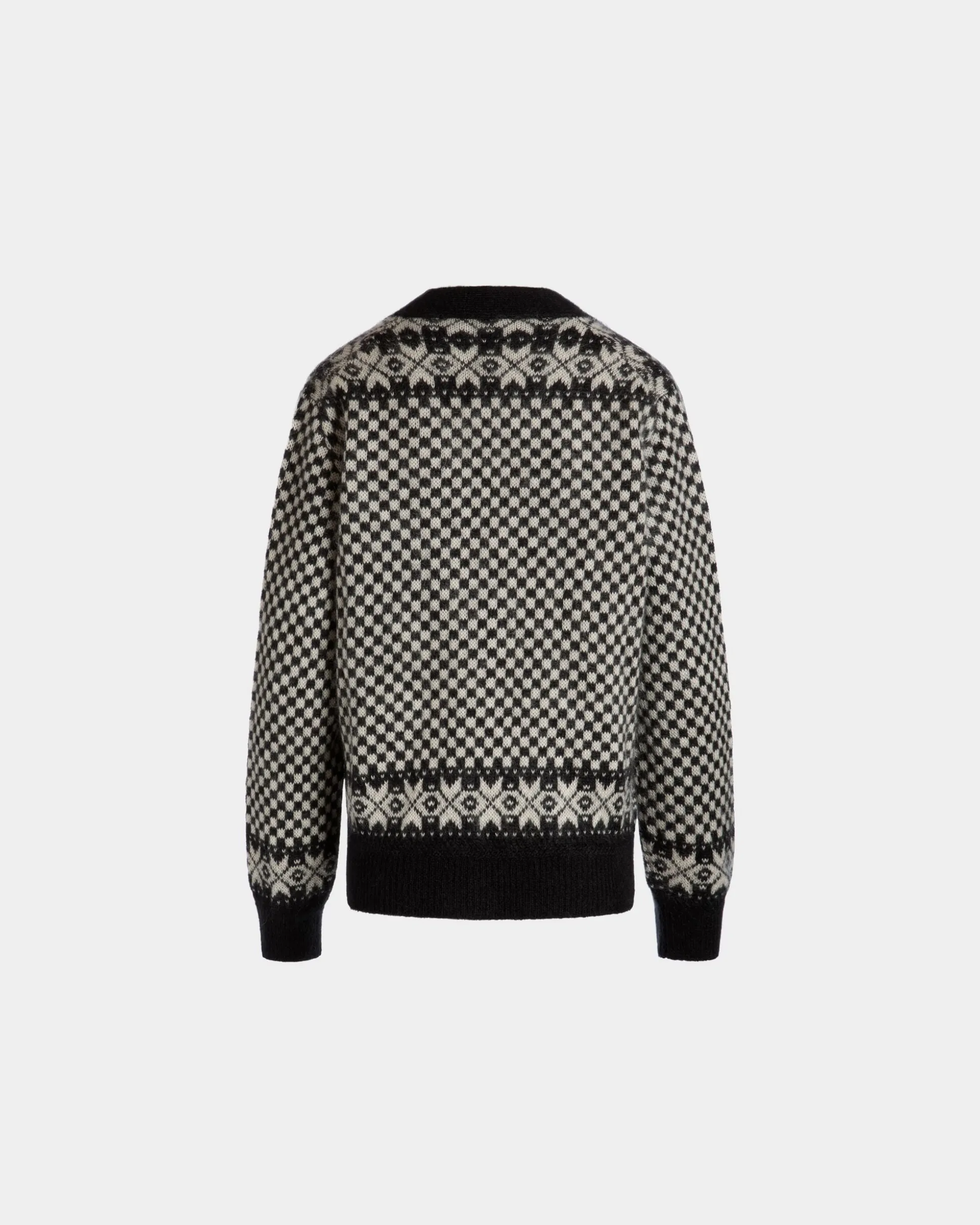 This soft mohair and silk cardigan is enlivened by different jacquard-knit geometric and checkerboard motifs in black and white. The front is fastened by mother-of-pearl Bally buttons.