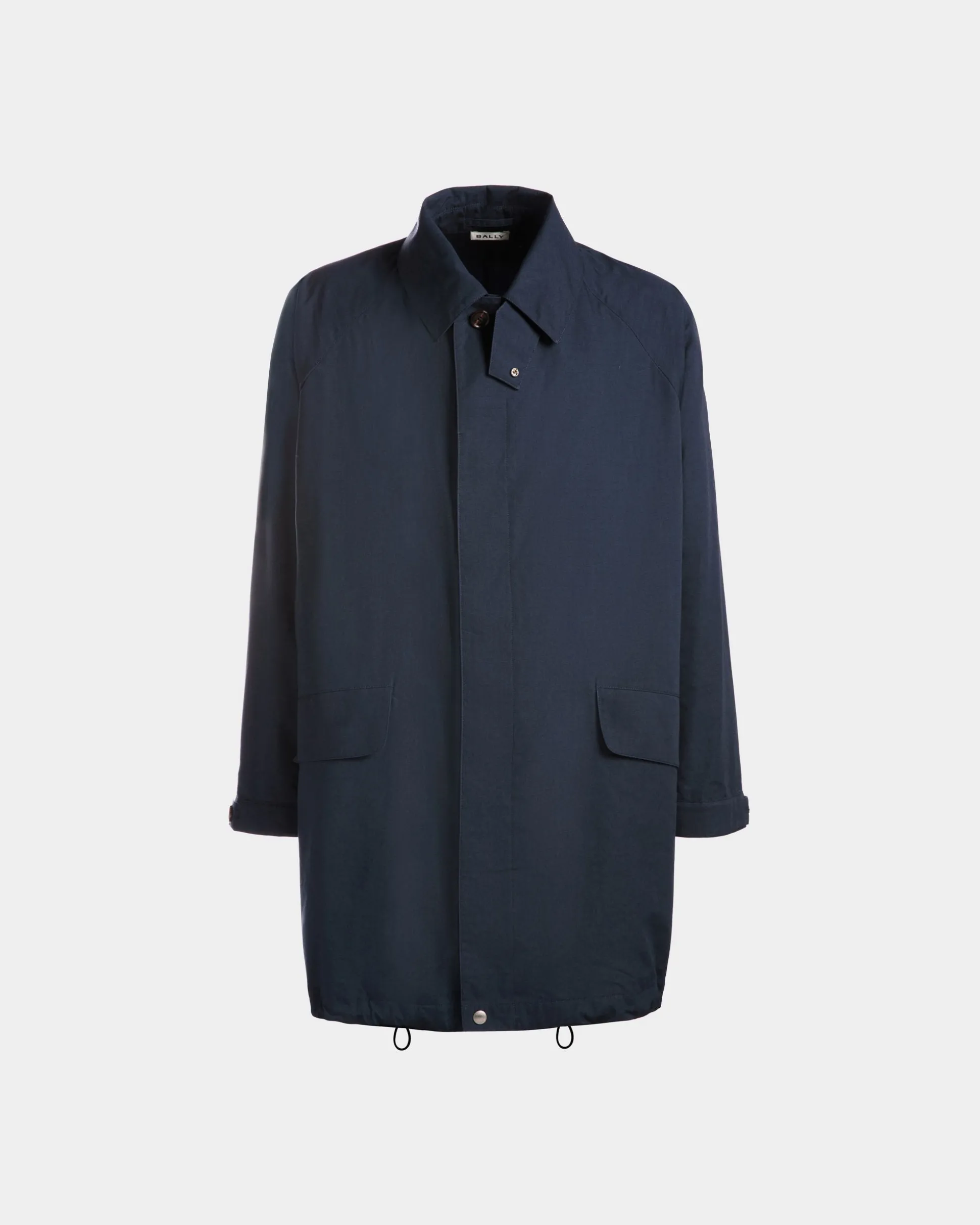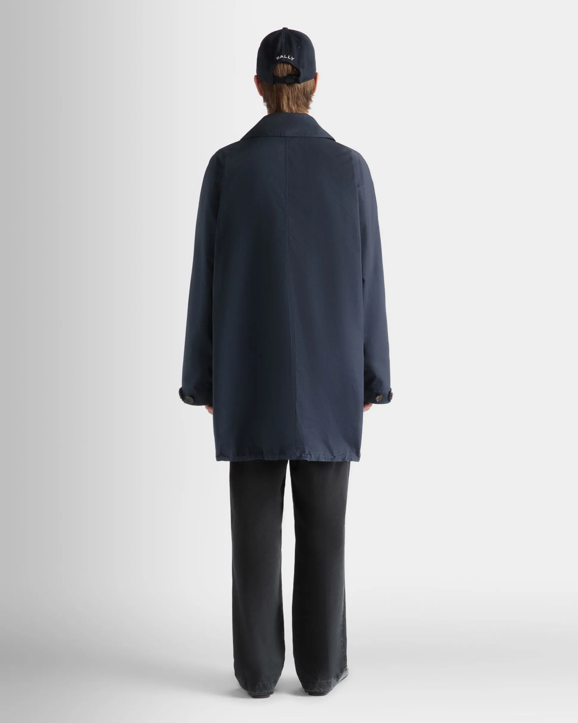In navy blue nylon, this jacket features an elasticated drawstring which runs along the lower hem. It also features a tab under the collar and a covered placket.