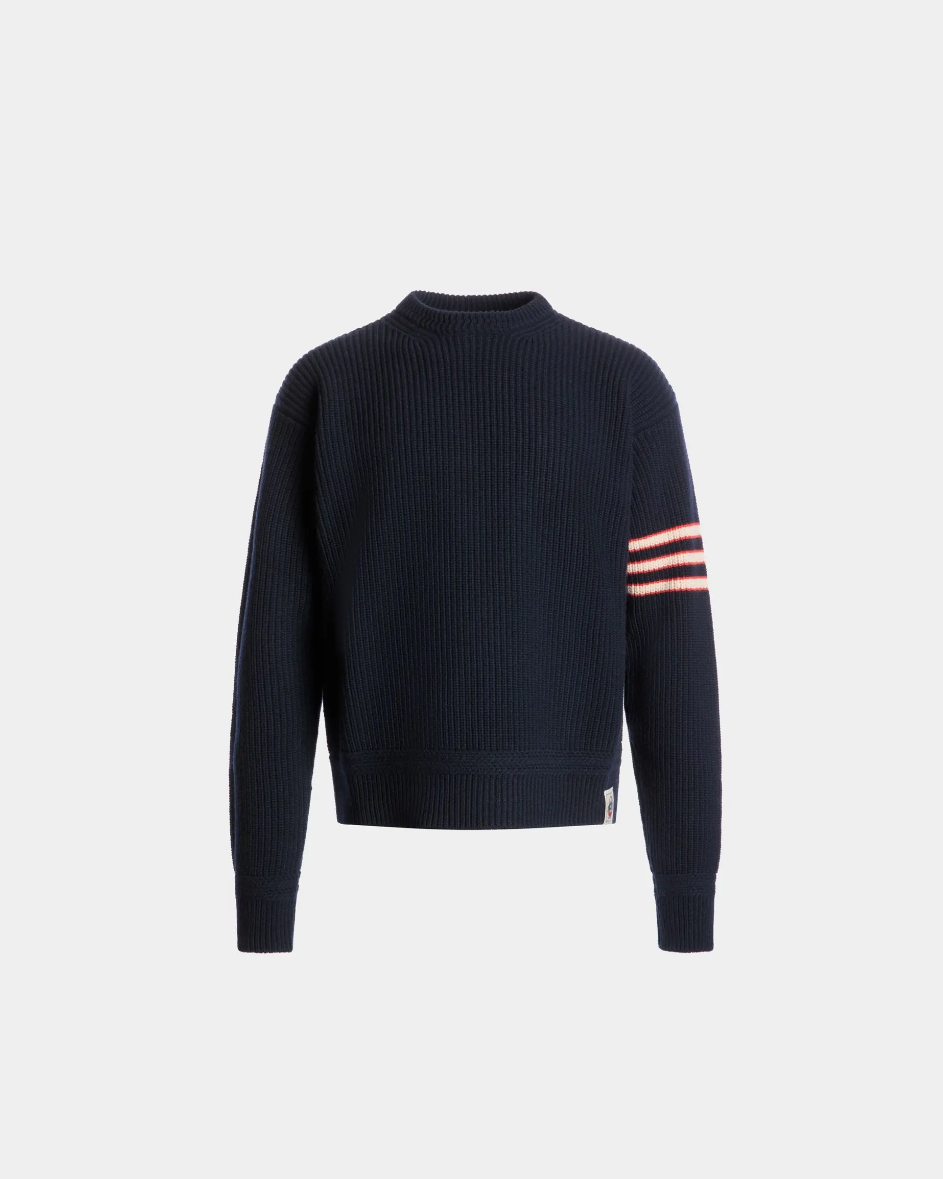 Timeless and versatile, this crewneck sweater in navy blue wool has a Bally Crest label on the hemline and a red and white Ribbon motif on one of the long sleeves.