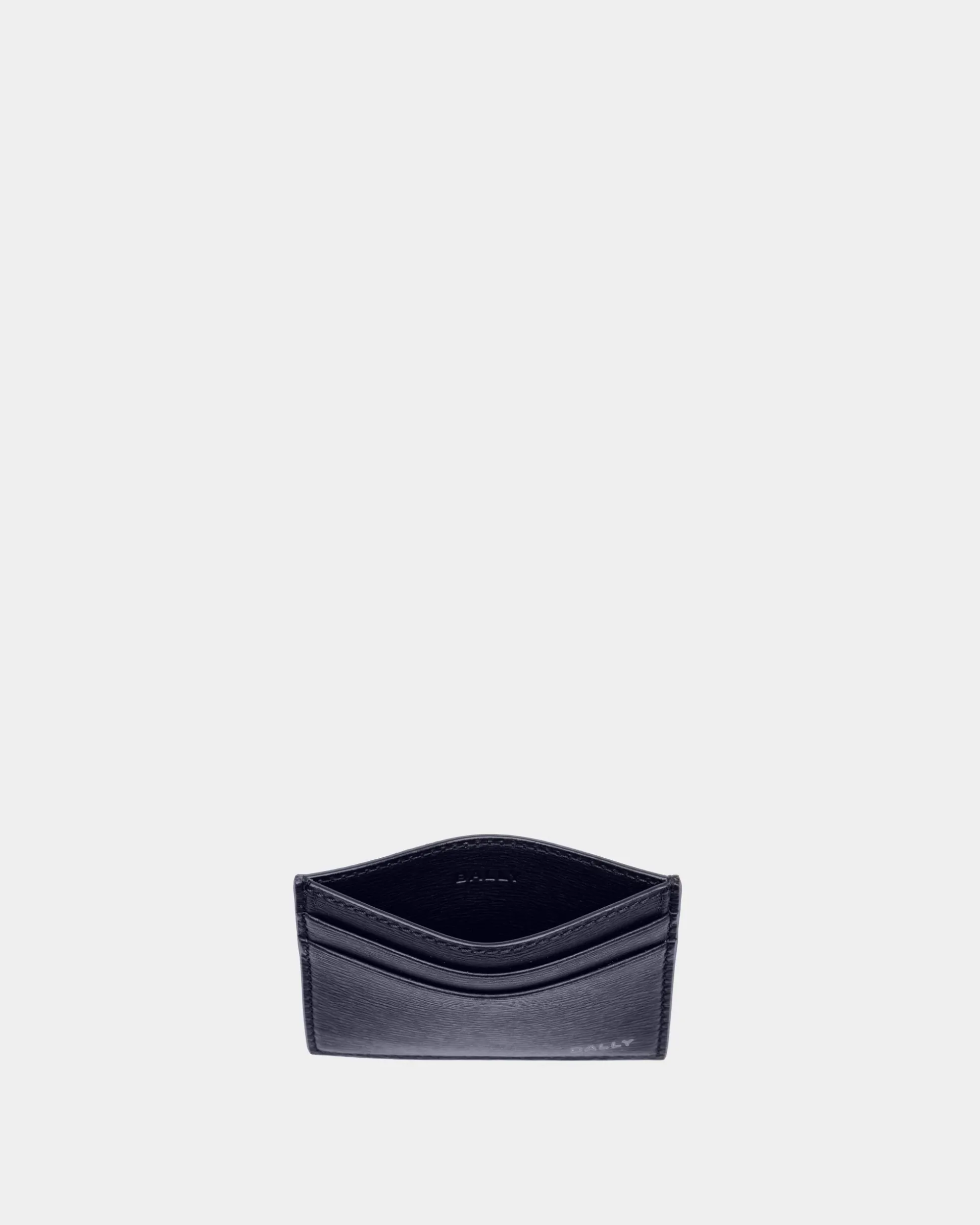 This Crossing card holder in midnight leather is embellished by textural embossing and trimmed by a silver foil Bally logo on one side.